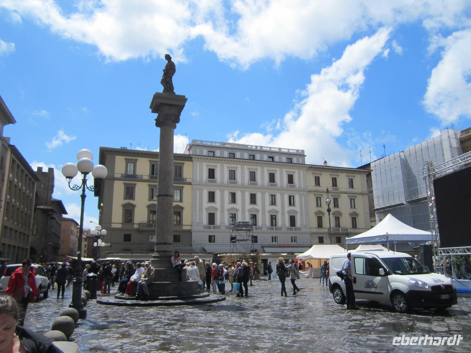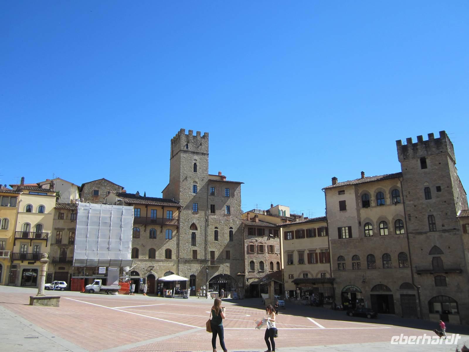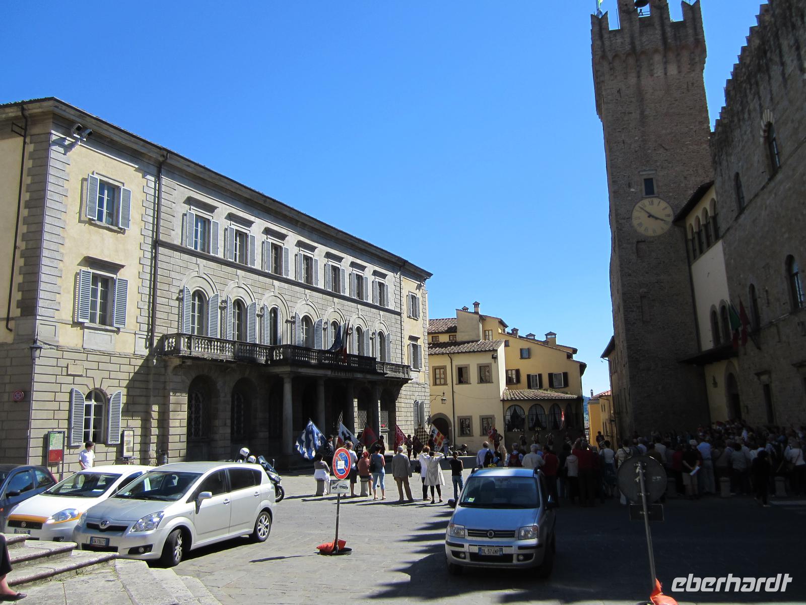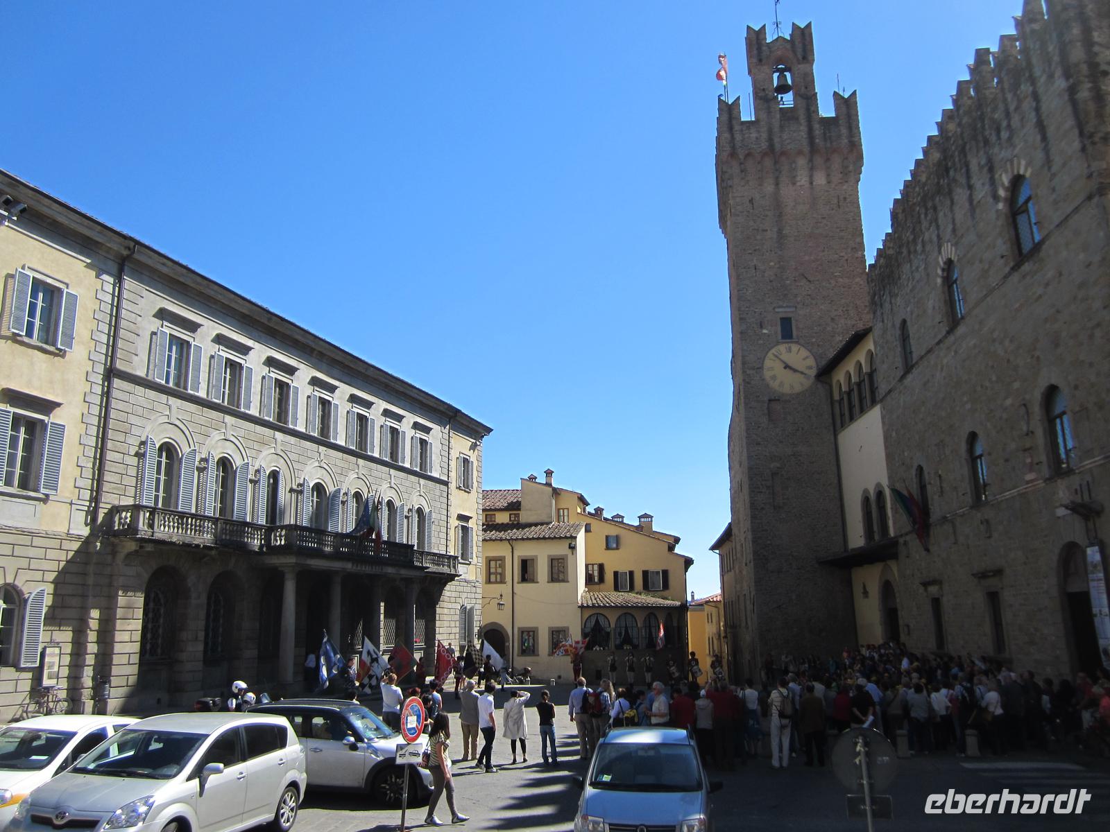 ans Gardaseeufer nach Torbole hinuntergerollt. Welch eine Leistung. Wir fahren bei Rovereto wieder auf Autobahn A22 (Brennerautobahn) an Verona vorbei. Danach durchqueren wir die Po-Ebene. Vor Modena geraten wir in einen Stau, der uns viel Zeit kostet. Danach führt uns unser Weg auf der A1 bis Bologna. Landschaftlich ausgesprochen interessant wird es bei der Überquerung der Apenninen. Die Landschaft und auch der Straßenbau lassen bei der Fahrt keine Langeweile aufkommen. Danach haben wir einen Blick auf Florenz. Die gewaltige Domkuppel sehen wir bereits auf unserer Fahrt nach Arezzo. Florenz, die Hauptstadt der Toskana haben wir zu einem späteren Zeitpunkt auf den Programm. Heute besichtigen wir unsere erste Stadt in der Toskana, Arezzo, eine der alten Etruskerstädte, die ca. 80 km südlich von Florenz liegt und ein Juwel der mittelalterlichen Architektur und das Zentrum der der italienischen Goldschmiedeindustrie ist. Bekannt ist die Stadt auch für den auf dem Piazza Grande stattfinden Anitquitätenmarkt. Heute findet er nicht statt und wir haben den Piazza Grande für uns. Bei der Musik die wir von der Musikschule hören haben wir Zeit für ein leckeres italienisches Eis zu probieren.