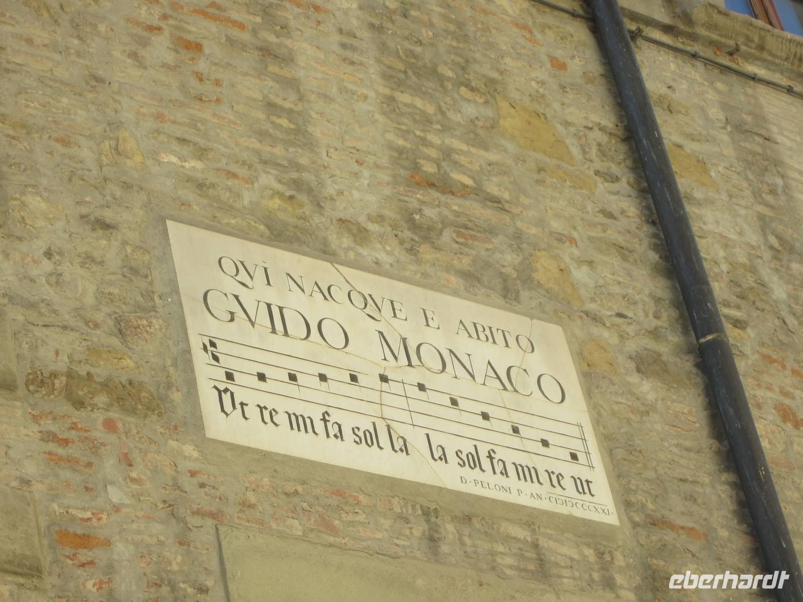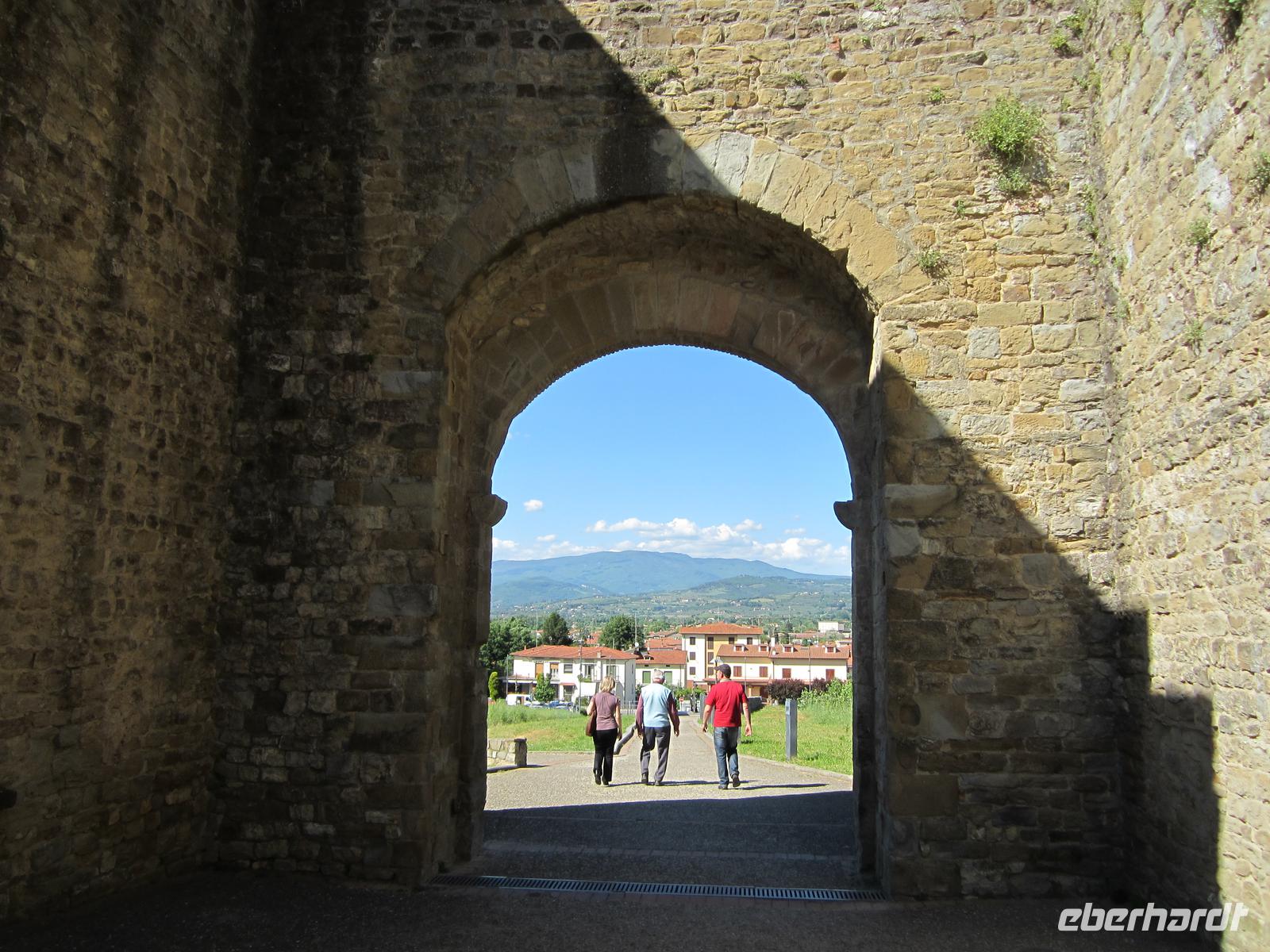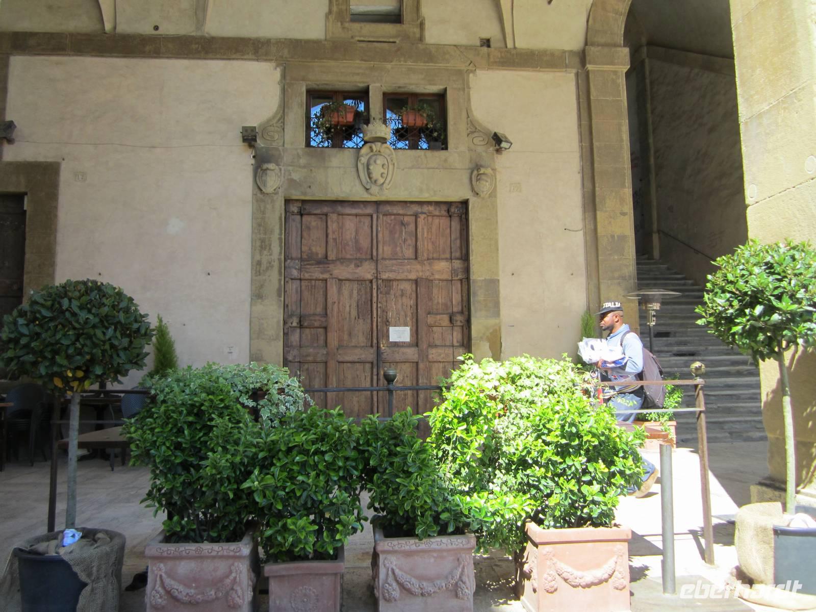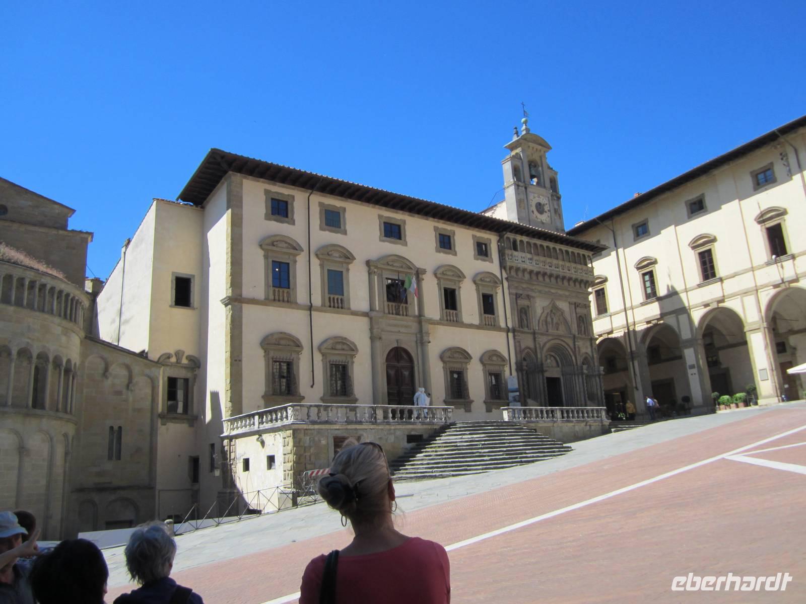 ans Gardaseeufer nach Torbole hinuntergerollt. Welch eine Leistung. Wir fahren bei Rovereto wieder auf Autobahn A22 (Brennerautobahn) an Verona vorbei. Danach durchqueren wir die Po-Ebene. Vor Modena geraten wir in einen Stau, der uns viel Zeit kostet. Danach führt uns unser Weg auf der A1 bis Bologna. Landschaftlich ausgesprochen interessant wird es bei der Überquerung der Apenninen. Die Landschaft und auch der Straßenbau lassen bei der Fahrt keine Langeweile aufkommen. Danach haben wir einen Blick auf Florenz. Die gewaltige Domkuppel sehen wir bereits auf unserer Fahrt nach Arezzo. Florenz, die Hauptstadt der Toskana haben wir zu einem späteren Zeitpunkt auf den Programm. Heute besichtigen wir unsere erste Stadt in der Toskana, Arezzo, eine der alten Etruskerstädte, die ca. 80 km südlich von Florenz liegt und ein Juwel der mittelalterlichen Architektur und das Zentrum der der italienischen Goldschmiedeindustrie ist. Bekannt ist die Stadt auch für den auf dem Piazza Grande stattfinden Anitquitätenmarkt. Heute findet er nicht statt und wir haben den Piazza Grande für uns. Bei der Musik die wir von der Musikschule hören haben wir Zeit für ein leckeres italienisches Eis zu probieren.
