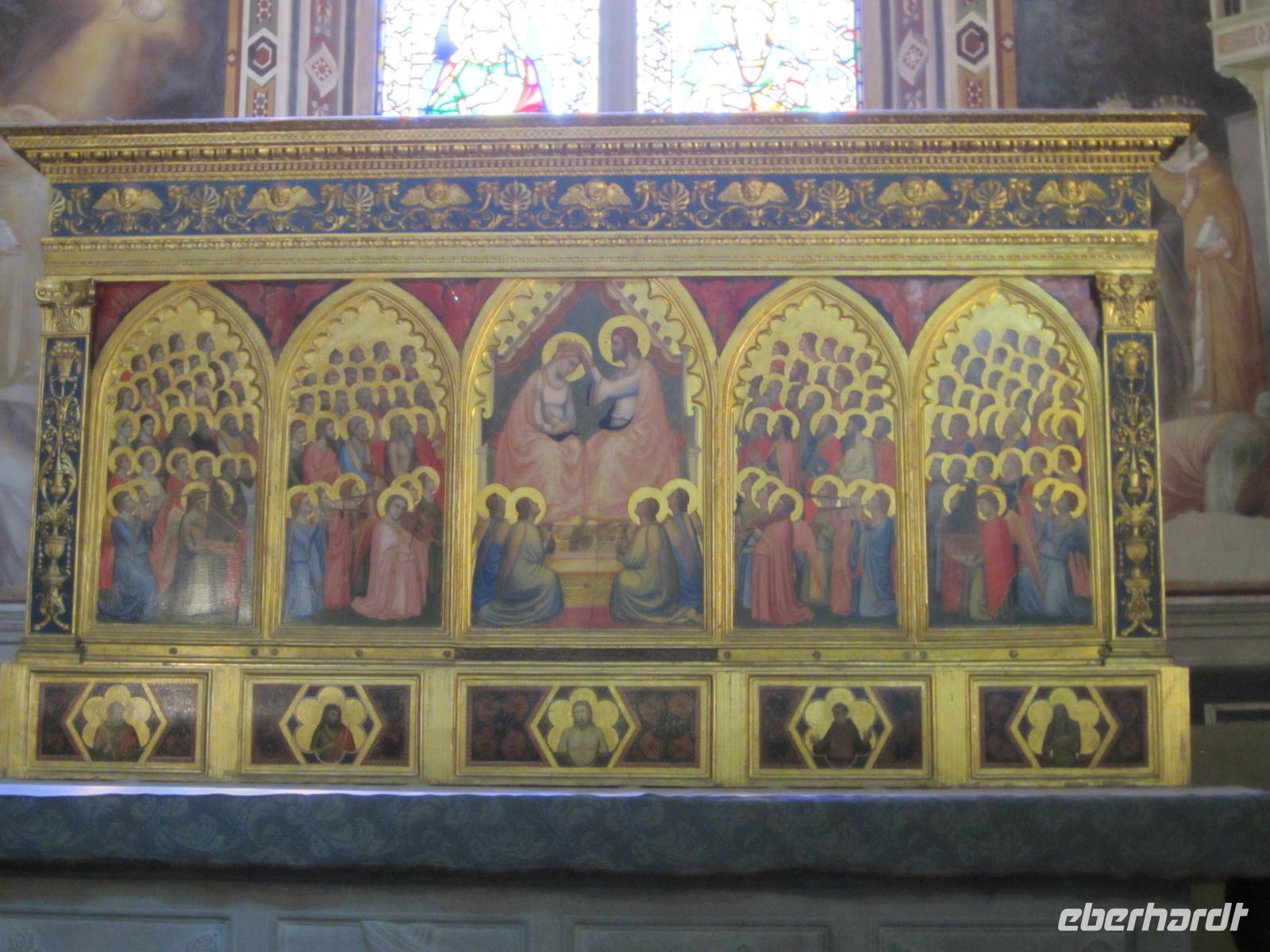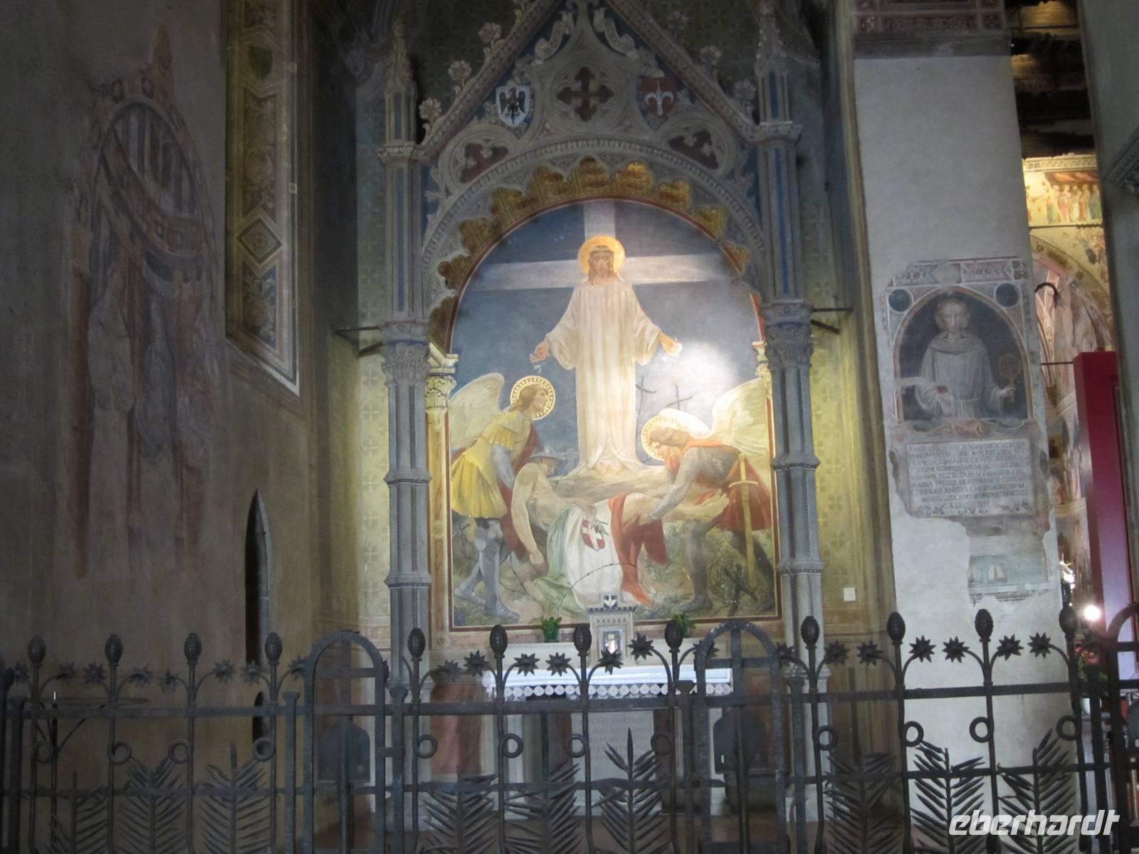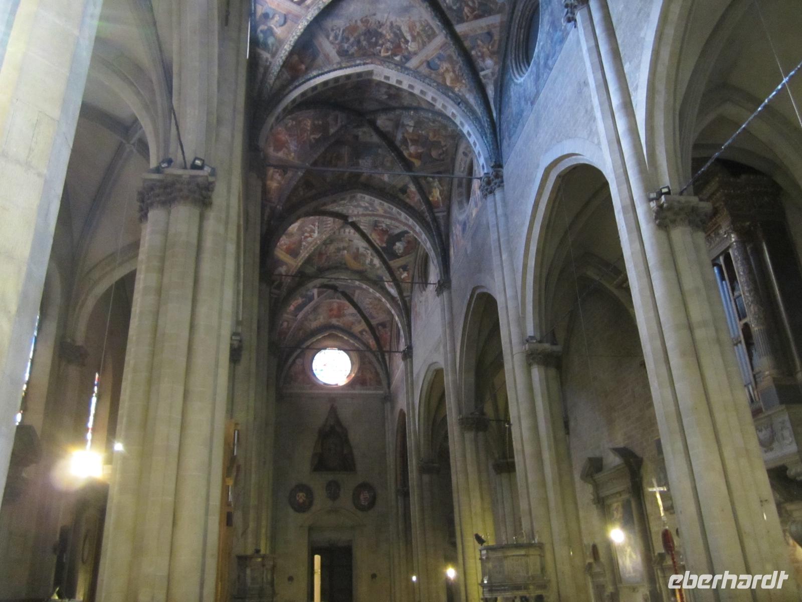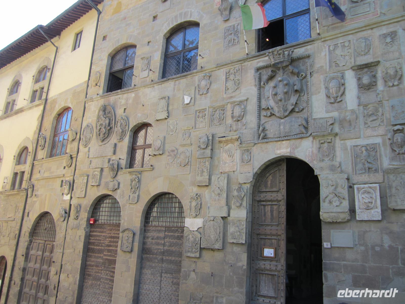 ans Gardaseeufer nach Torbole hinuntergerollt. Welch eine Leistung. Wir fahren bei Rovereto wieder auf Autobahn A22 (Brennerautobahn) an Verona vorbei. Danach durchqueren wir die Po-Ebene. Vor Modena geraten wir in einen Stau, der uns viel Zeit kostet. Danach führt uns unser Weg auf der A1 bis Bologna. Landschaftlich ausgesprochen interessant wird es bei der Überquerung der Apenninen. Die Landschaft und auch der Straßenbau lassen bei der Fahrt keine Langeweile aufkommen. Danach haben wir einen Blick auf Florenz. Die gewaltige Domkuppel sehen wir bereits auf unserer Fahrt nach Arezzo. Florenz, die Hauptstadt der Toskana haben wir zu einem späteren Zeitpunkt auf den Programm. Heute besichtigen wir unsere erste Stadt in der Toskana, Arezzo, eine der alten Etruskerstädte, die ca. 80 km südlich von Florenz liegt und ein Juwel der mittelalterlichen Architektur und das Zentrum der der italienischen Goldschmiedeindustrie ist. Bekannt ist die Stadt auch für den auf dem Piazza Grande stattfinden Anitquitätenmarkt. Heute findet er nicht statt und wir haben den Piazza Grande für uns. Bei der Musik die wir von der Musikschule hören haben wir Zeit für ein leckeres italienisches Eis zu probieren.
