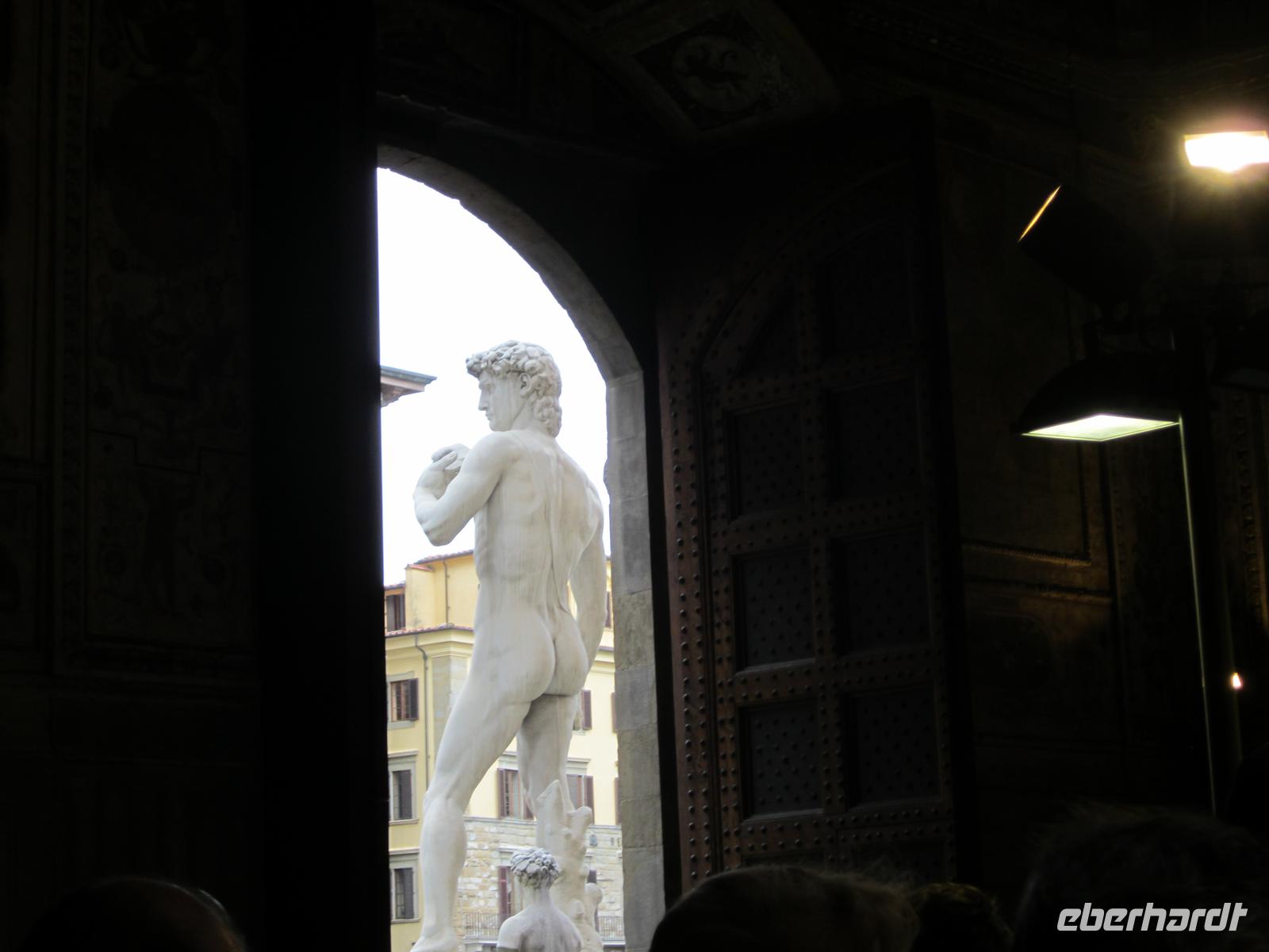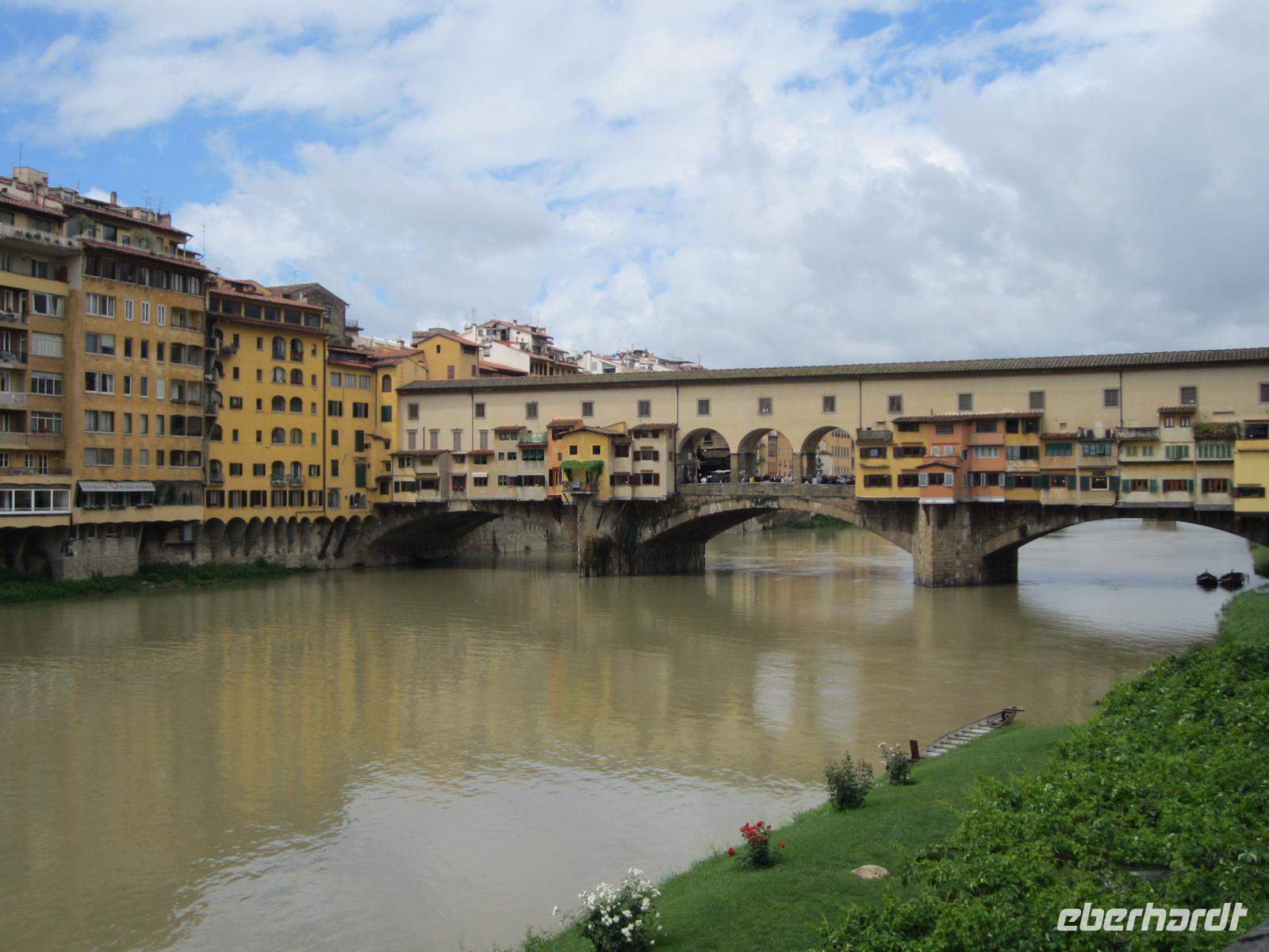 Wir treffen uns mit dem Stadtführer Mathias Feldmann am Zecca Turm und fahren mit dem Bus zum Migelangelo Platz, von hieraus bietet sich ein schöner Blick auf die Stadt. Danach fahren wir mit dem Bus wieder zum Zecca Turm und spazieren entlang des Arno zur Nationalbibliothek, zum Piazza S.Croce, dem Piazza Della Signoria,den Uffizien, zur Ponte Viccio die älteste Brücke der Stadt.(14Jh) auf der heute die Goldgeschäfte die Kunden in ihren Bann ziehen und weiter zum Piazza del Duomo mit der Cathedrale di S. Maria del Flore(Dom). Glück haben wir an der Taufkapelle(Baptisterium) um die Paradies-Tür am Ostportal sehen zu können. In den goldenen Tafeln (Kopien) werden Szenen des Alten Testaments in perfekter