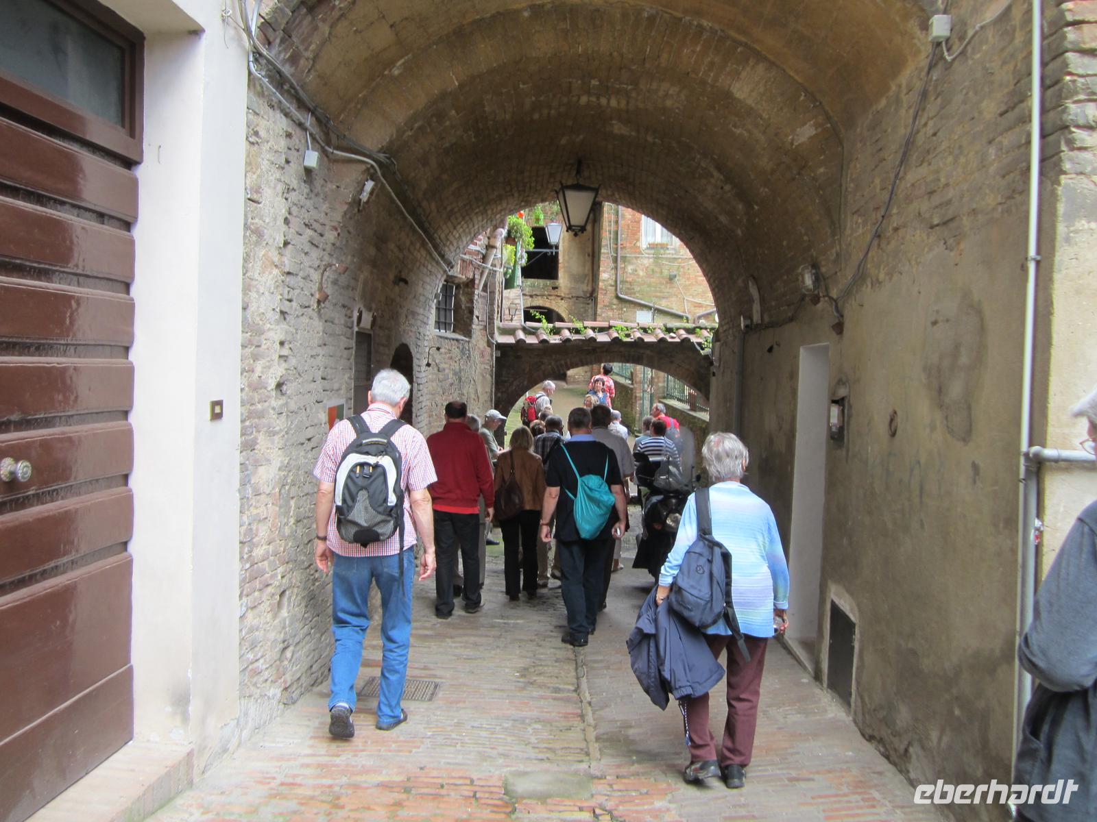 Heute haben wir keine festen Termine und wir können unsere Zeit relativ frei gestalten. Das heißt erst einmal ausschlafen. Gegen 10.00 Uhr starten wir unsere Rundfahrt und stoppen erst einmal in der Altstadt von Chianciano Terme. Nach einem kurzen Orientierungsspaziergang fahren wir nach Montalcino. Durch eine schöne Landschaft entlang des Val d'Orcia gelangen wir zur Weinstadt Montalcino. Von weiten sehen wir schon die Festung, die 1559 letzter Rückzugsort der Sieneser vor den Medici war. Wir planen unsere Mittagspause in dem Ort und probieren den "Brunello di Montalcino"(Rotwein). Danach fahren wir nach Montepulciano, vorbei an Pienza. Wir steigen an der Kirche Agli aus und spazieren entlang des Panoramaweges zum Piazza Grande. Bevor wir eine Weinprobe, Olivenoel und Grappa im Azienda Agricola Crociani probieren hat jeder etwas Zeit seine eigenen Wege zu gehen. Auch heute waren wir wieder auf den Spuren der Etrusker unterwegs, das Volk , das im sechsten Jahrhundert vor Christi das gesamte westliche Mittelmeer beherrschte und sich schon zwei Jahrhunderte später lautlos von Rom überrollen ließ. In unserer Reise werden wir immer wieder alte Etruskerstädte erleben.