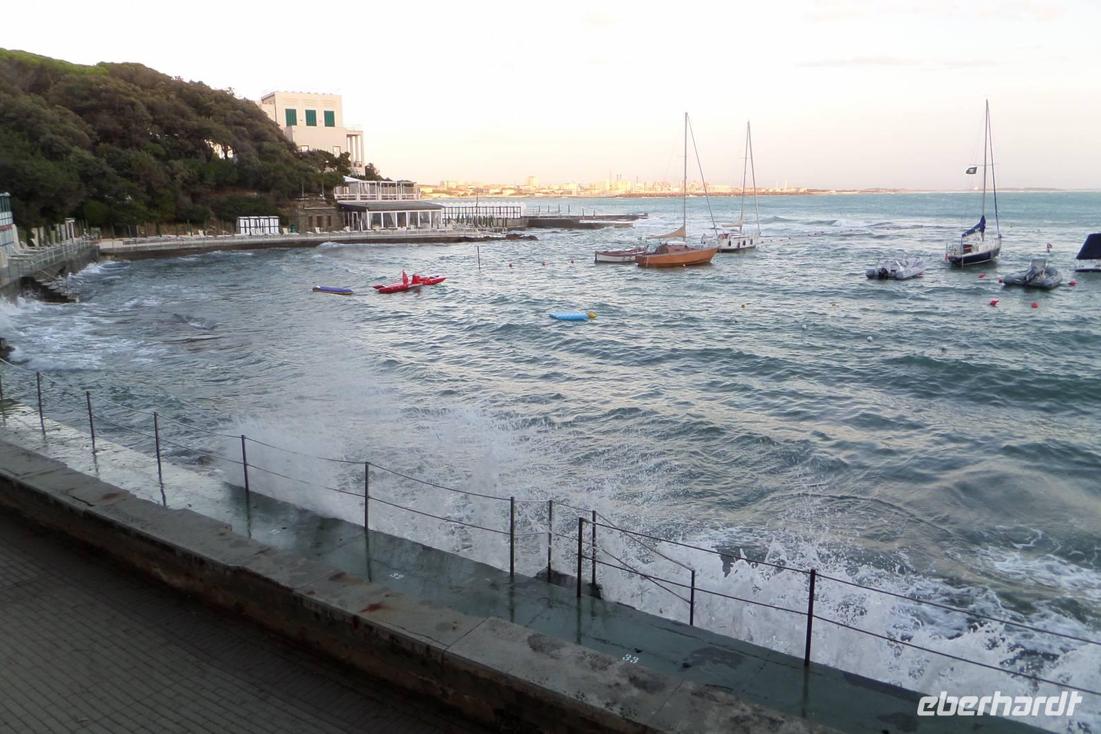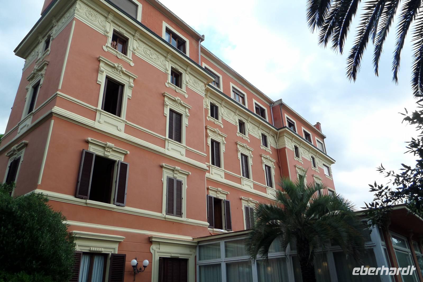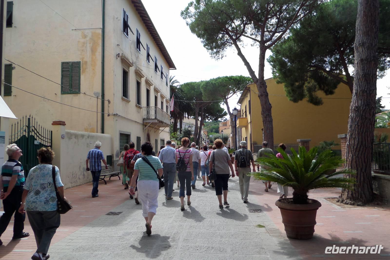 Nach etwas freier Zeit fahren wir über Volterra zu unserer nächsten Übernachtung nach Castiglioncello ins Hotel Miramare direkt am Meer. Leider muss der Bus ein ganzes Stück vom Hotel parken, aber ein Gepäcktransfer ist schon von der Agentur organsiert und bringt unsere Koffer ins Hotel. Das Hotel ist nicht mehr jedermanns Geschmack. Es befindet sich in einem historischen Jugendstilgebäude, in dem sogar schon so berühmte Persönlichkeiten wie Churchill übernachtet haben. Die Außenanlage ist sehr schön, direkt am Meer, wenn man hier auch keinen Sandstrand findet. So kann man doch sehr schön auf einer kleinen Promenade spazieren.