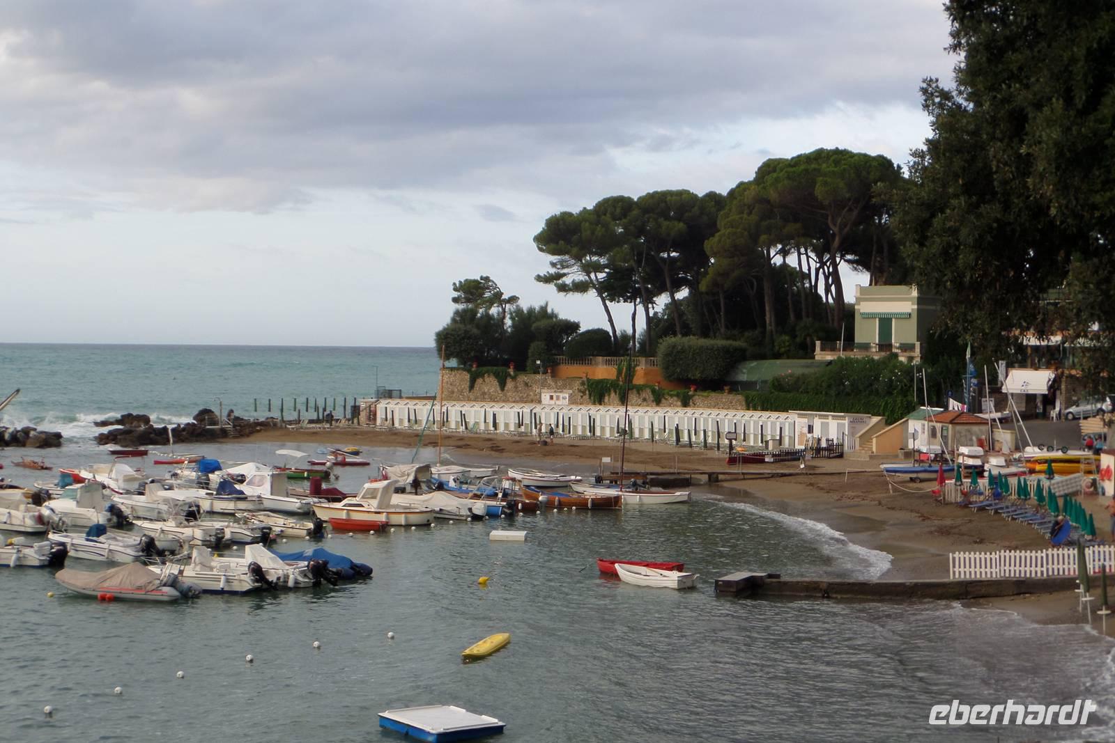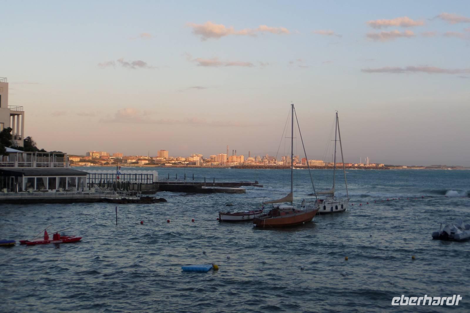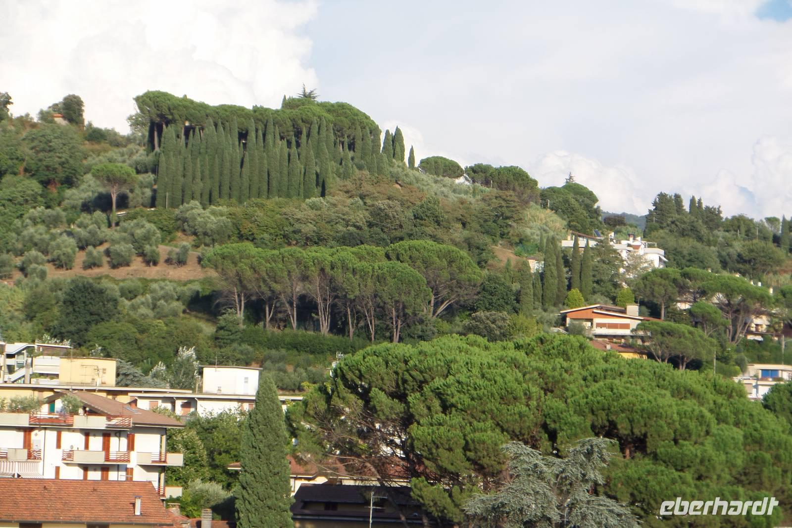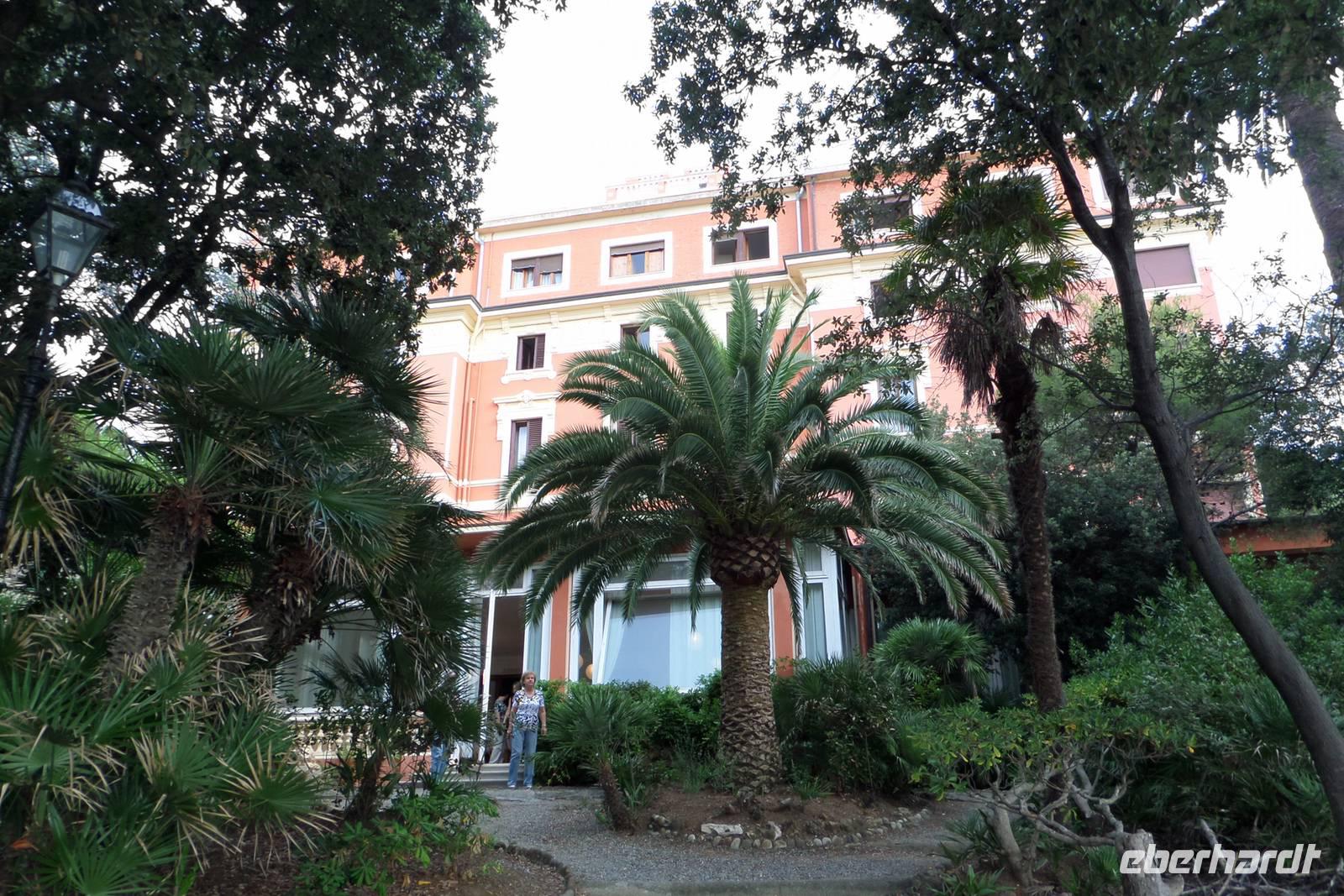 Nach etwas freier Zeit fahren wir über Volterra zu unserer nächsten Übernachtung nach Castiglioncello ins Hotel Miramare direkt am Meer. Leider muss der Bus ein ganzes Stück vom Hotel parken, aber ein Gepäcktransfer ist schon von der Agentur organsiert und bringt unsere Koffer ins Hotel. Das Hotel ist nicht mehr jedermanns Geschmack. Es befindet sich in einem historischen Jugendstilgebäude, in dem sogar schon so berühmte Persönlichkeiten wie Churchill übernachtet haben. Die Außenanlage ist sehr schön, direkt am Meer, wenn man hier auch keinen Sandstrand findet. So kann man doch sehr schön auf einer kleinen Promenade spazieren.
