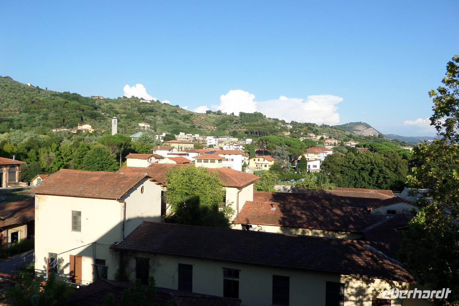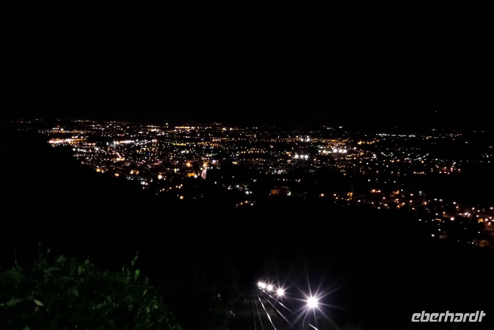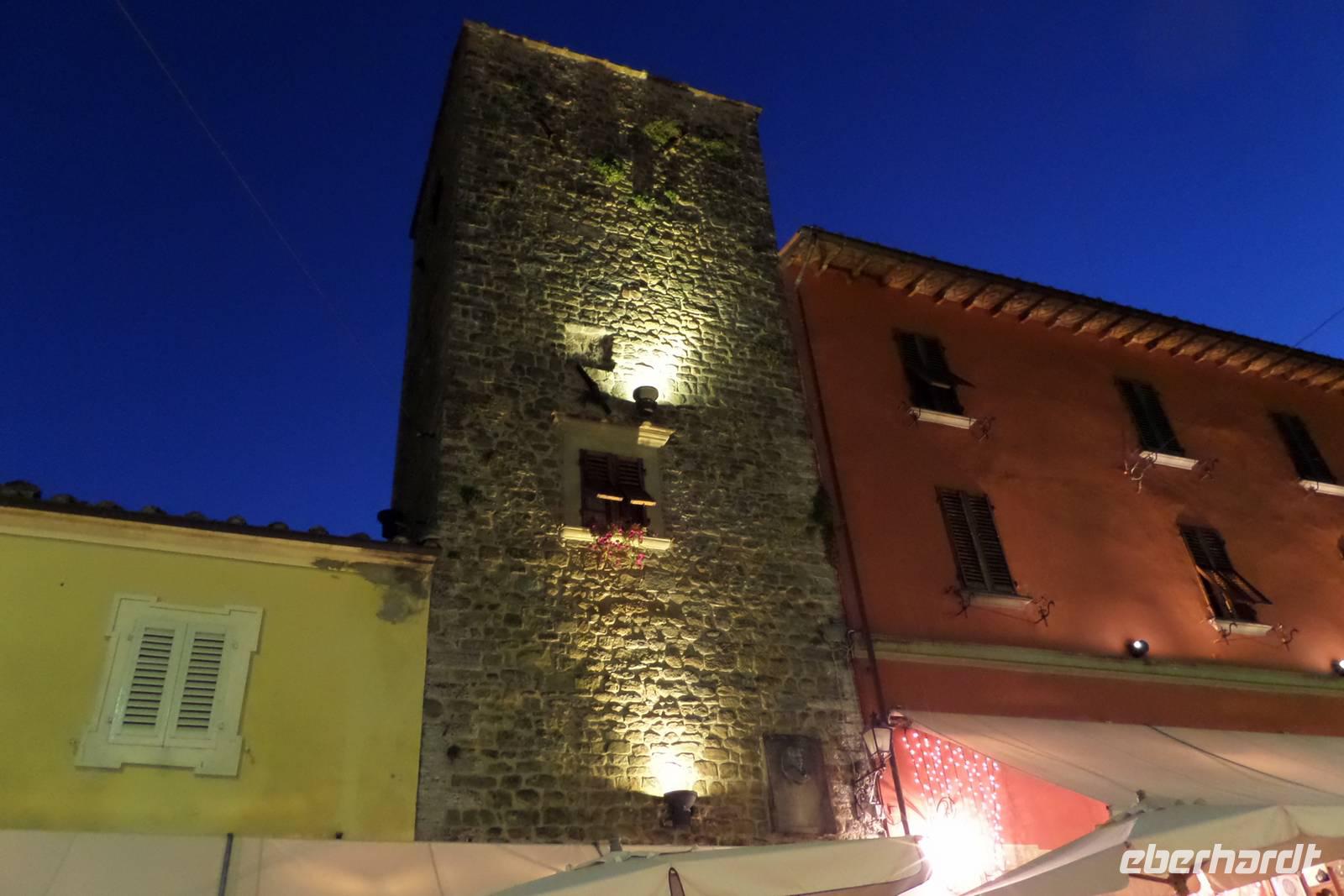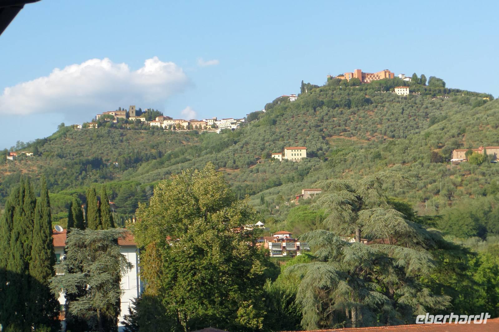 Wir haben ein zeitiges Abendessen bestellt, denn anschließend wollen wir noch zur Altstadt von Montecatini, nach Montecatini Alto. Der ursprüngliche Siedlungskern liegt etwa 200 m oberhalb des Kurortes auf einem Hügel und ist durch eine der ältesten noch in Betrieb befindlichen italienischen Standseilbahnen zu erreichen. Wir kommen leider zum Sonnenuntergang wenige Minuten zu spät, können aber noch einen Blick auf die Stadt in der Ebene werfen und später natürlich auf die Lichter. Wir spazieren noch zur Kirche, aber auch die ist schon geschlossen. Hier oben ist es etwas kühler als in der Stadt, also angenehm warm, und die Piazza verbreitet eine ruhige idyllische Atmosphäre. Wir genießen den herrlichen Abend bei dem einen oder anderen Gläschen Toskana-Wein.