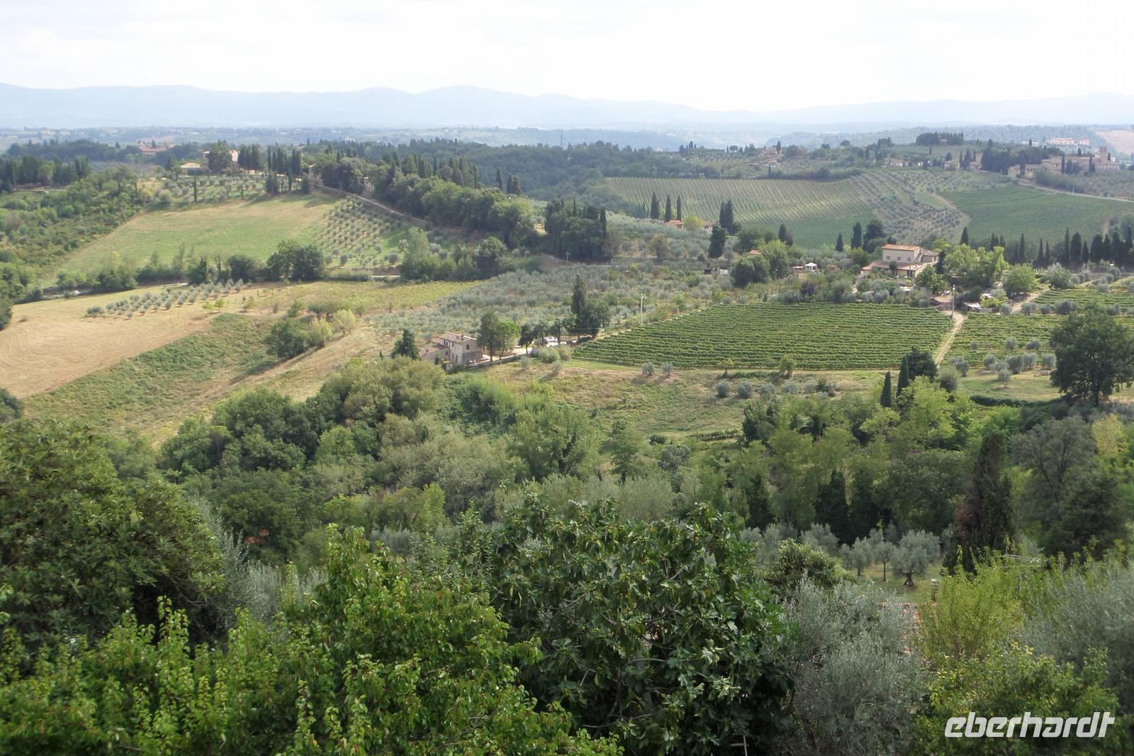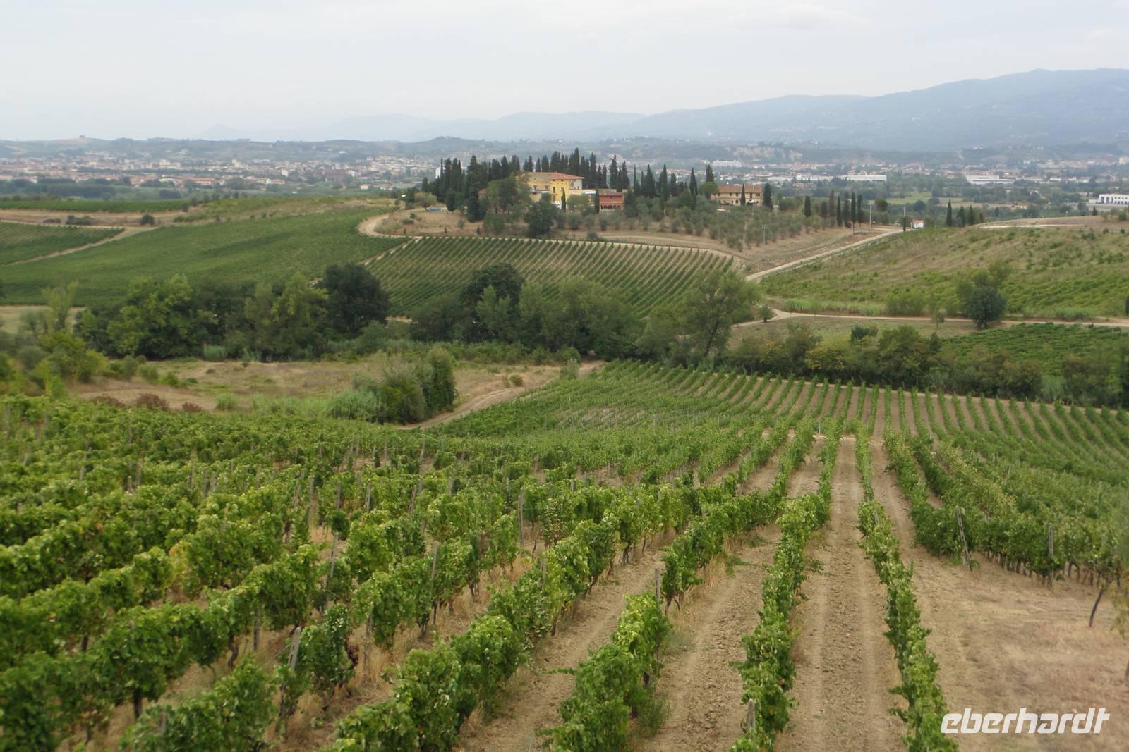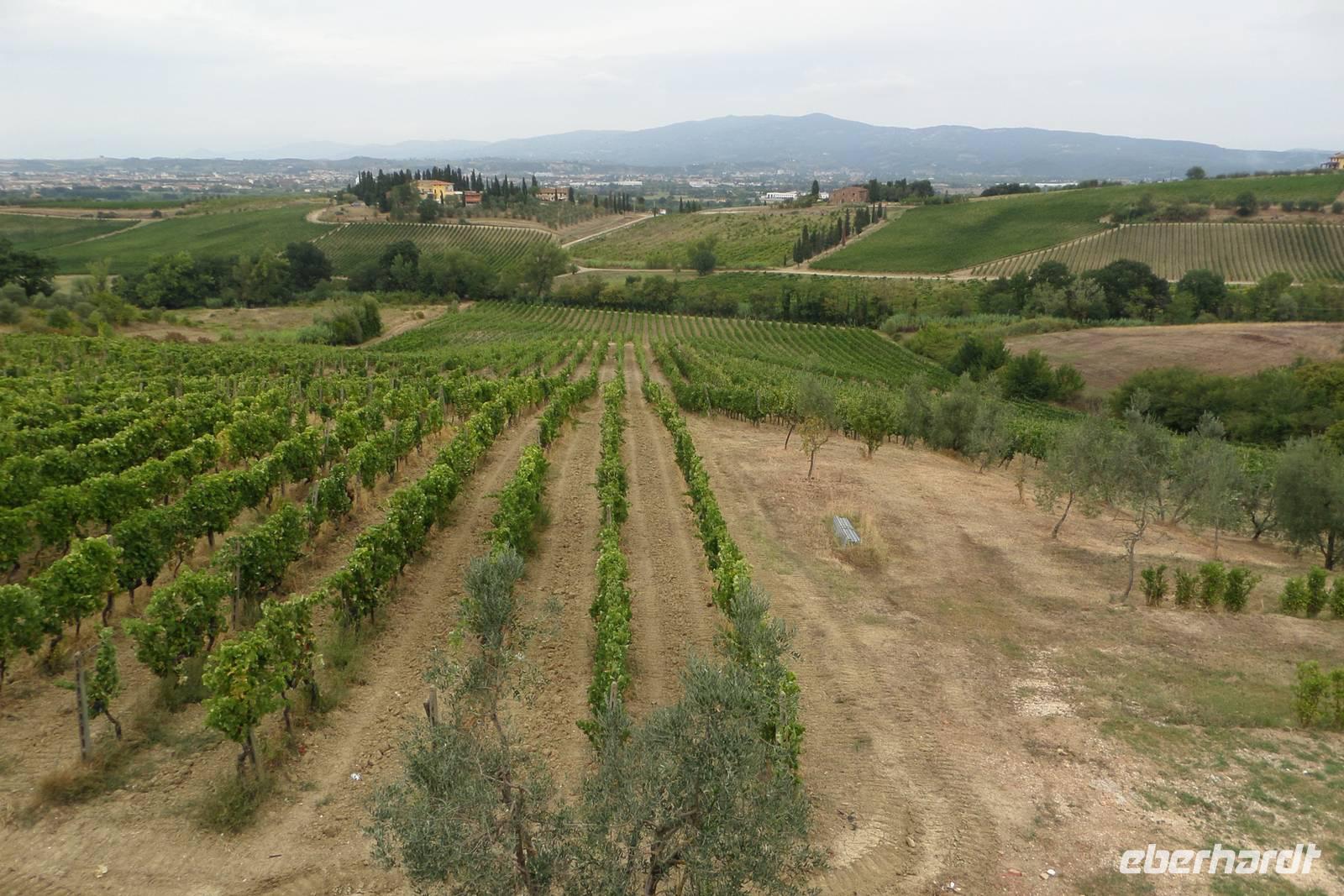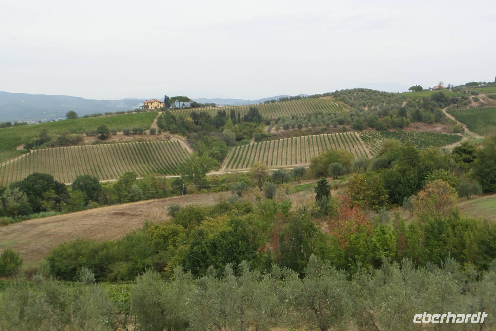 Der Bus bringt uns über die Autobahn nach Florenz-Süd, und wir lernen bei einer Fahrt über die Chianti-Weinstraße das Anbaugebiet des bekannten Rotweins kennen. Hier finden wir die Landschaft, die wir uns bei dem Wort Toskana vorstellen. Pinien u Zypressen, alte Dörfer in hügeliger Landschaft, fern auf der Anhöhe ein Gutshof oder ein Castello, an den Hängen gedeihen Oliven und berühmte Weine, wie eben der Chianti.