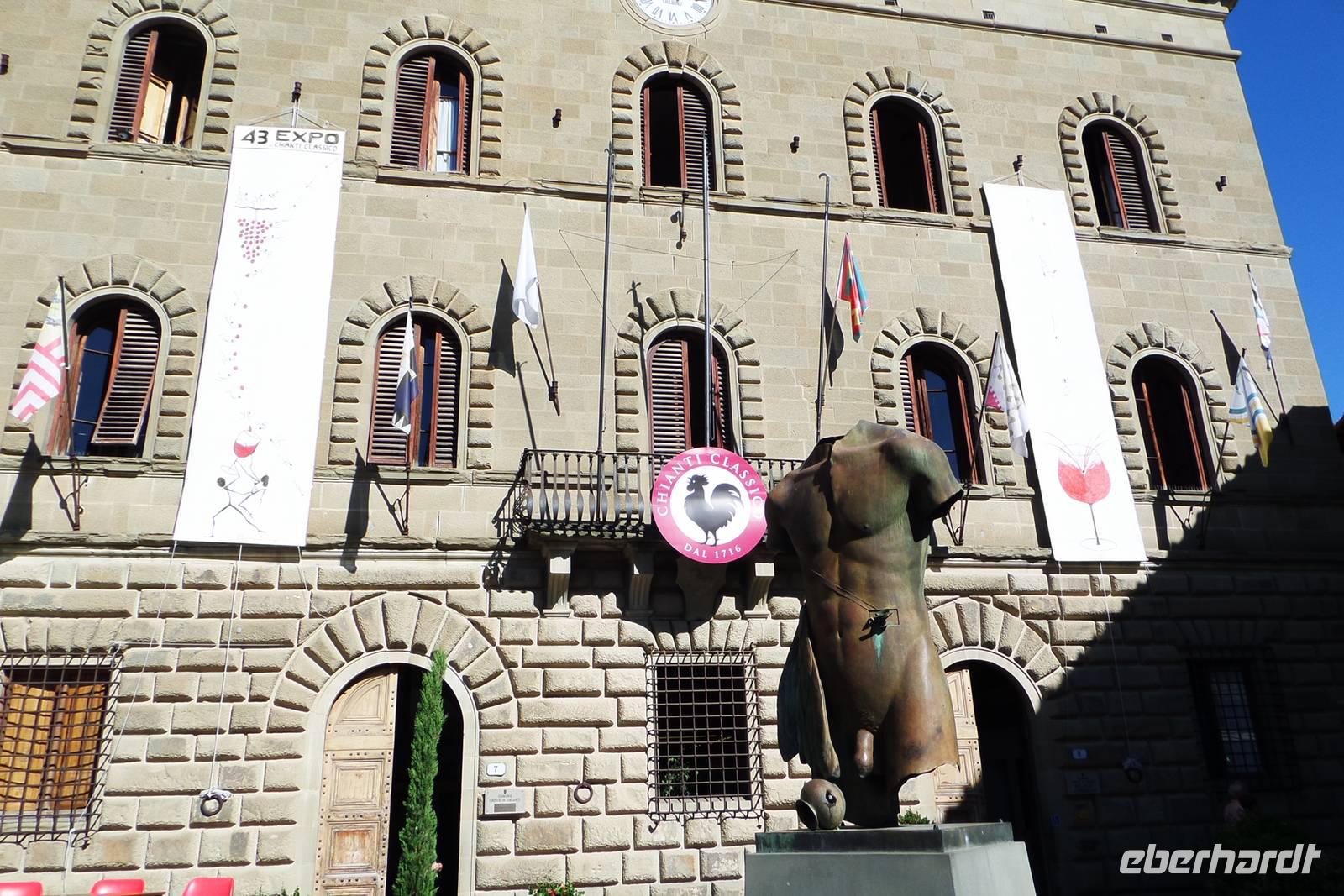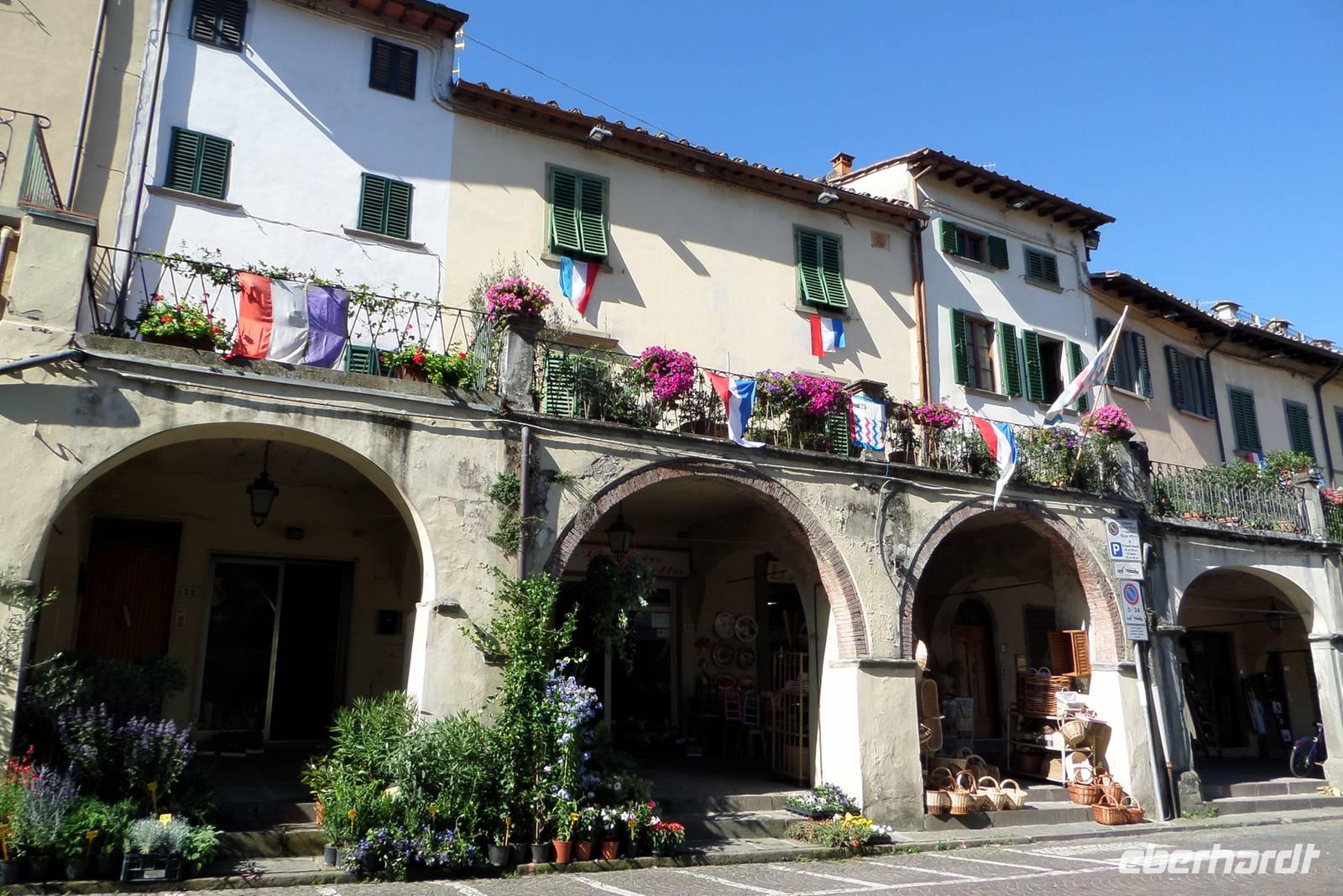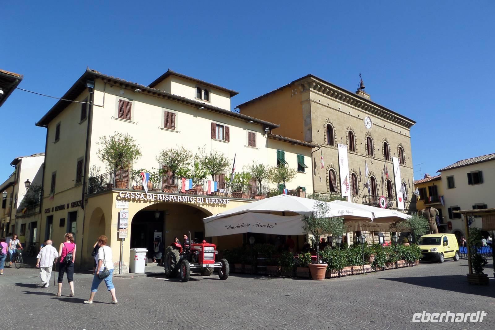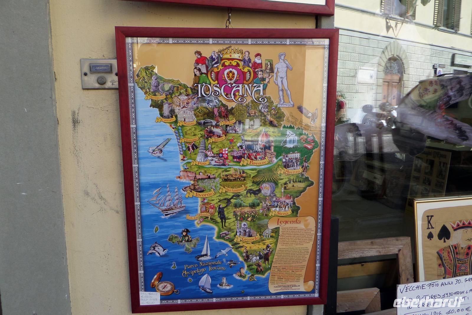Der Bus bringt uns über die Autobahn nach Florenz-Süd, und wir lernen bei einer Fahrt über die Chianti-Weinstraße das Anbaugebiet des bekannten Rotweins kennen. Hier finden wir die Landschaft, die wir uns bei dem Wort Toskana vorstellen. Pinien u Zypressen, alte Dörfer in hügeliger Landschaft, fern auf der Anhöhe ein Gutshof oder ein Castello, an den Hängen gedeihen Oliven und berühmte Weine, wie eben der Chianti.