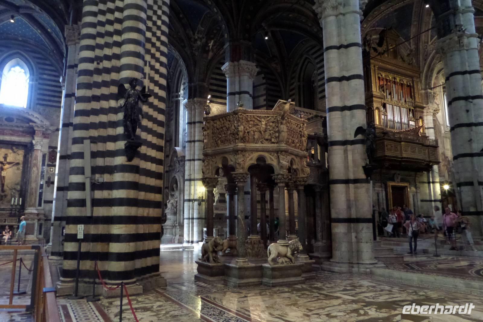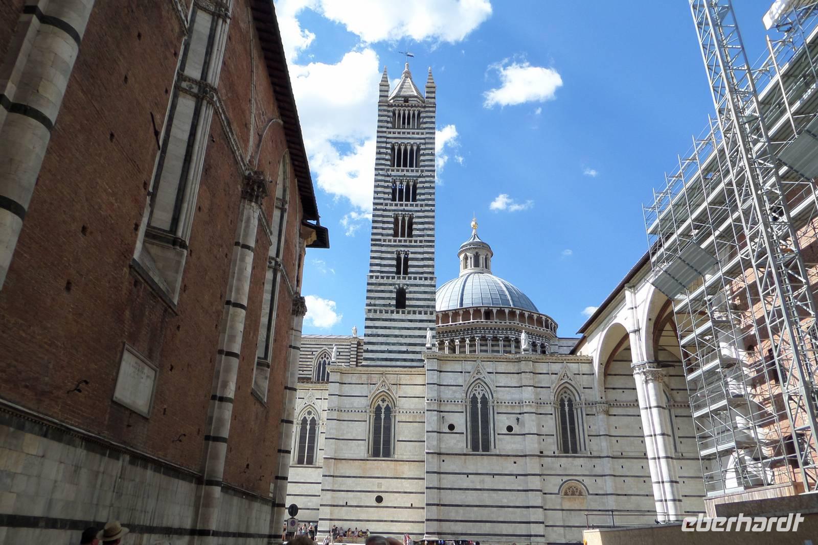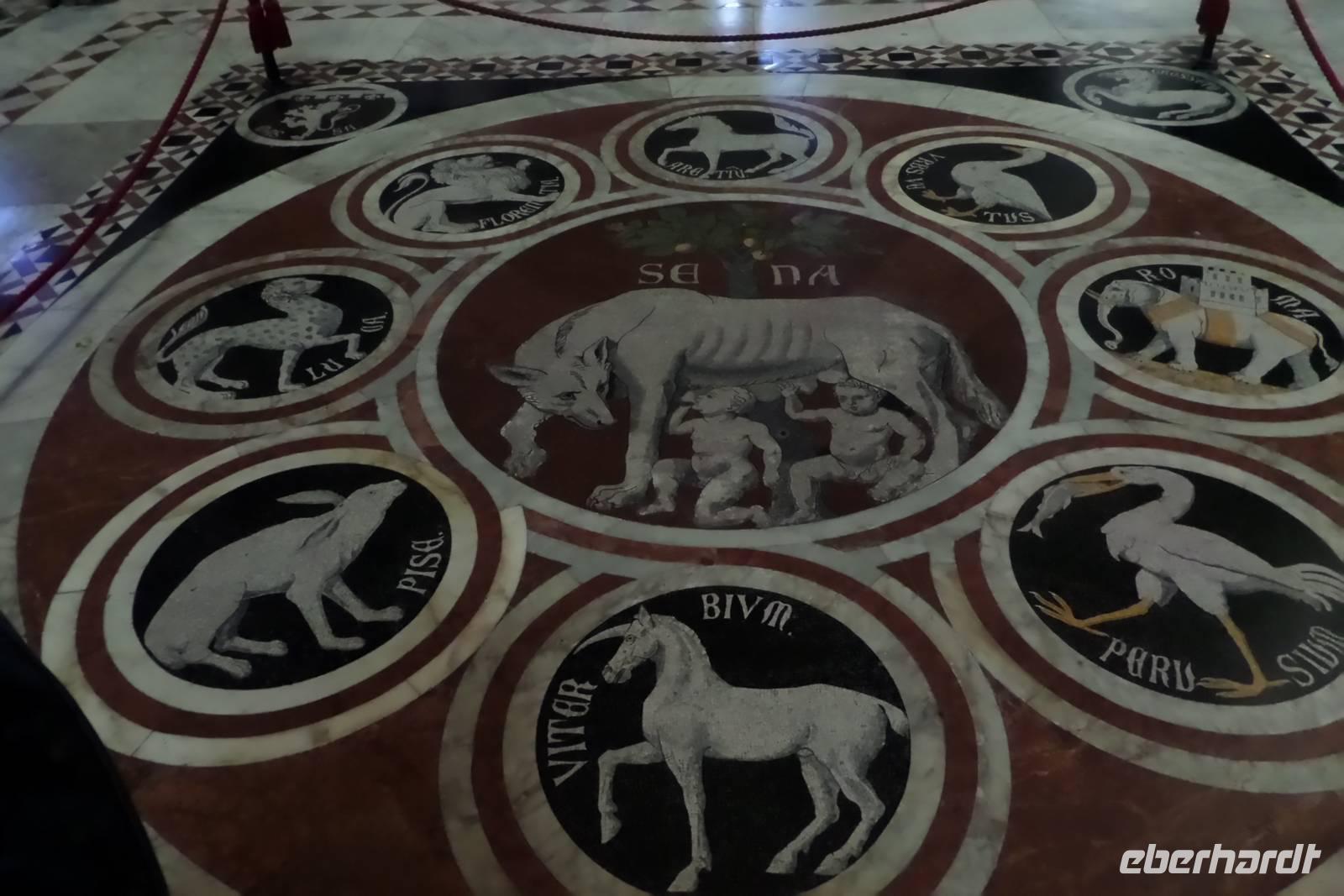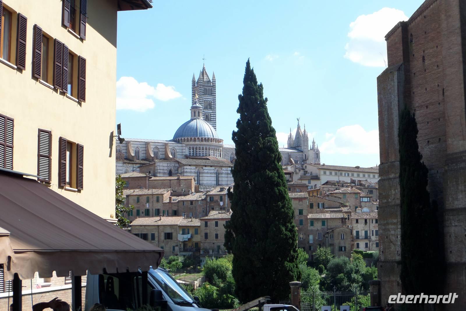 Im Hauptort Greve legen wir einen Stopp zum Bummeln über den Marktplatz ein. Allerdings sind die Aussichtsterrasse und das Museum geschlossen. An einem Aussichtspunkt werden unterwegs noch Würstchen und Kaffee ausgegeben und natürlich Fotos von der schönen Landschaft geschossen. So geht es gestärkt nach Siena, wo wir mit Stadtführerin Federica einen interessanten Rundgang durch eine der schönsten Städte der Toskana unternehmen. Die historische Altstadt gehört seit 1995 zum UNESCO-Welterbe. Zuerst schauen wir in die Basilica di San Domenico mit den Reliquien der Heiligen Katharina von Siena. Sie wird als Schutzpatronin Europas, Italiens und der Stadt Rom verehrt. Über der Piazza del Campo, bekannt für den Palio di Siena, das bekannte Pferderennen, führt uns Federica zum Dom Santa Maria Assunta. Das aus schwarzem und weißem Marmor errichtete Bauwerk ist eines der bedeutendsten Beispiele der gotischen Architektur in Italien. Fast alle Gäste möchten den Dom besichtigen. Im Inneren bewundern wir den berühmten Marmorfußboden. Beeindruckend ist auch die Marmorkanzel von Nicolò Pisano und seinem Sohn. Nach etwas Freizeit treffen wir uns am Bus, und es geht zum Hotel zurück.