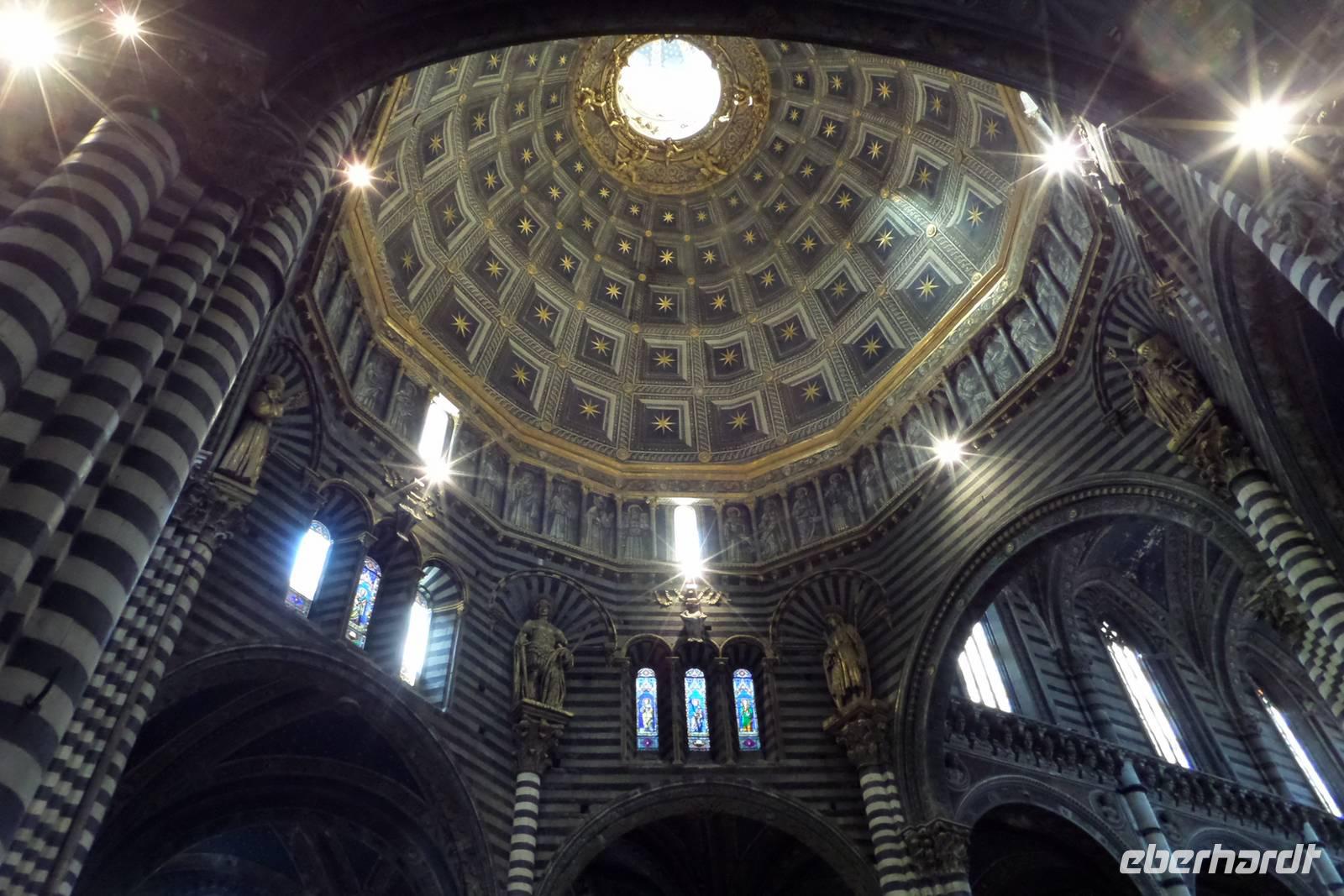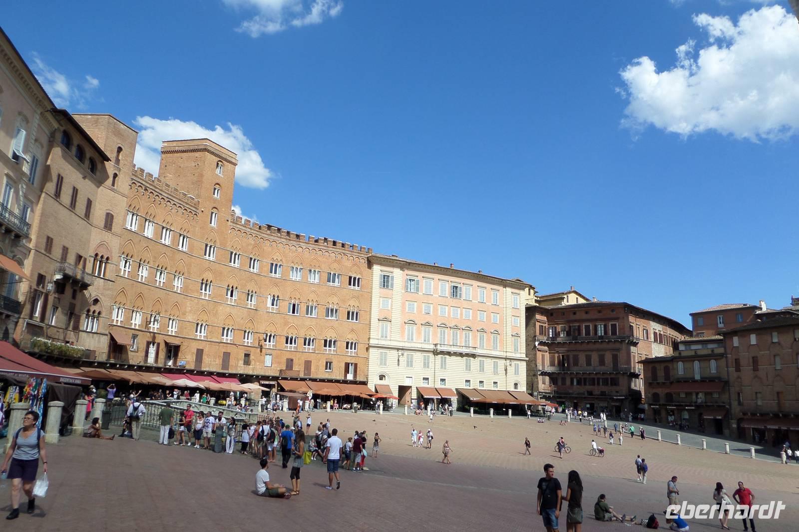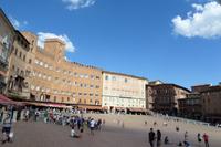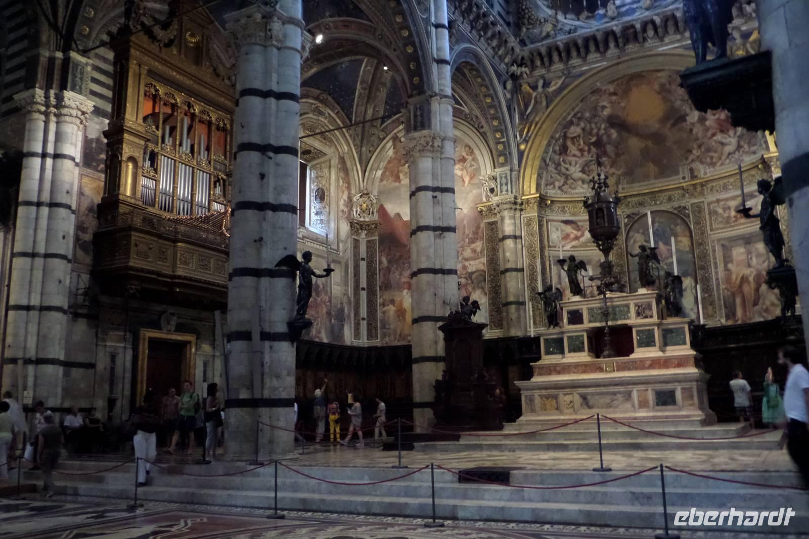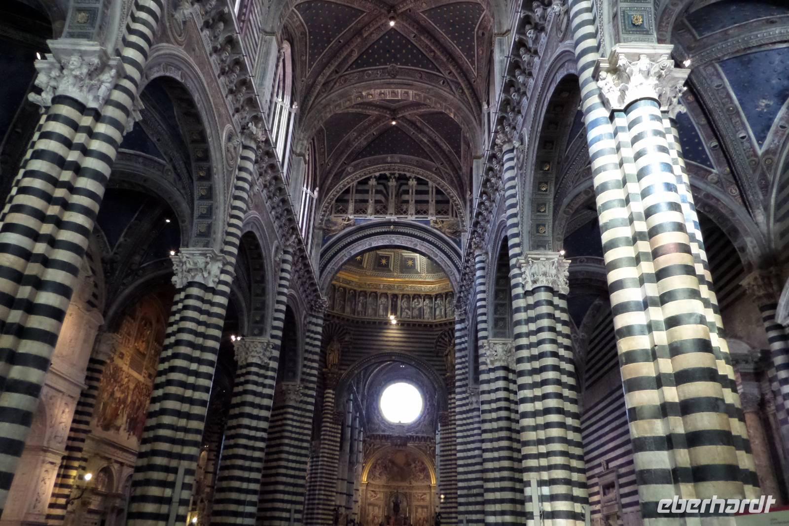 Im Hauptort Greve legen wir einen Stopp zum Bummeln über den Marktplatz ein. Allerdings sind die Aussichtsterrasse und das Museum geschlossen. An einem Aussichtspunkt werden unterwegs noch Würstchen und Kaffee ausgegeben und natürlich Fotos von der schönen Landschaft geschossen. So geht es gestärkt nach Siena, wo wir mit Stadtführerin Federica einen interessanten Rundgang durch eine der schönsten Städte der Toskana unternehmen. Die historische Altstadt gehört seit 1995 zum UNESCO-Welterbe. Zuerst schauen wir in die Basilica di San Domenico mit den Reliquien der Heiligen Katharina von Siena. Sie wird als Schutzpatronin Europas, Italiens und der Stadt Rom verehrt. Über der Piazza del Campo, bekannt für den Palio di Siena, das bekannte Pferderennen, führt uns Federica zum Dom Santa Maria Assunta. Das aus schwarzem und weißem Marmor errichtete Bauwerk ist eines der bedeutendsten Beispiele der gotischen Architektur in Italien. Fast alle Gäste möchten den Dom besichtigen. Im Inneren bewundern wir den berühmten Marmorfußboden. Beeindruckend ist auch die Marmorkanzel von Nicolò Pisano und seinem Sohn. Nach etwas Freizeit treffen wir uns am Bus, und es geht zum Hotel zurück.