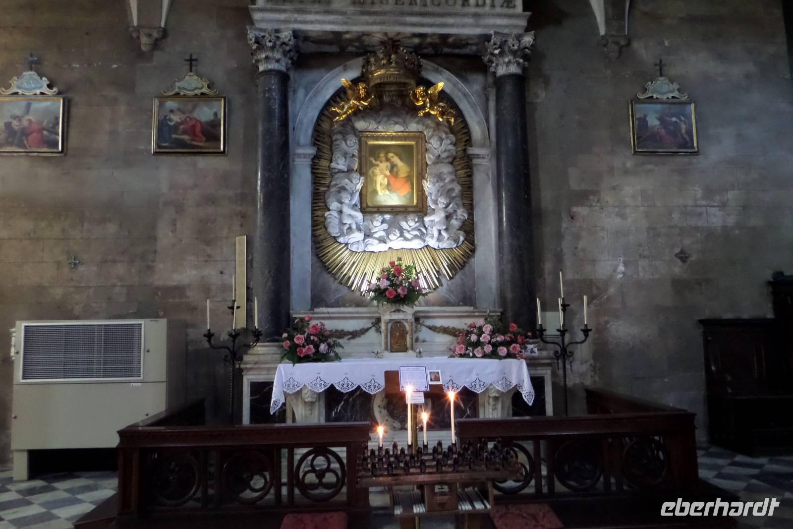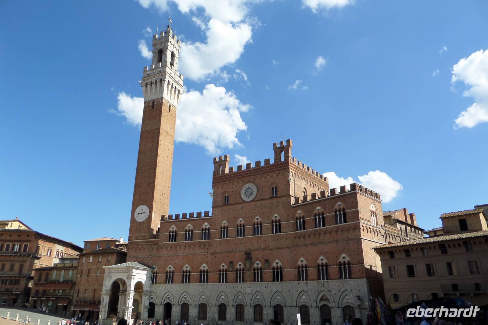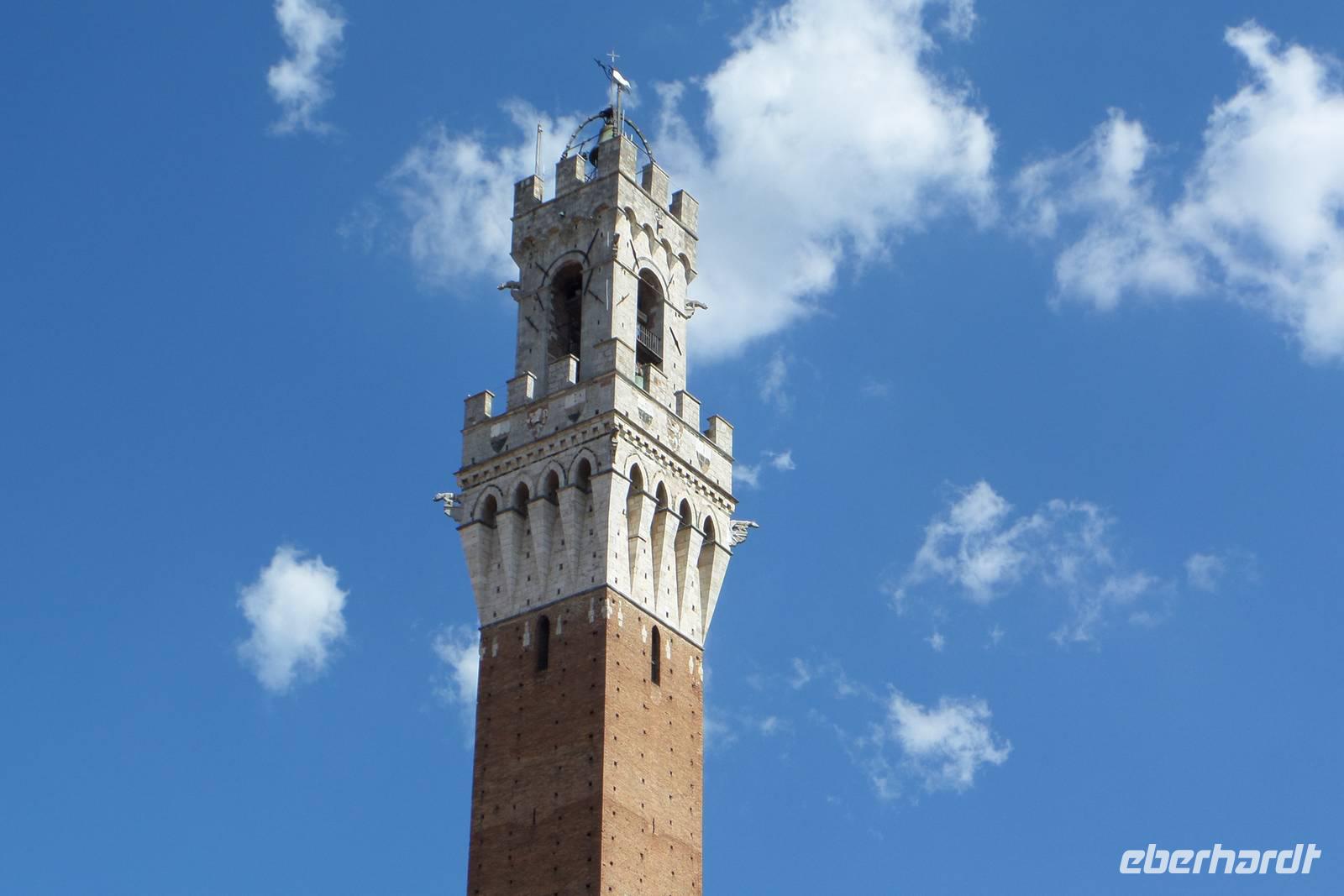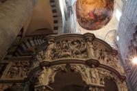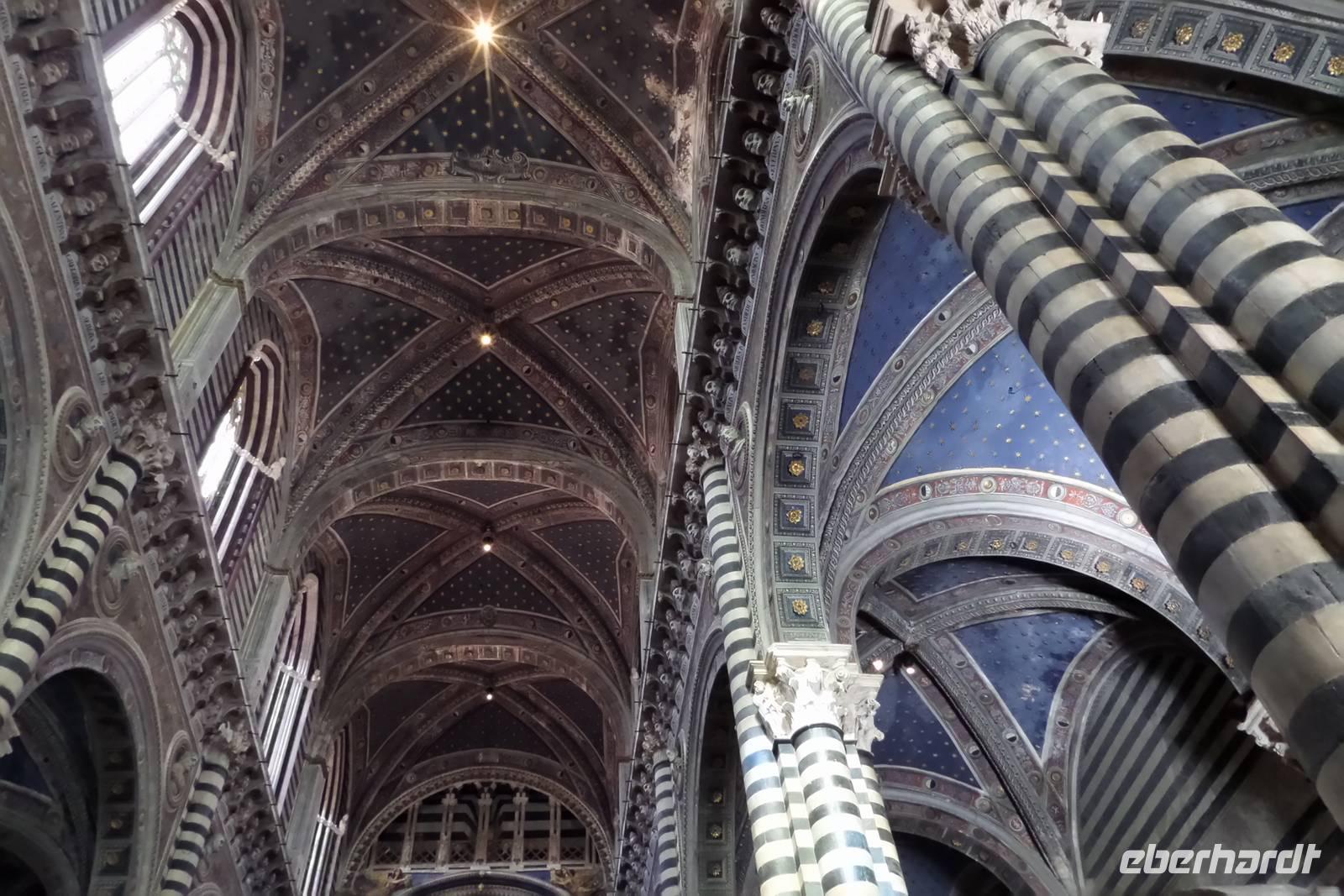 Im Hauptort Greve legen wir einen Stopp zum Bummeln über den Marktplatz ein. Allerdings sind die Aussichtsterrasse und das Museum geschlossen. An einem Aussichtspunkt werden unterwegs noch Würstchen und Kaffee ausgegeben und natürlich Fotos von der schönen Landschaft geschossen. So geht es gestärkt nach Siena, wo wir mit Stadtführerin Federica einen interessanten Rundgang durch eine der schönsten Städte der Toskana unternehmen. Die historische Altstadt gehört seit 1995 zum UNESCO-Welterbe. Zuerst schauen wir in die Basilica di San Domenico mit den Reliquien der Heiligen Katharina von Siena. Sie wird als Schutzpatronin Europas, Italiens und der Stadt Rom verehrt. Über der Piazza del Campo, bekannt für den Palio di Siena, das bekannte Pferderennen, führt uns Federica zum Dom Santa Maria Assunta. Das aus schwarzem und weißem Marmor errichtete Bauwerk ist eines der bedeutendsten Beispiele der gotischen Architektur in Italien. Fast alle Gäste möchten den Dom besichtigen. Im Inneren bewundern wir den berühmten Marmorfußboden. Beeindruckend ist auch die Marmorkanzel von Nicolò Pisano und seinem Sohn. Nach etwas Freizeit treffen wir uns am Bus, und es geht zum Hotel zurück.