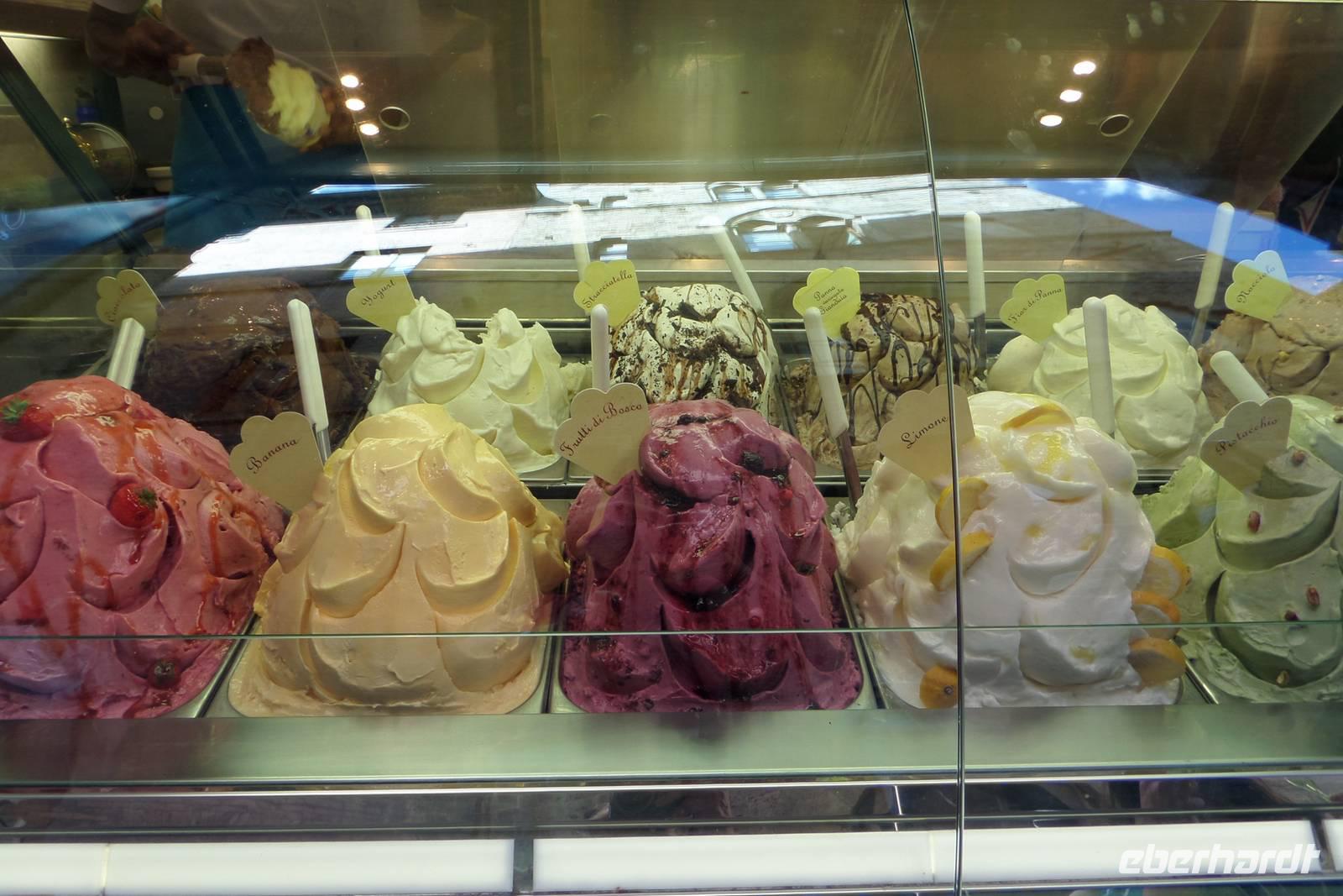 Natürlich müssen wir das beste Eis der Welt probieren. Die Gelateria Dondoli wurde dafür ausgezeichnet. Trotz Riesenschlange geht es schnell voran.