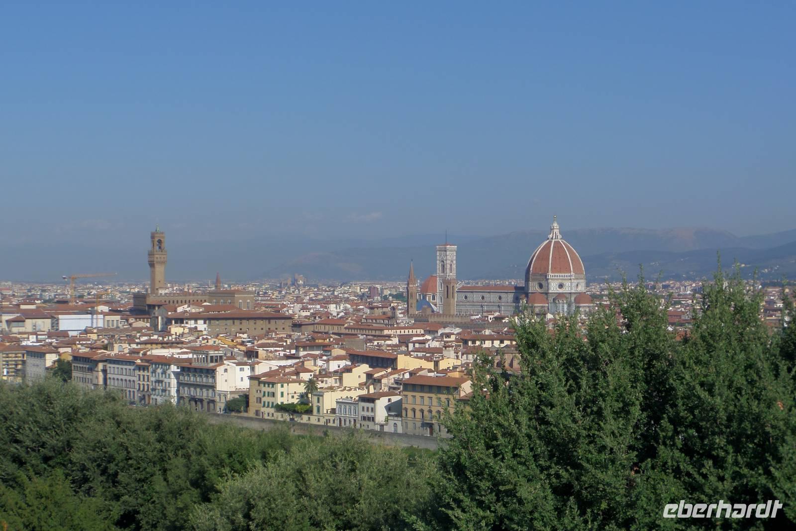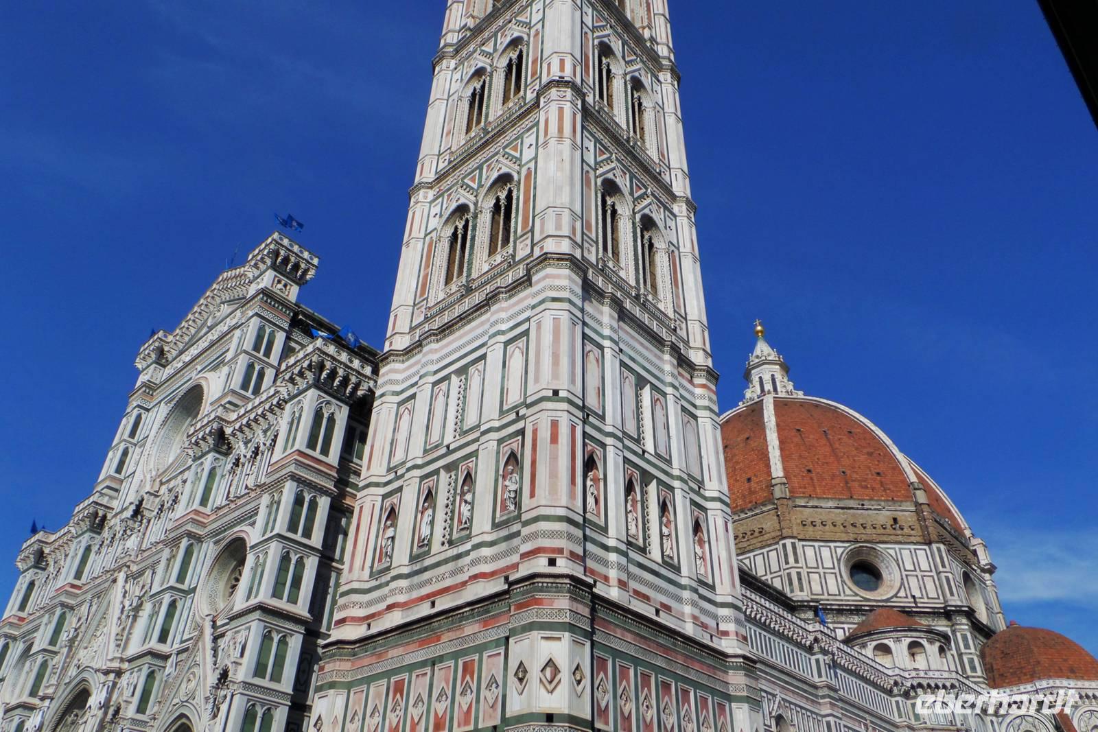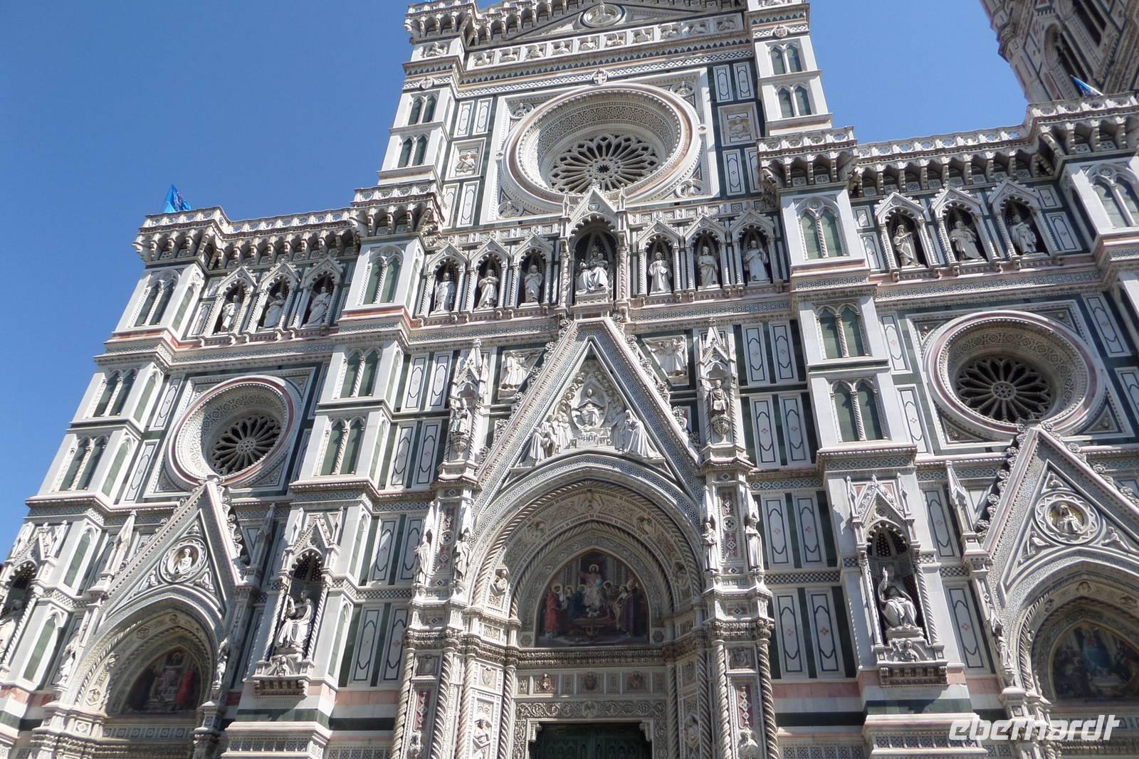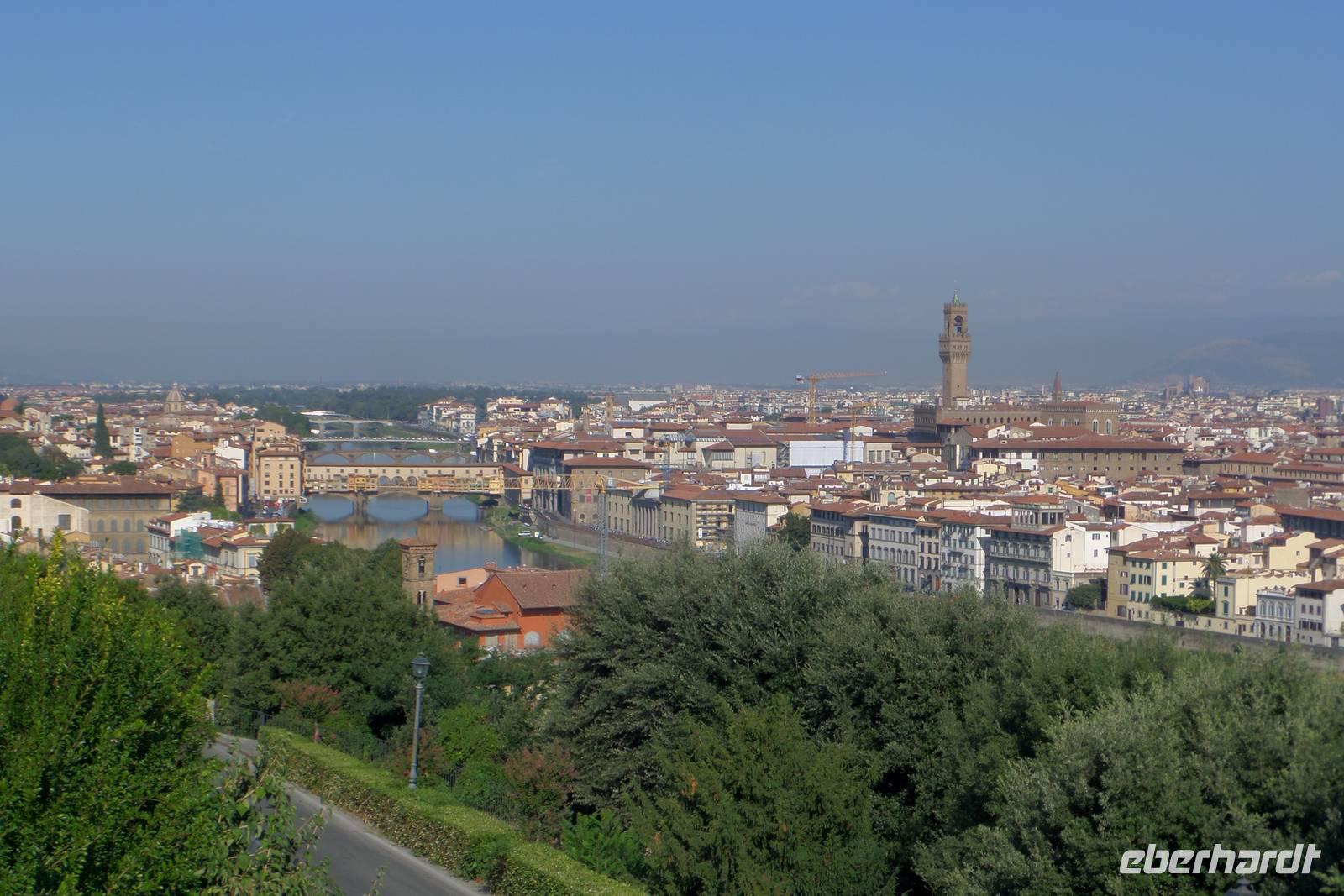 Wir werden von unserer charmanten Stadtführerin Angela zuerst mit dem Bus zum Aussichtspunkt Michelangelo über der Stadt gebracht, um diesen traumhaften Blick auf La Bella zu erleben. Wir lauschen den ganzen Tag über den sehr interessanten Ausführungen Angelas zur Welthauptstadt der Renaissance. Man kann natürlich an einem Tag nur einen kleinen Teil der Stadt erkunden. Die ganze Gruppe möchte die Franziskanerkirche Santa Croce, die größte und eine der bedeutendsten Franziskanerkirchen Italiens, besichtigen. Deshalb bezahlt Petra uns als Überraschung die Eintrittskarten. Der Legende nach hat der heilige Franz von Assisi selbst den Grundstein gelegt. Sie wird auch als „Pantheon von Florenz" bezeichnet, denn hier befinden sich neben Monumenten für viele berühmte Italiener, wie Dante Alighieri, auch die Grabmäler von Michelangelo und Galileo Galilei. Wir laufen durch das Rathaus auf die Piazza della Signoria und bewundern die Kopie von Michelangelos David und andere Skulpturen. Weiter bummeln wir über die Ponte Vecchio mit den Schmuckgeschäften zur Piazza Repubblica, um uns bei einer Mittagspause zu stärken. Am Nachmittag besichtigen wir die weltbekannte Kathedrale Santa Maria del Fiore mit ihrer berühmten Kuppel. Angela erklärt uns zuvor die Paradiespforte am Baptisterium. Nach etwas Freizeit treffen wir uns wieder am Bus, um zurückzufahren.