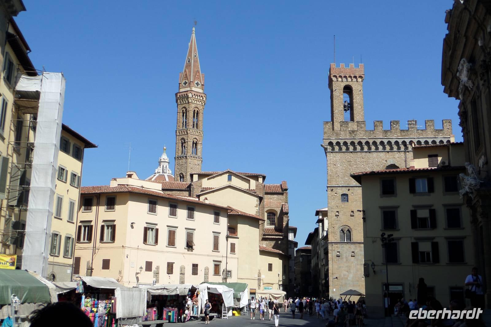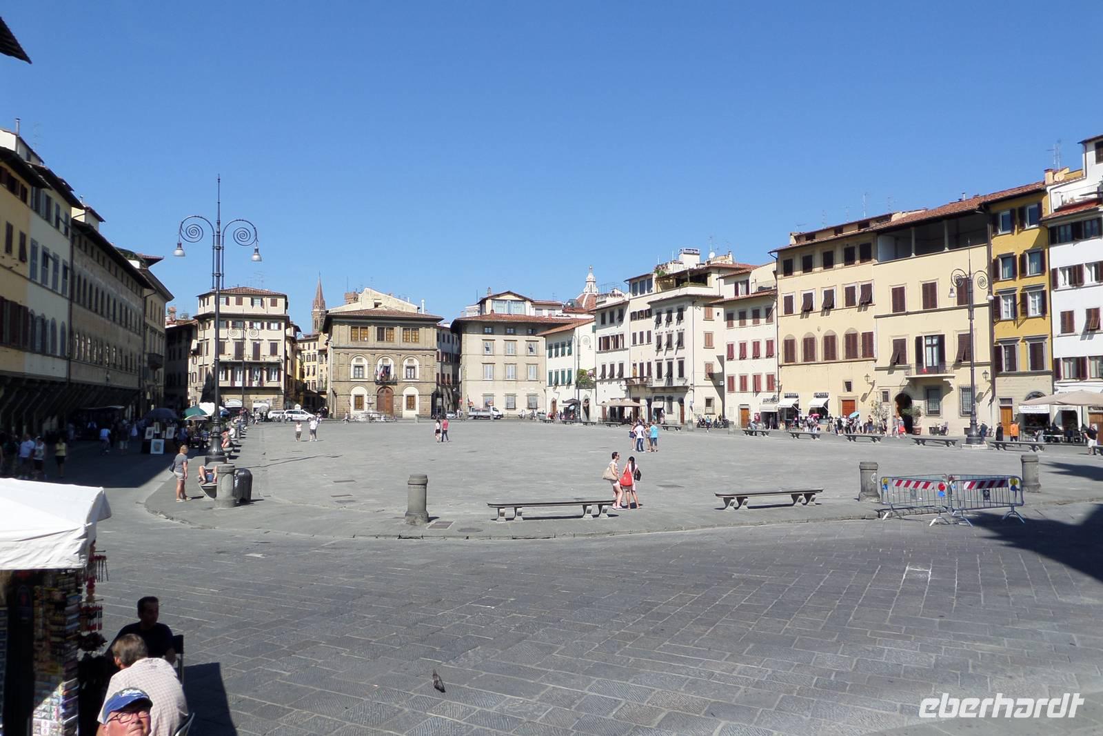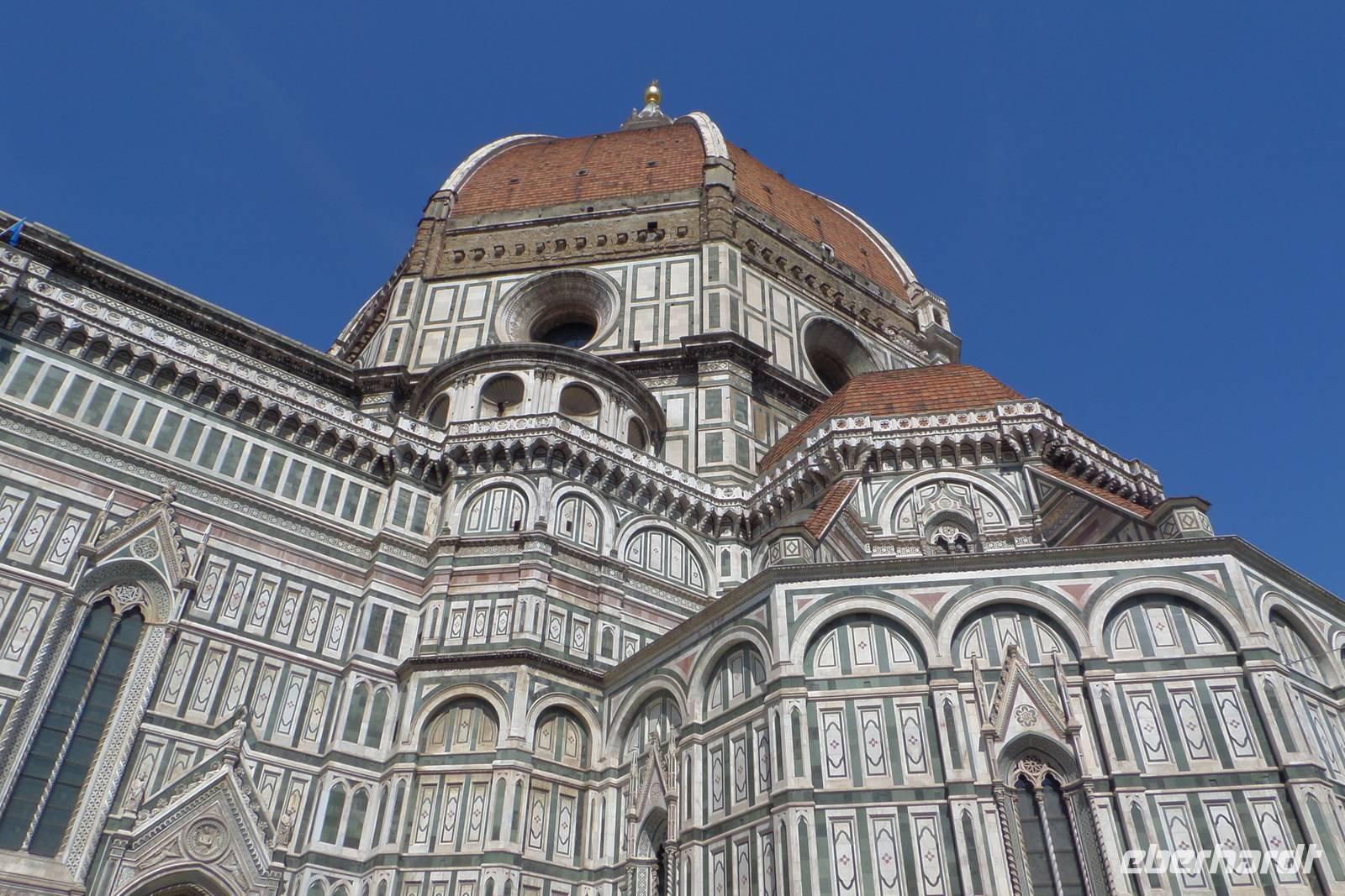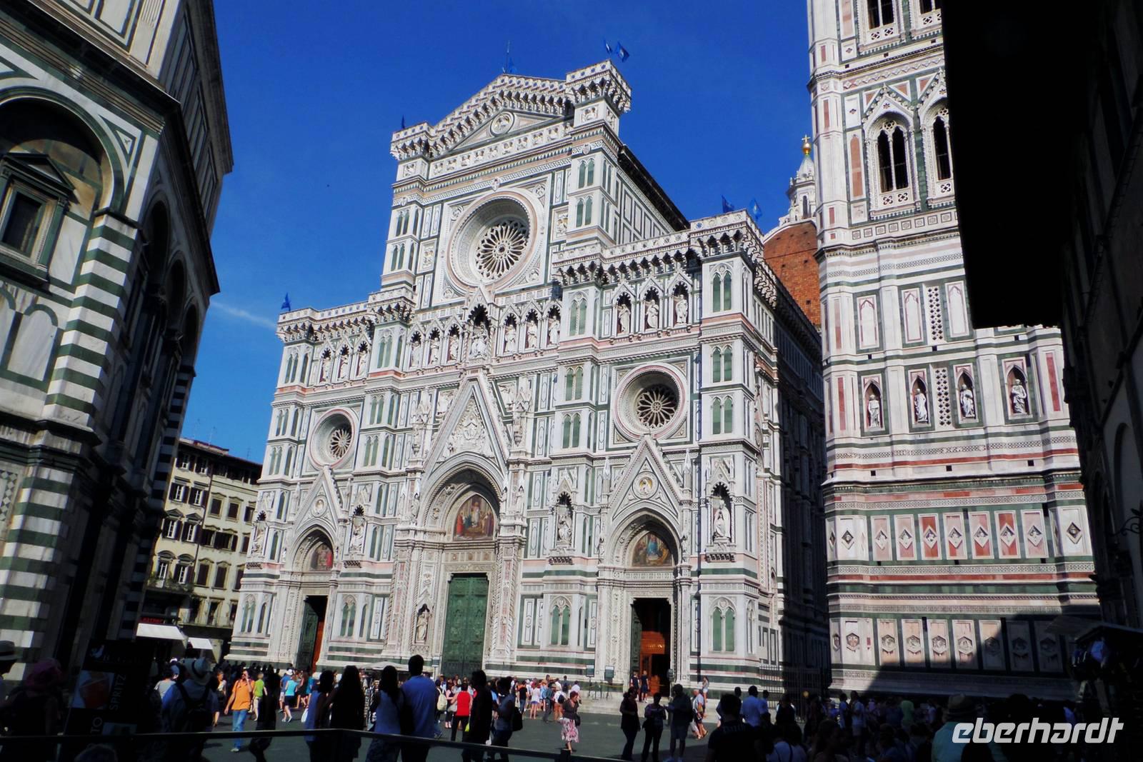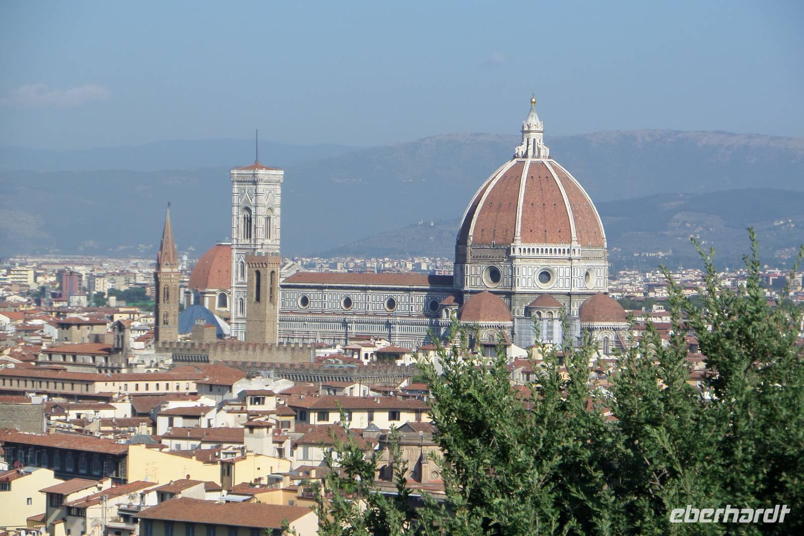 Wir werden von unserer charmanten Stadtführerin Angela zuerst mit dem Bus zum Aussichtspunkt Michelangelo über der Stadt gebracht, um diesen traumhaften Blick auf La Bella zu erleben. Wir lauschen den ganzen Tag über den sehr interessanten Ausführungen Angelas zur Welthauptstadt der Renaissance. Man kann natürlich an einem Tag nur einen kleinen Teil der Stadt erkunden. Die ganze Gruppe möchte die Franziskanerkirche Santa Croce, die größte und eine der bedeutendsten Franziskanerkirchen Italiens, besichtigen. Deshalb bezahlt Petra uns als Überraschung die Eintrittskarten. Der Legende nach hat der heilige Franz von Assisi selbst den Grundstein gelegt. Sie wird auch als „Pantheon von Florenz" bezeichnet, denn hier befinden sich neben Monumenten für viele berühmte Italiener, wie Dante Alighieri, auch die Grabmäler von Michelangelo und Galileo Galilei. Wir laufen durch das Rathaus auf die Piazza della Signoria und bewundern die Kopie von Michelangelos David und andere Skulpturen. Weiter bummeln wir über die Ponte Vecchio mit den Schmuckgeschäften zur Piazza Repubblica, um uns bei einer Mittagspause zu stärken. Am Nachmittag besichtigen wir die weltbekannte Kathedrale Santa Maria del Fiore mit ihrer berühmten Kuppel. Angela erklärt uns zuvor die Paradiespforte am Baptisterium. Nach etwas Freizeit treffen wir uns wieder am Bus, um zurückzufahren.