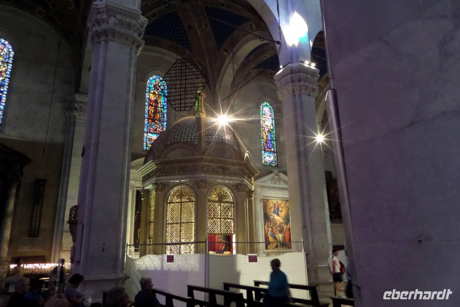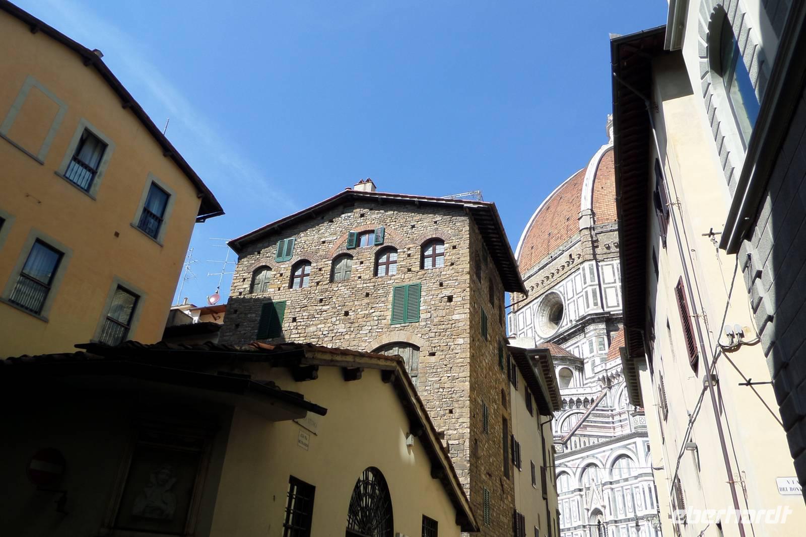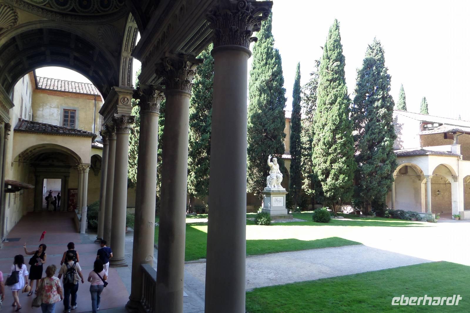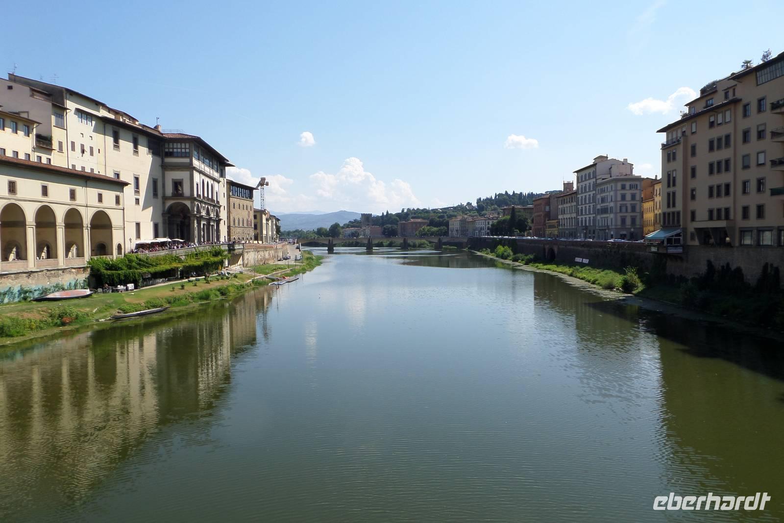 Wir werden von unserer charmanten Stadtführerin Angela zuerst mit dem Bus zum Aussichtspunkt Michelangelo über der Stadt gebracht, um diesen traumhaften Blick auf La Bella zu erleben. Wir lauschen den ganzen Tag über den sehr interessanten Ausführungen Angelas zur Welthauptstadt der Renaissance. Man kann natürlich an einem Tag nur einen kleinen Teil der Stadt erkunden. Die ganze Gruppe möchte die Franziskanerkirche Santa Croce, die größte und eine der bedeutendsten Franziskanerkirchen Italiens, besichtigen. Deshalb bezahlt Petra uns als Überraschung die Eintrittskarten. Der Legende nach hat der heilige Franz von Assisi selbst den Grundstein gelegt. Sie wird auch als „Pantheon von Florenz" bezeichnet, denn hier befinden sich neben Monumenten für viele berühmte Italiener, wie Dante Alighieri, auch die Grabmäler von Michelangelo und Galileo Galilei. Wir laufen durch das Rathaus auf die Piazza della Signoria und bewundern die Kopie von Michelangelos David und andere Skulpturen. Weiter bummeln wir über die Ponte Vecchio mit den Schmuckgeschäften zur Piazza Repubblica, um uns bei einer Mittagspause zu stärken. Am Nachmittag besichtigen wir die weltbekannte Kathedrale Santa Maria del Fiore mit ihrer berühmten Kuppel. Angela erklärt uns zuvor die Paradiespforte am Baptisterium. Nach etwas Freizeit treffen wir uns wieder am Bus, um zurückzufahren.