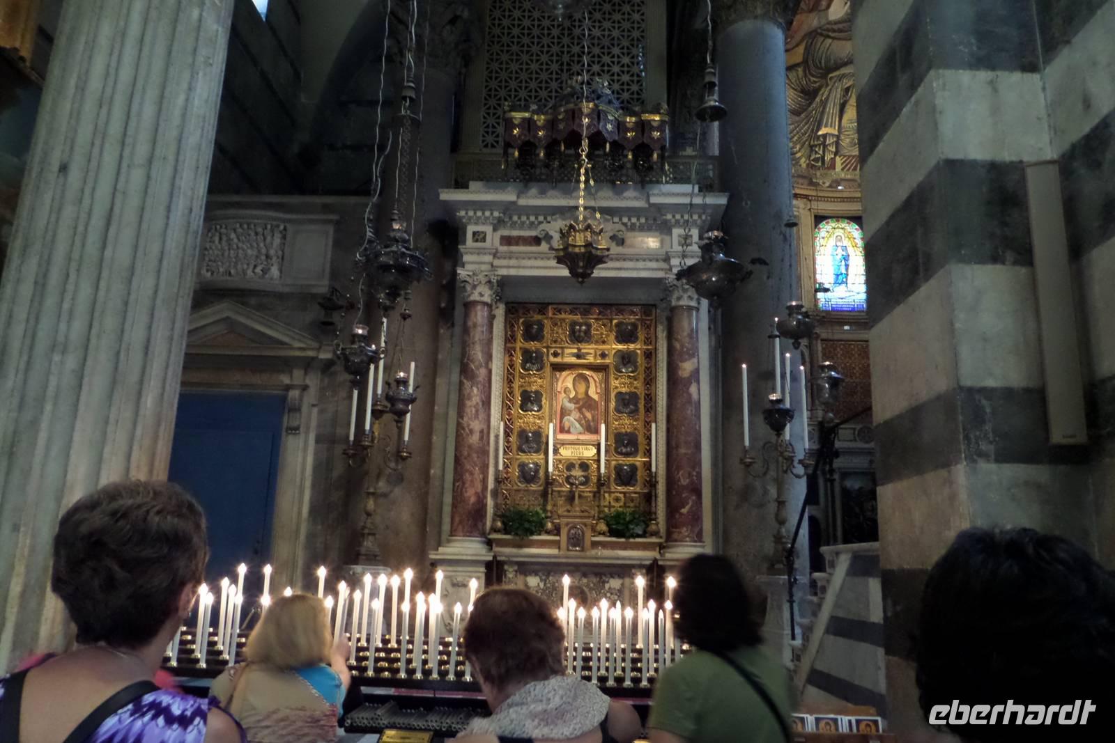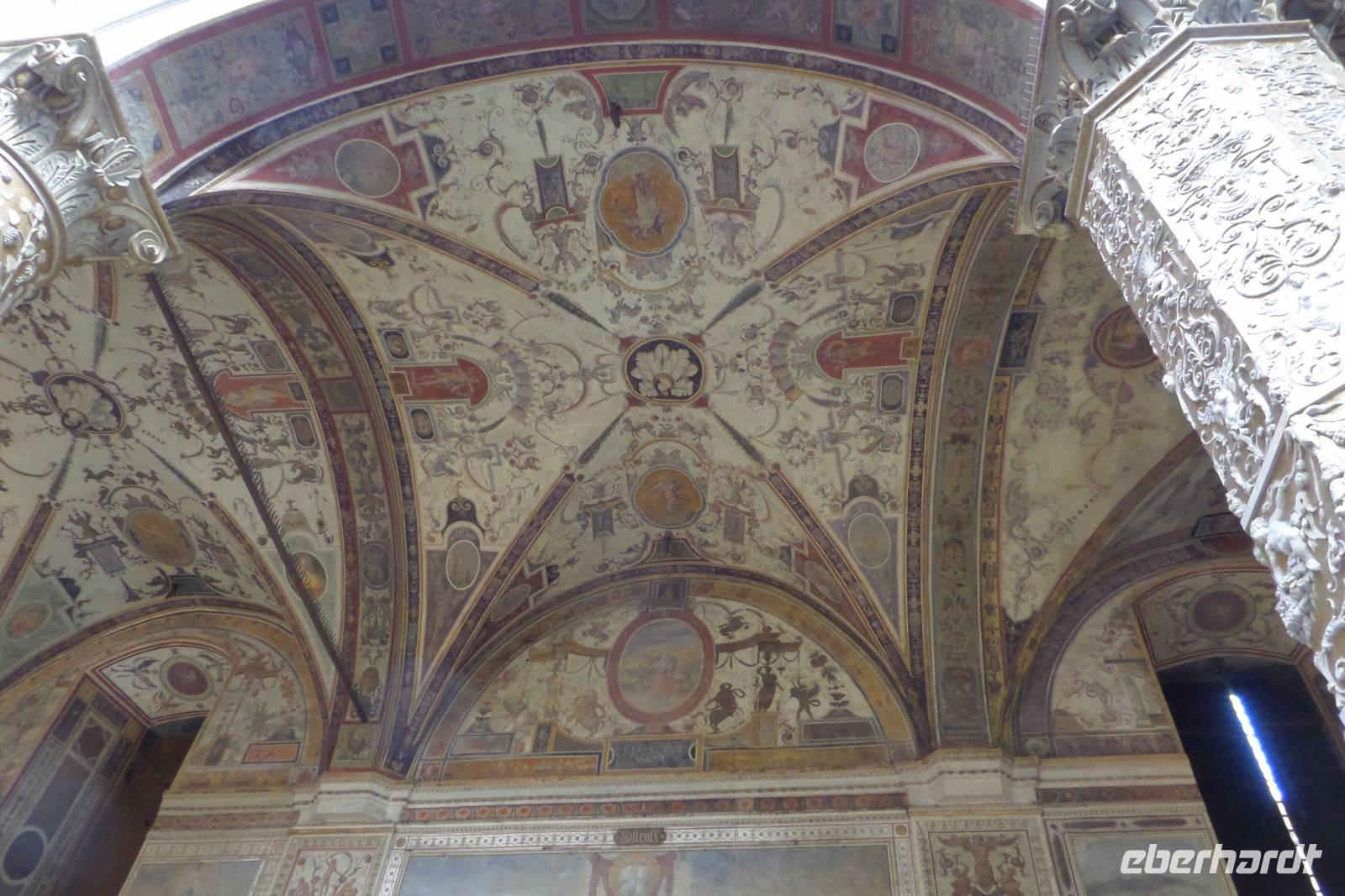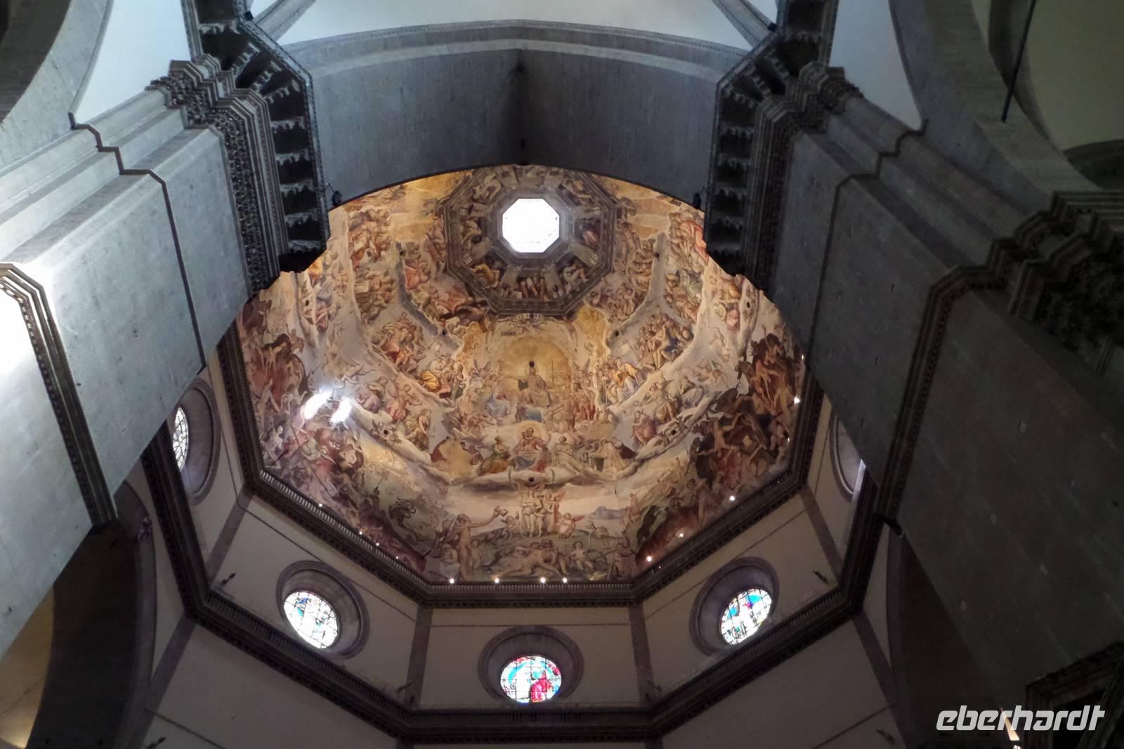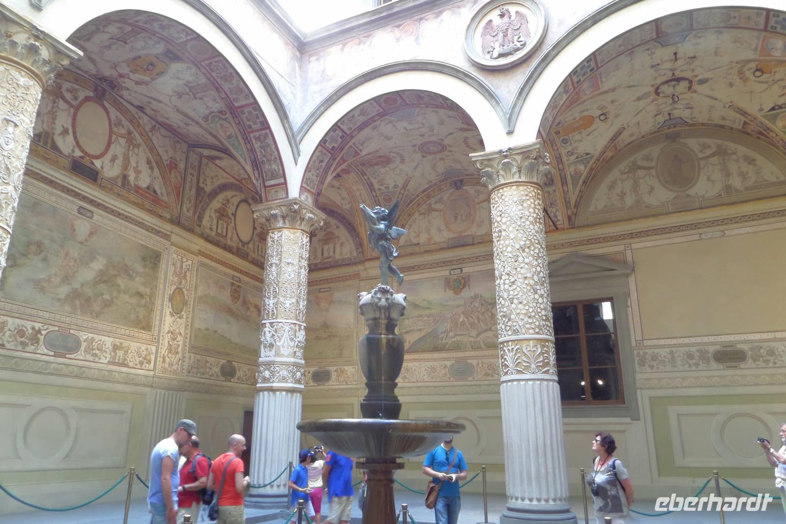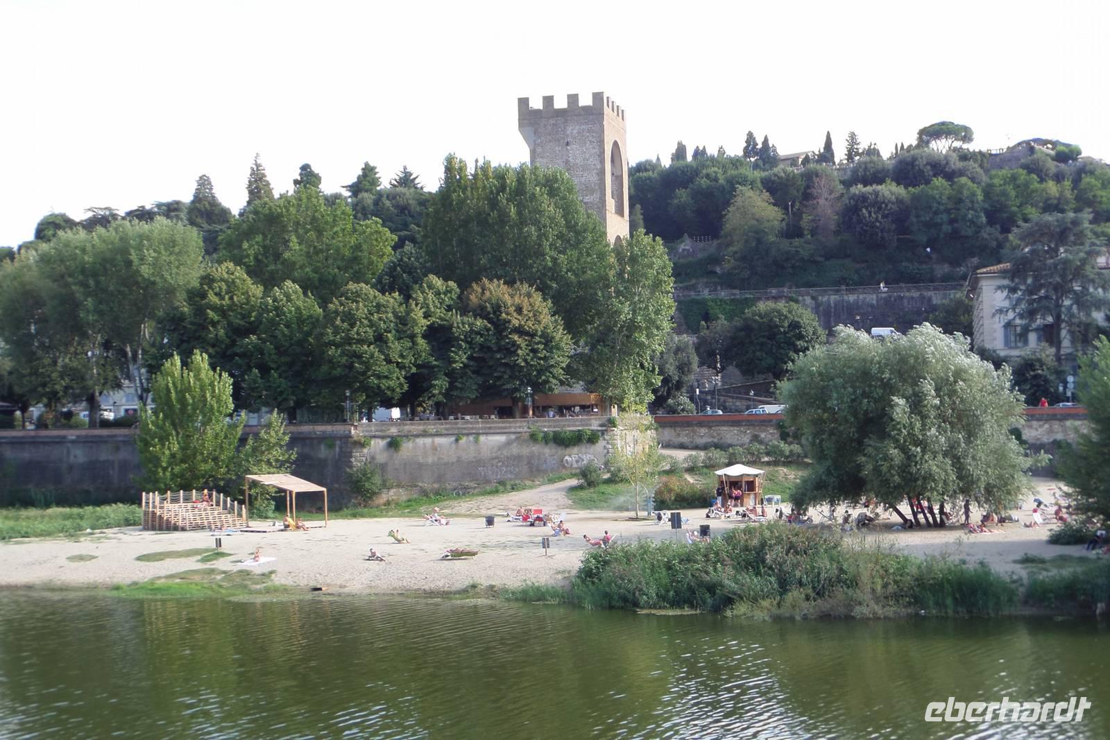 Wir werden von unserer charmanten Stadtführerin Angela zuerst mit dem Bus zum Aussichtspunkt Michelangelo über der Stadt gebracht, um diesen traumhaften Blick auf La Bella zu erleben. Wir lauschen den ganzen Tag über den sehr interessanten Ausführungen Angelas zur Welthauptstadt der Renaissance. Man kann natürlich an einem Tag nur einen kleinen Teil der Stadt erkunden. Die ganze Gruppe möchte die Franziskanerkirche Santa Croce, die größte und eine der bedeutendsten Franziskanerkirchen Italiens, besichtigen. Deshalb bezahlt Petra uns als Überraschung die Eintrittskarten. Der Legende nach hat der heilige Franz von Assisi selbst den Grundstein gelegt. Sie wird auch als „Pantheon von Florenz" bezeichnet, denn hier befinden sich neben Monumenten für viele berühmte Italiener, wie Dante Alighieri, auch die Grabmäler von Michelangelo und Galileo Galilei. Wir laufen durch das Rathaus auf die Piazza della Signoria und bewundern die Kopie von Michelangelos David und andere Skulpturen. Weiter bummeln wir über die Ponte Vecchio mit den Schmuckgeschäften zur Piazza Repubblica, um uns bei einer Mittagspause zu stärken. Am Nachmittag besichtigen wir die weltbekannte Kathedrale Santa Maria del Fiore mit ihrer berühmten Kuppel. Angela erklärt uns zuvor die Paradiespforte am Baptisterium. Nach etwas Freizeit treffen wir uns wieder am Bus, um zurückzufahren.