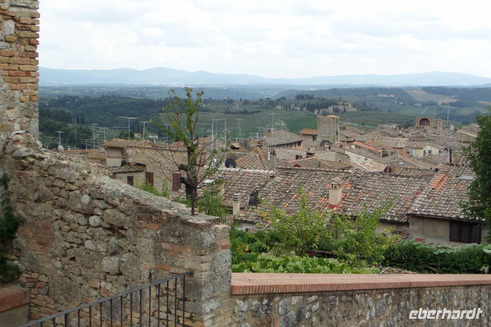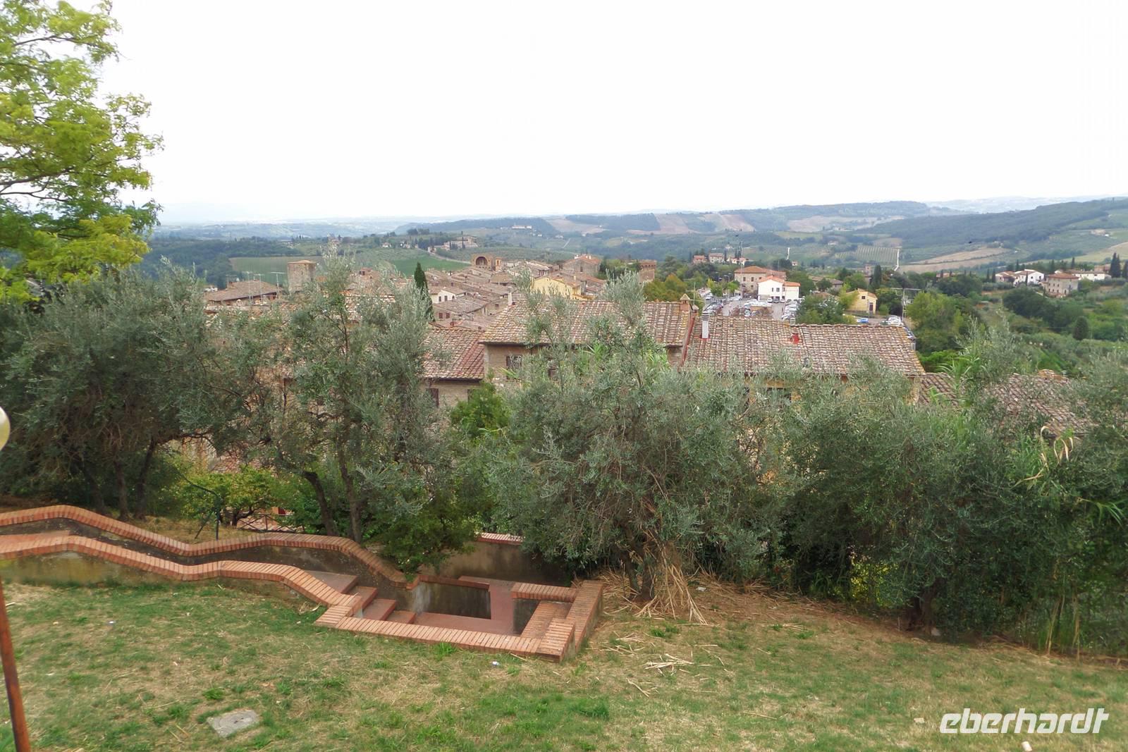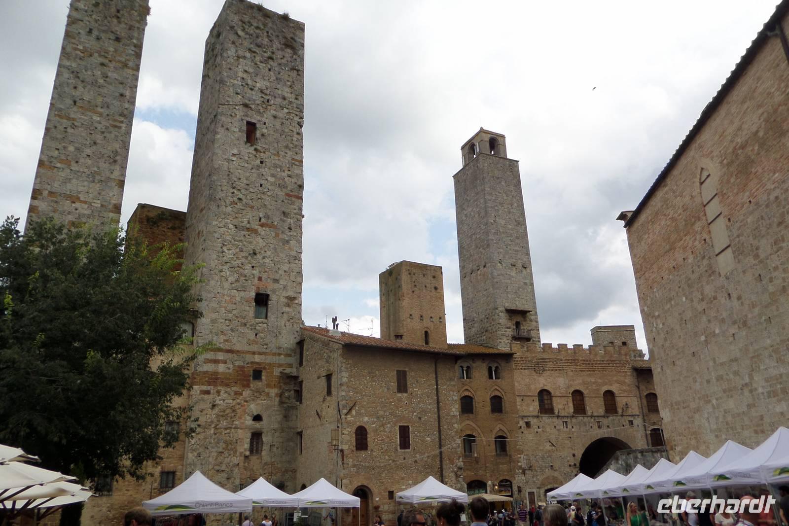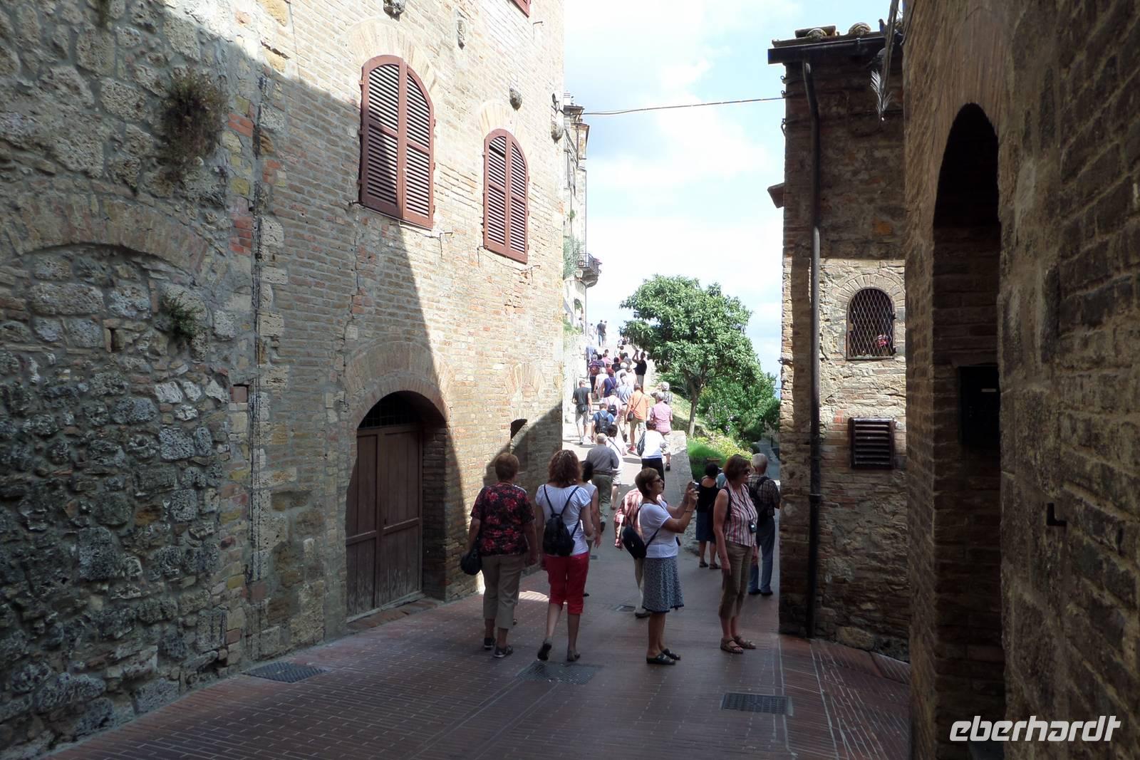Am Nachmittag erwartet uns Federica aus Siena wieder zu einem kleinen Rundgang durch San Gimignano. Schon von weitem grüßen die Geschlechtertürme. San Gimignano wird auch „Mittelalterliches Manhattan" oder „Stadt der Türme" bezeichnet und ist ein Anziehungsort ersten Ranges in der Toskana. Federica führt uns durch das Städtchen.