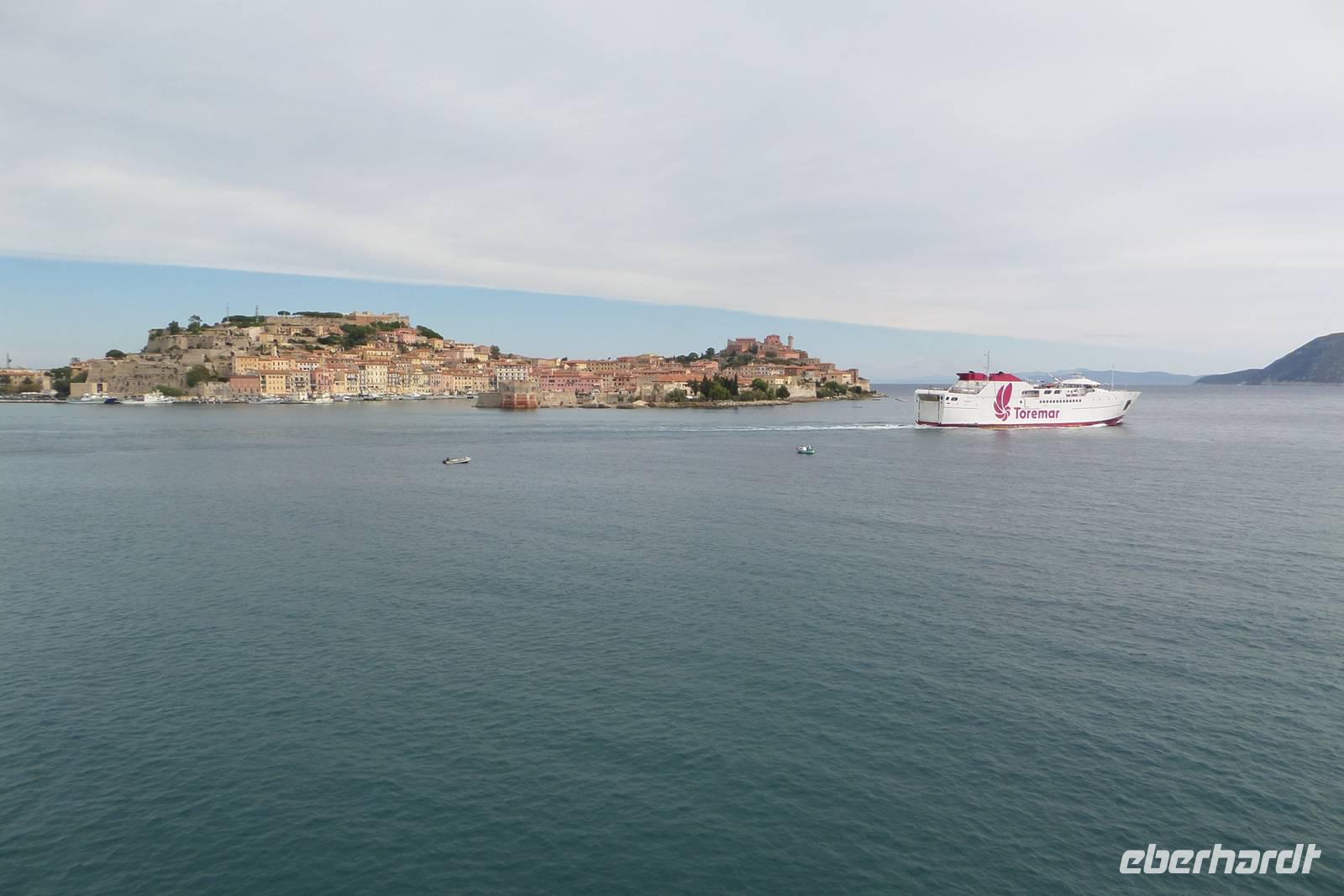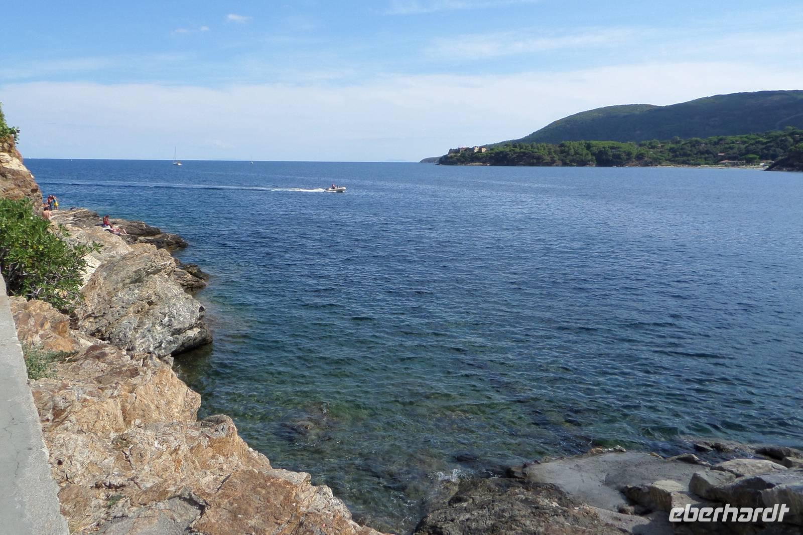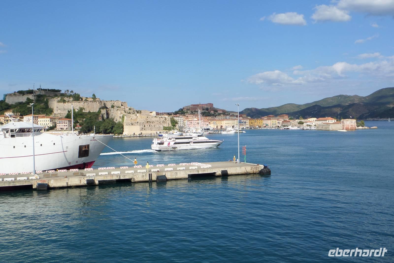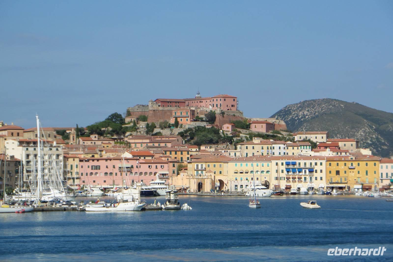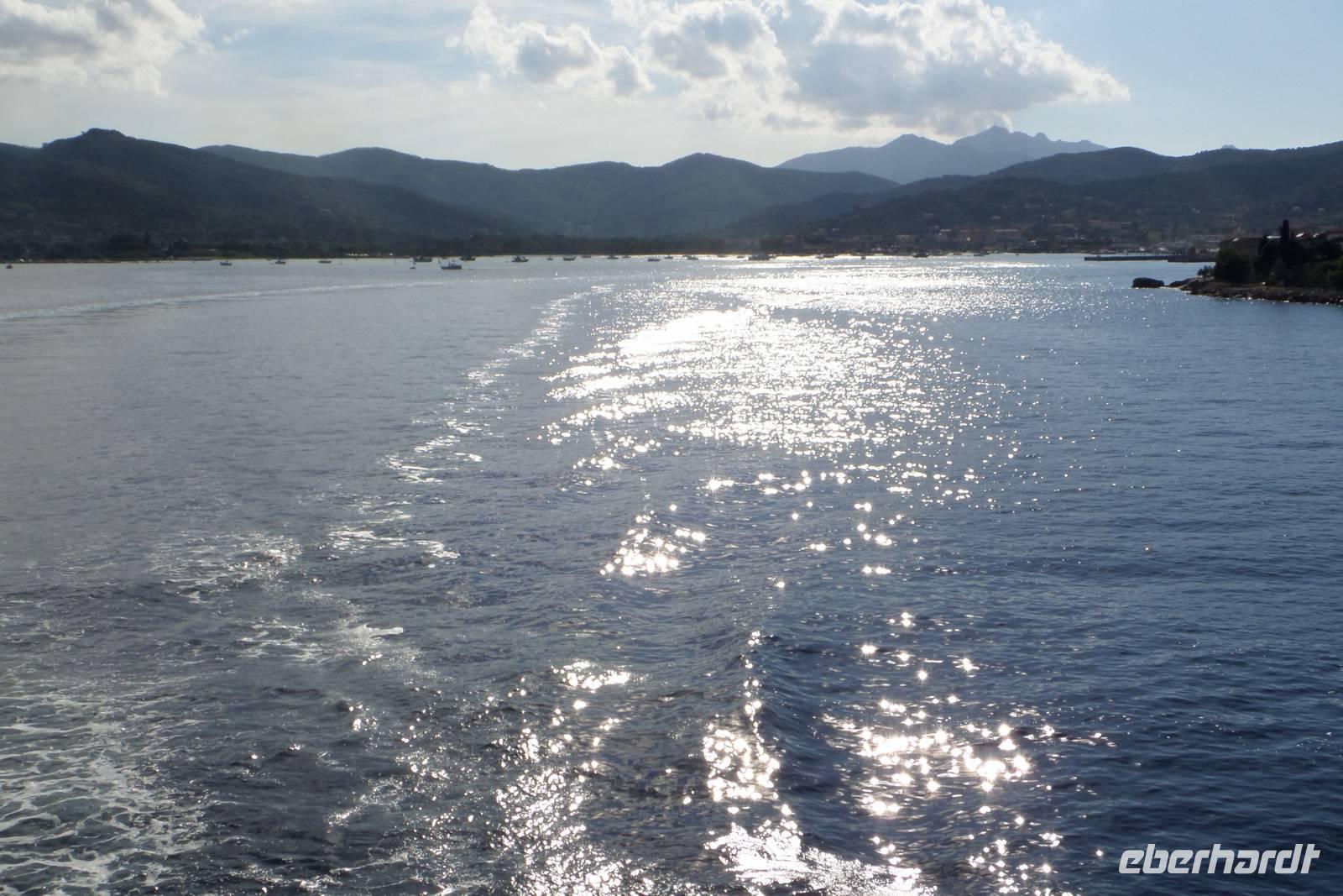In mehr als einer Stunde sind wir am Fährhafen in Piombino. Eine weitere Stunde vergeht, ehe wir auf der Insel Elba, die zum Toskanischen Archipel gehört, die Fähre in Portoferraio verlassen. Führerin Irene zeigt uns die Insel von Ihrer schönsten Seite und gibt uns viele interessante Informationen über die Geschichte. Da montags das Napoleonmuseum ge-schlossen ist, führt Irene uns nach Marciana Marina, wo wir landestypische Weine verkosten können. In unserer Mittagspause in Marina de Campo nehmen wir nach dem Essen auch noch ein herrliches Bad  und kühlen uns ab.