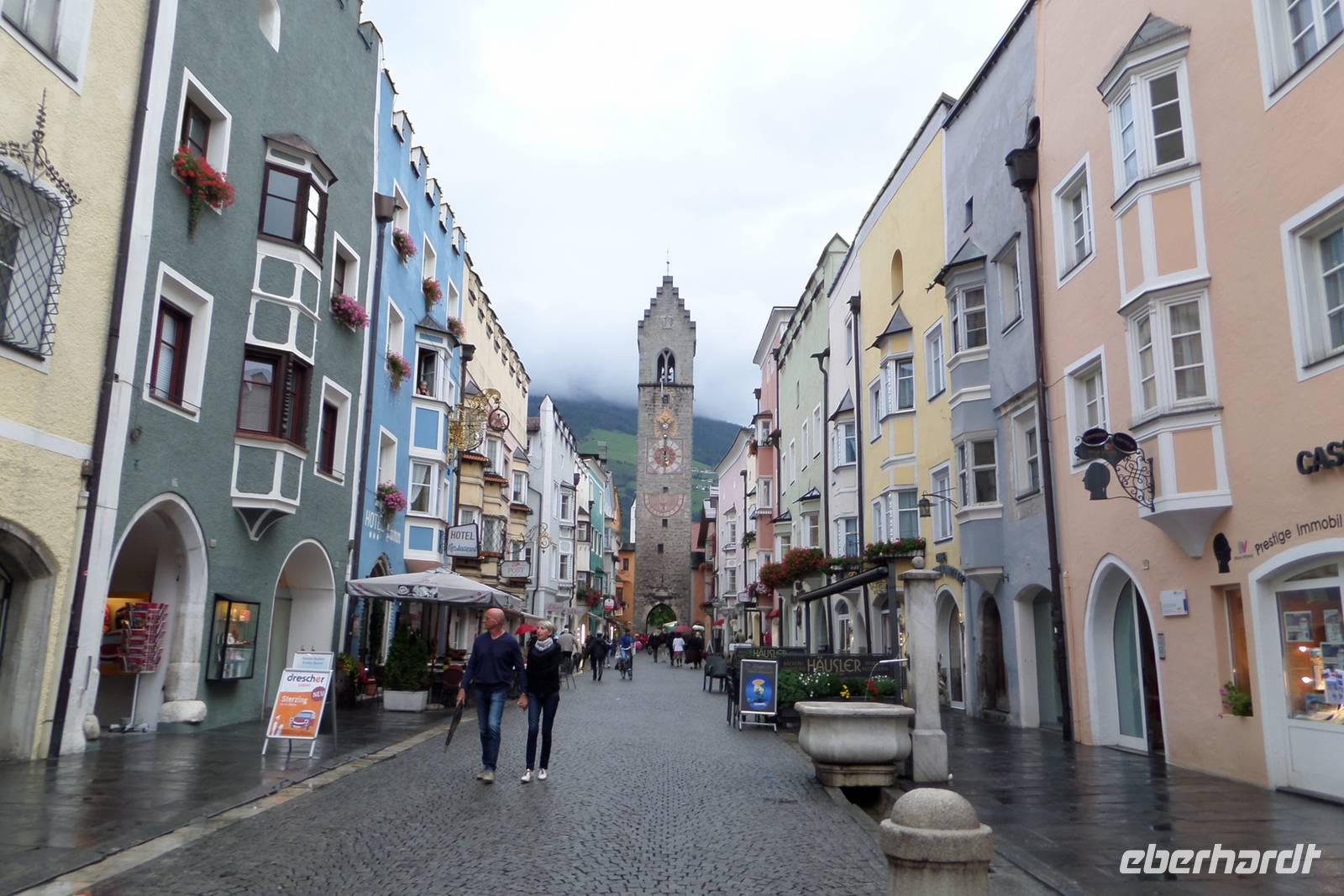 Da wir gut vorangekommen sind, haben wir noch eine Stunde Freizeit in Sterzing. Leider hat uns das heitere Sommerwetter verlassen, es ist ein Temperatursturz von 20° und es regnet. Einige Gäste sind auf den Wetterwechsel nicht vorbereitet. Aber wir kaufen noch einige Südtiroler Spezialitäten ein, ehe wir für eine Nacht Quartier im Hotel Brenner an der Autobahn nehmen und uns das südtiroler Abendessen schmecken lassen.