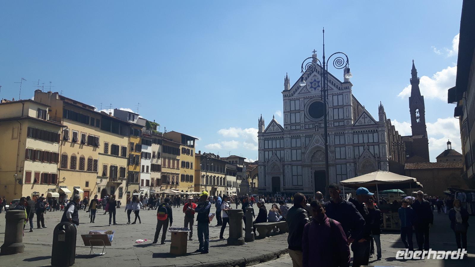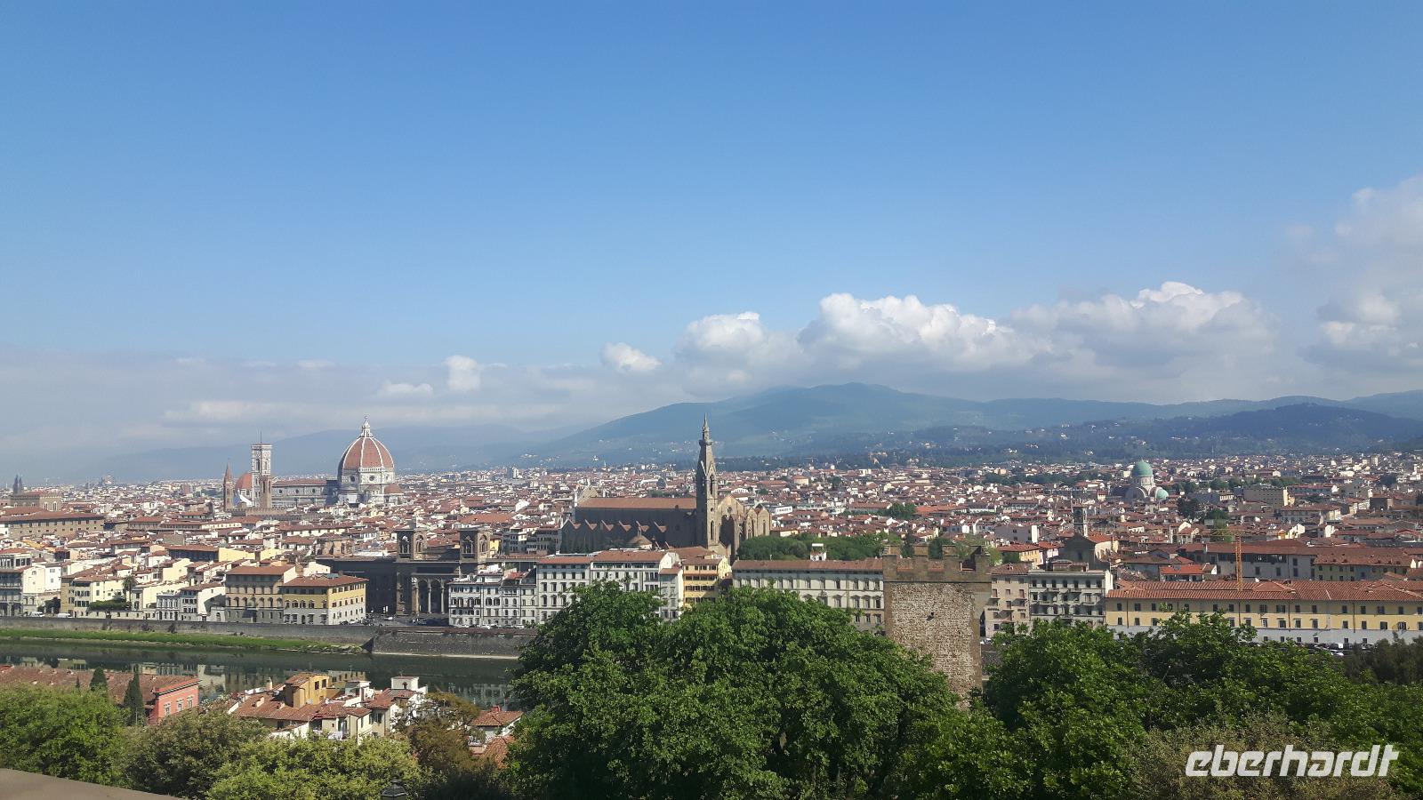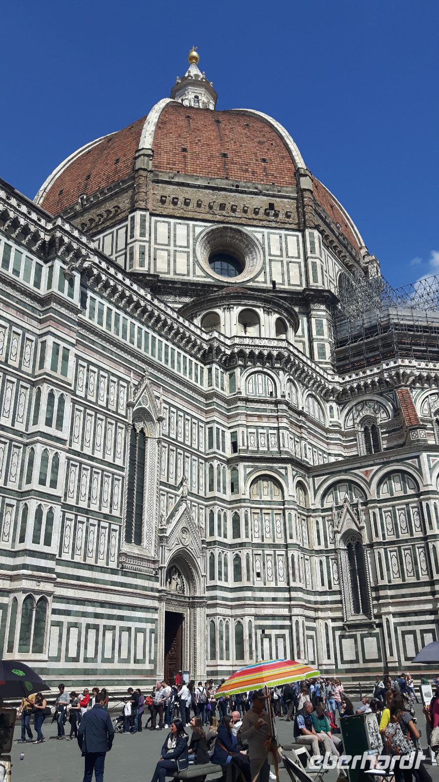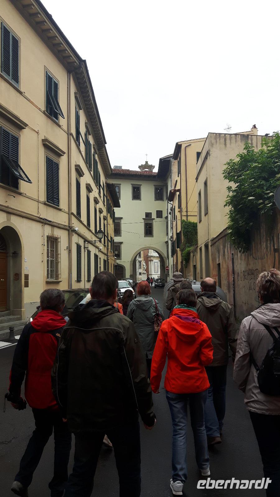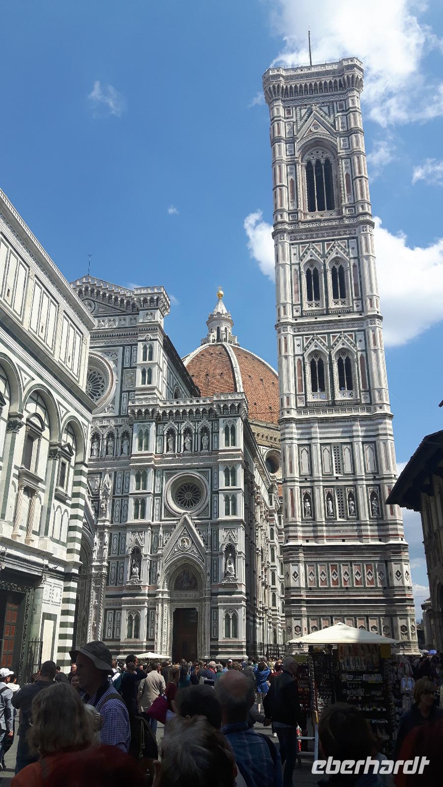 Für viele unserer Gäste stand heute ein großer Höhepunkt der Reise auf dem Tagesprogramm - es ging in die Hauptstadt der Toskana, nach Florenz. Unsere kompetente Stadtführerin Angela nahmen wir am zentralen Münzturm auf und zusammen fuhren wir direkt weiter hinauf zur Piazza Michelangelo. Hier erlebten wir einen imposanten Ausblick auf die wichtigsten Sehenswürdigkeiten der Stadt - wer sich einen ersten Überblick über Florenz schaffen möchte, sollte übrigens unbedingt hierher kommen! Am Torre della Zecca (Münzturm) stiegen wir schließlich aus dem Bus aus und von da an ging es zu Fuß weiter. Wir spazierten mit unserer netten Stadtführerin Angela zuerst zur Piazza Santa Croce, wo wir gemeinsam die Kirche Santa Croce (Kirche zum Heiligen Kreuz) besichtigten. Das gotische Kirchengebäude gehört zu den schönsten Gotteshäusern der Stadt und stammt aus dem 13. Jahrhundert. Neben ihrem sehenswerten Inneren ist sie vor allem wegen ihrer Grabmäler bekannt, unter anderem sahen wir das Grabmal von Michelangelo, Dante und Galilei und Machiavelli. Nach der ausführlichen Besichtigung flanierten wir bis zur Piazza della Signoria. Dieser wunderschöne Platz befindet sich im Zentrum der Altstadt und ist Mittelpunkt des florentinischen Stadtlebens. Weiter ging es vorbei an imposanten Plätzen und durch Straßen bzw. unzählige Gassen zur ältesten und berühmtesten Florentiner Arno-Brücke, der "Ponte Vecchio". Im Zweiten Weltkrieg wurde diese Brücke übrigens als einzige nicht gesprengt. Es gibt außerdem wohl weltweit kaum eine Brücke, die so überladen scheint wie die Ponte Vecchio. Früher befand sich an diesem Ort eine ganz einfache Holzbrücke, die jedoch immer wieder dem Hochwasser ausgesetzt war und einfach zu instabil wurde. Also baute man im 14. Jahrhundert die aktuelle Brücke, die den Fluss Arno überspannt und lediglich den Fußgängern ermöglicht, an das andere Ufer zu gelangen. Hier ist immer viel Trubel und wir schlenderten immer wieder vorbei an zahlreichen Juweliergeschäften, die immerhin an der Stelle von stinkenden Metzgereien eingerichtet worden. Eine Mittagspause legten wir an der Piazza della Repubblica ein, einem zentralen Platz, der erst im späten 19. Jahrhundert in seiner heutigen Größe anstelle des jüdischen Ghettos angelegt worden. Seine Bebauung entspricht den architektonischen Bestrebungen der Gründerzeit nach französischem Vorbild. Kulinarisch gestärkt spazierten wir zum Abschluss der Stadtführung zum Dom, den wir selbstverständlich auch von innen besichtigten. Der Dom Santa Maria del Fiore ist nach dem Petersdom in Rom und dem Mailänder Dom das drittgrößte Kirchenbauwerk Italiens und damit eines der größten Gotteshäuser der Welt. Er begeistert durch seine kunstvoll gestaltete Hauptfassade, die gigantische Kuppel, den Glockenturm und natürlich den hallenartigen Innenraum mit zahlreichen Kunstwerken. Der Innenraum wirkte im Vergleich zur Fassade auf uns allerdings eher sehr schlicht. Am Nachmittag hatten wir dann noch etwas Freizeit, um die Stadt individuell zu erkunden - Florenz ist eine faszinierende Stadt, für die man theoretisch einige Wochen benötigen würde! Aber zum Glück bietet Eberhardt TRAVEL auch Städtereisen nach Florenz an! Zurück in Montecatini Terme freuten wir uns heute auf ein Abendprogramm...! Wir spazierten nach dem Abendessen zur Funicolare-Talstation und dann ging es mit einer 1898 erbauten Standseilbahn nach Montecatini Alto hinauf. Dieses romantische kleine toskanische Bergdorf mit entzückenden kleinen Gassen liegt 260 Meter hoch und ist der alte Siedlungskern von Montecatini. Auf dem Hauptplatz machten es sich die meisten von uns bei einem oder auch zwei Gläschen Wein gemütlich und genossen einfach das abendliche Flair dieses bezaubernden kleinen Ortes!
