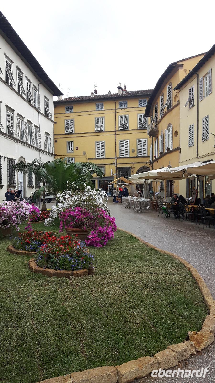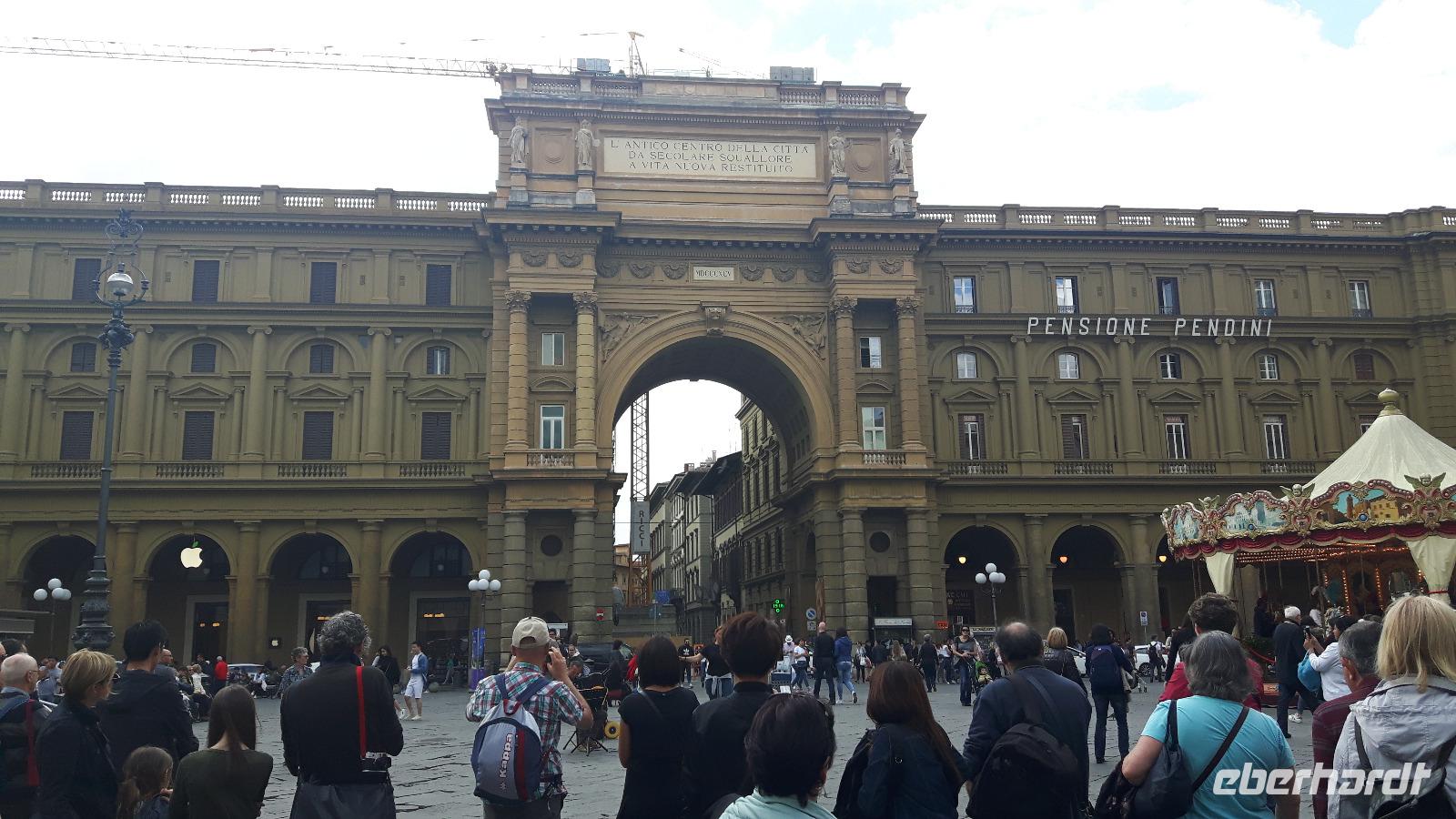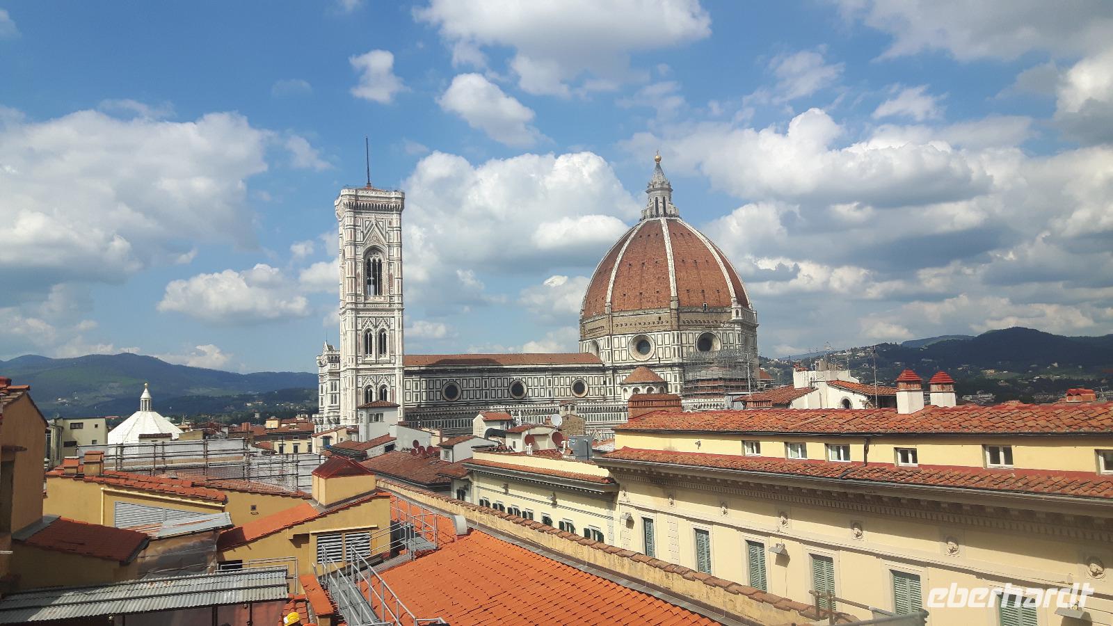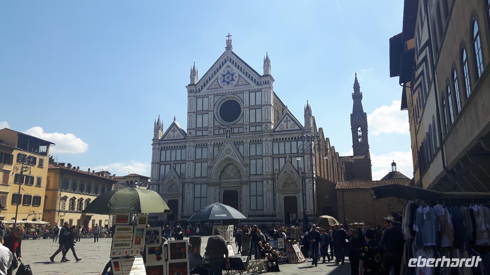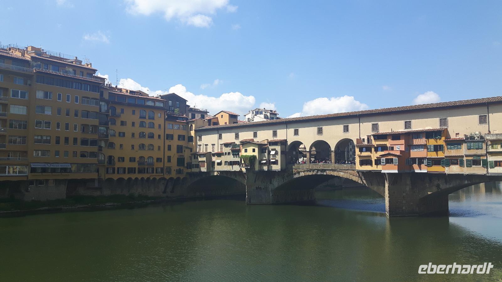 Für viele unserer Gäste stand heute ein großer Höhepunkt der Reise auf dem Tagesprogramm - es ging in die Hauptstadt der Toskana, nach Florenz. Unsere kompetente Stadtführerin Angela nahmen wir am zentralen Münzturm auf und zusammen fuhren wir direkt weiter hinauf zur Piazza Michelangelo. Hier erlebten wir einen imposanten Ausblick auf die wichtigsten Sehenswürdigkeiten der Stadt - wer sich einen ersten Überblick über Florenz schaffen möchte, sollte übrigens unbedingt hierher kommen! Am Torre della Zecca (Münzturm) stiegen wir schließlich aus dem Bus aus und von da an ging es zu Fuß weiter. Wir spazierten mit unserer netten Stadtführerin Angela zuerst zur Piazza Santa Croce, wo wir gemeinsam die Kirche Santa Croce (Kirche zum Heiligen Kreuz) besichtigten. Das gotische Kirchengebäude gehört zu den schönsten Gotteshäusern der Stadt und stammt aus dem 13. Jahrhundert. Neben ihrem sehenswerten Inneren ist sie vor allem wegen ihrer Grabmäler bekannt, unter anderem sahen wir das Grabmal von Michelangelo, Dante und Galilei und Machiavelli. Nach der ausführlichen Besichtigung flanierten wir bis zur Piazza della Signoria. Dieser wunderschöne Platz befindet sich im Zentrum der Altstadt und ist Mittelpunkt des florentinischen Stadtlebens. Weiter ging es vorbei an imposanten Plätzen und durch Straßen bzw. unzählige Gassen zur ältesten und berühmtesten Florentiner Arno-Brücke, der "Ponte Vecchio". Im Zweiten Weltkrieg wurde diese Brücke übrigens als einzige nicht gesprengt. Es gibt außerdem wohl weltweit kaum eine Brücke, die so überladen scheint wie die Ponte Vecchio. Früher befand sich an diesem Ort eine ganz einfache Holzbrücke, die jedoch immer wieder dem Hochwasser ausgesetzt war und einfach zu instabil wurde. Also baute man im 14. Jahrhundert die aktuelle Brücke, die den Fluss Arno überspannt und lediglich den Fußgängern ermöglicht, an das andere Ufer zu gelangen. Hier ist immer viel Trubel und wir schlenderten immer wieder vorbei an zahlreichen Juweliergeschäften, die immerhin an der Stelle von stinkenden Metzgereien eingerichtet worden. Eine Mittagspause legten wir an der Piazza della Repubblica ein, einem zentralen Platz, der erst im späten 19. Jahrhundert in seiner heutigen Größe anstelle des jüdischen Ghettos angelegt worden. Seine Bebauung entspricht den architektonischen Bestrebungen der Gründerzeit nach französischem Vorbild. Kulinarisch gestärkt spazierten wir zum Abschluss der Stadtführung zum Dom, den wir selbstverständlich auch von innen besichtigten. Der Dom Santa Maria del Fiore ist nach dem Petersdom in Rom und dem Mailänder Dom das drittgrößte Kirchenbauwerk Italiens und damit eines der größten Gotteshäuser der Welt. Er begeistert durch seine kunstvoll gestaltete Hauptfassade, die gigantische Kuppel, den Glockenturm und natürlich den hallenartigen Innenraum mit zahlreichen Kunstwerken. Der Innenraum wirkte im Vergleich zur Fassade auf uns allerdings eher sehr schlicht. Am Nachmittag hatten wir dann noch etwas Freizeit, um die Stadt individuell zu erkunden - Florenz ist eine faszinierende Stadt, für die man theoretisch einige Wochen benötigen würde! Aber zum Glück bietet Eberhardt TRAVEL auch Städtereisen nach Florenz an! Zurück in Montecatini Terme freuten wir uns heute auf ein Abendprogramm...! Wir spazierten nach dem Abendessen zur Funicolare-Talstation und dann ging es mit einer 1898 erbauten Standseilbahn nach Montecatini Alto hinauf. Dieses romantische kleine toskanische Bergdorf mit entzückenden kleinen Gassen liegt 260 Meter hoch und ist der alte Siedlungskern von Montecatini. Auf dem Hauptplatz machten es sich die meisten von uns bei einem oder auch zwei Gläschen Wein gemütlich und genossen einfach das abendliche Flair dieses bezaubernden kleinen Ortes!