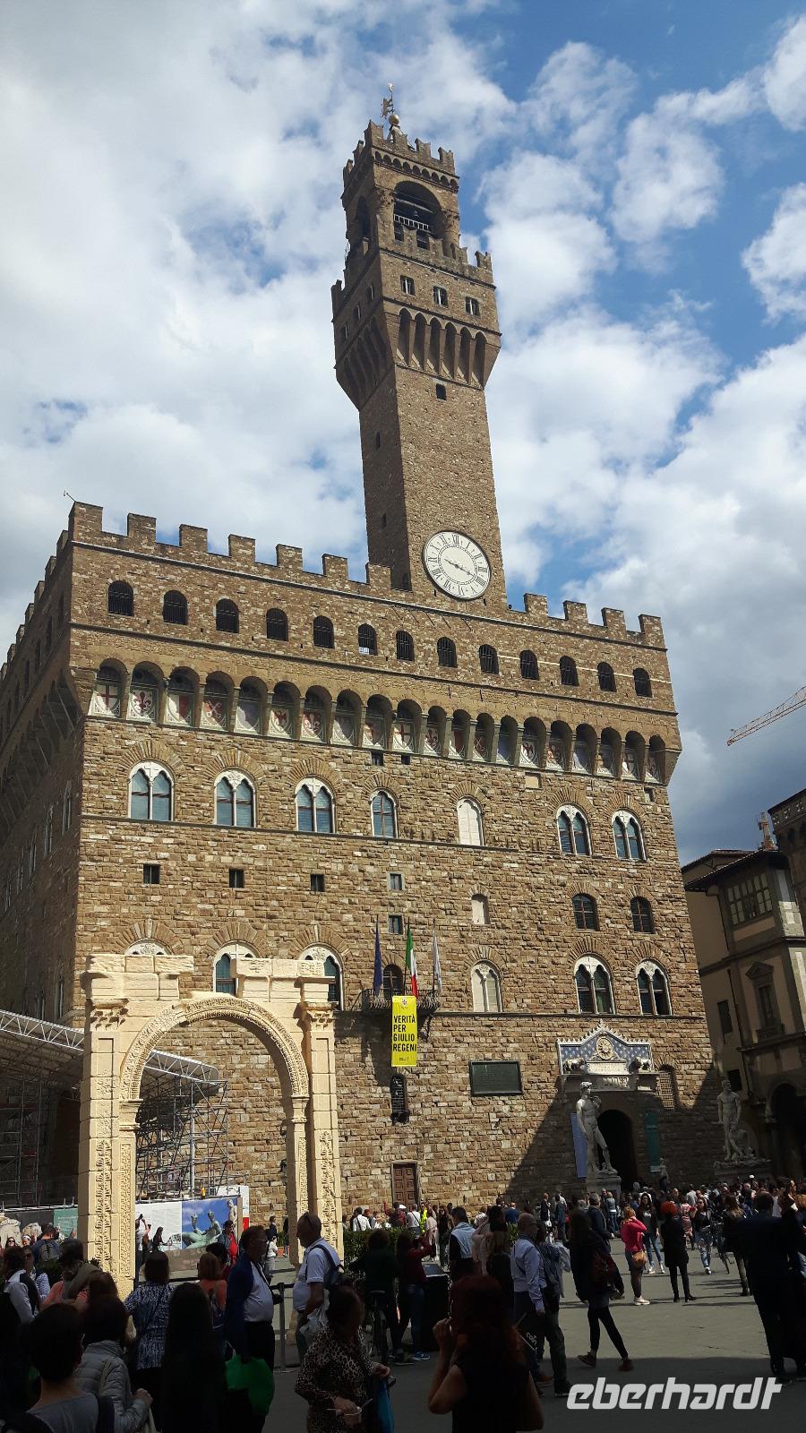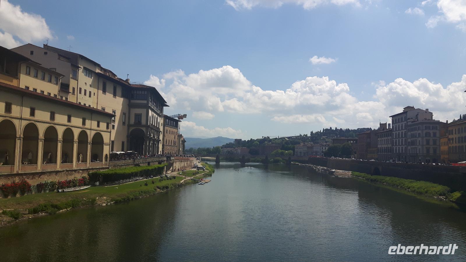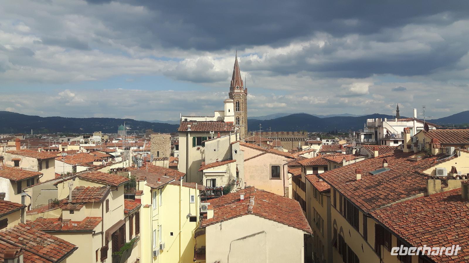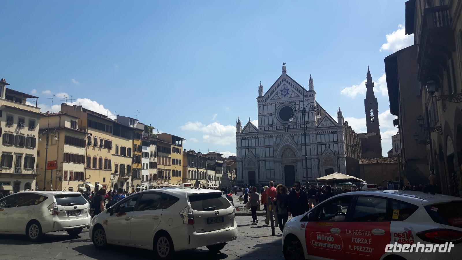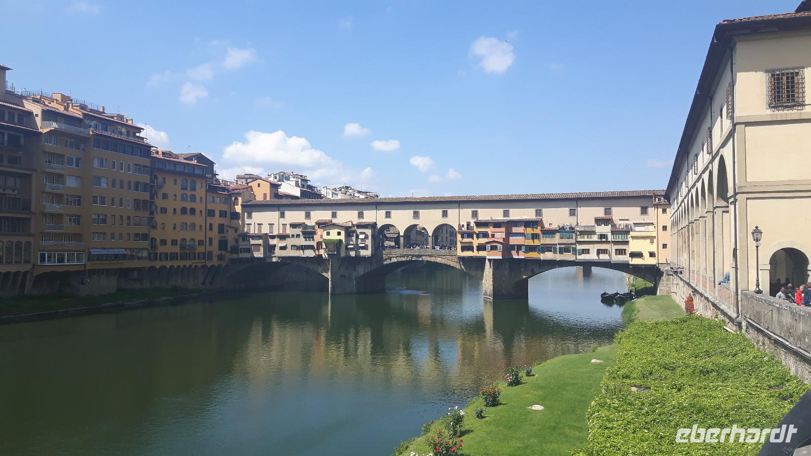 Für viele unserer Gäste stand heute ein großer Höhepunkt der Reise auf dem Tagesprogramm - es ging in die Hauptstadt der Toskana, nach Florenz. Unsere kompetente Stadtführerin Angela nahmen wir am zentralen Münzturm auf und zusammen fuhren wir direkt weiter hinauf zur Piazza Michelangelo. Hier erlebten wir einen imposanten Ausblick auf die wichtigsten Sehenswürdigkeiten der Stadt - wer sich einen ersten Überblick über Florenz schaffen möchte, sollte übrigens unbedingt hierher kommen! Am Torre della Zecca (Münzturm) stiegen wir schließlich aus dem Bus aus und von da an ging es zu Fuß weiter. Wir spazierten mit unserer netten Stadtführerin Angela zuerst zur Piazza Santa Croce, wo wir gemeinsam die Kirche Santa Croce (Kirche zum Heiligen Kreuz) besichtigten. Das gotische Kirchengebäude gehört zu den schönsten Gotteshäusern der Stadt und stammt aus dem 13. Jahrhundert. Neben ihrem sehenswerten Inneren ist sie vor allem wegen ihrer Grabmäler bekannt, unter anderem sahen wir das Grabmal von Michelangelo, Dante und Galilei und Machiavelli. Nach der ausführlichen Besichtigung flanierten wir bis zur Piazza della Signoria. Dieser wunderschöne Platz befindet sich im Zentrum der Altstadt und ist Mittelpunkt des florentinischen Stadtlebens. Weiter ging es vorbei an imposanten Plätzen und durch Straßen bzw. unzählige Gassen zur ältesten und berühmtesten Florentiner Arno-Brücke, der "Ponte Vecchio". Im Zweiten Weltkrieg wurde diese Brücke übrigens als einzige nicht gesprengt. Es gibt außerdem wohl weltweit kaum eine Brücke, die so überladen scheint wie die Ponte Vecchio. Früher befand sich an diesem Ort eine ganz einfache Holzbrücke, die jedoch immer wieder dem Hochwasser ausgesetzt war und einfach zu instabil wurde. Also baute man im 14. Jahrhundert die aktuelle Brücke, die den Fluss Arno überspannt und lediglich den Fußgängern ermöglicht, an das andere Ufer zu gelangen. Hier ist immer viel Trubel und wir schlenderten immer wieder vorbei an zahlreichen Juweliergeschäften, die immerhin an der Stelle von stinkenden Metzgereien eingerichtet worden. Eine Mittagspause legten wir an der Piazza della Repubblica ein, einem zentralen Platz, der erst im späten 19. Jahrhundert in seiner heutigen Größe anstelle des jüdischen Ghettos angelegt worden. Seine Bebauung entspricht den architektonischen Bestrebungen der Gründerzeit nach französischem Vorbild. Kulinarisch gestärkt spazierten wir zum Abschluss der Stadtführung zum Dom, den wir selbstverständlich auch von innen besichtigten. Der Dom Santa Maria del Fiore ist nach dem Petersdom in Rom und dem Mailänder Dom das drittgrößte Kirchenbauwerk Italiens und damit eines der größten Gotteshäuser der Welt. Er begeistert durch seine kunstvoll gestaltete Hauptfassade, die gigantische Kuppel, den Glockenturm und natürlich den hallenartigen Innenraum mit zahlreichen Kunstwerken. Der Innenraum wirkte im Vergleich zur Fassade auf uns allerdings eher sehr schlicht. Am Nachmittag hatten wir dann noch etwas Freizeit, um die Stadt individuell zu erkunden - Florenz ist eine faszinierende Stadt, für die man theoretisch einige Wochen benötigen würde! Aber zum Glück bietet Eberhardt TRAVEL auch Städtereisen nach Florenz an! Zurück in Montecatini Terme freuten wir uns heute auf ein Abendprogramm...! Wir spazierten nach dem Abendessen zur Funicolare-Talstation und dann ging es mit einer 1898 erbauten Standseilbahn nach Montecatini Alto hinauf. Dieses romantische kleine toskanische Bergdorf mit entzückenden kleinen Gassen liegt 260 Meter hoch und ist der alte Siedlungskern von Montecatini. Auf dem Hauptplatz machten es sich die meisten von uns bei einem oder auch zwei Gläschen Wein gemütlich und genossen einfach das abendliche Flair dieses bezaubernden kleinen Ortes!