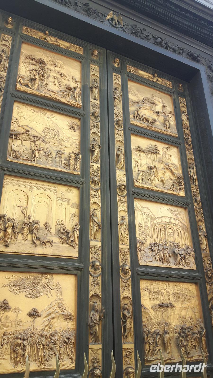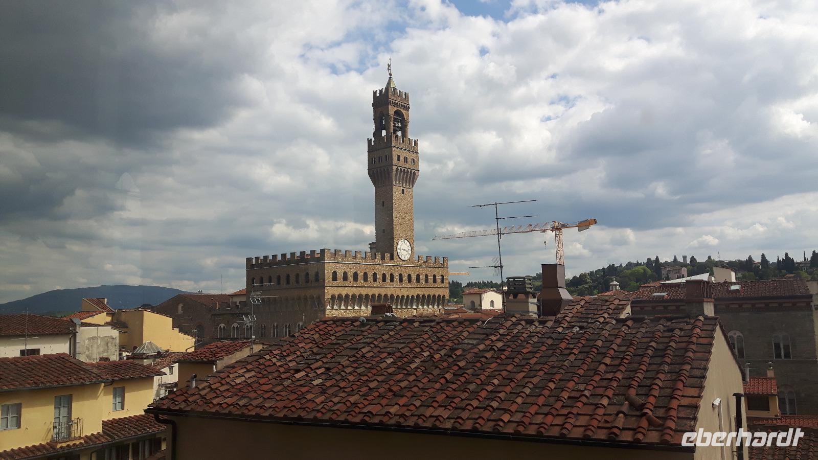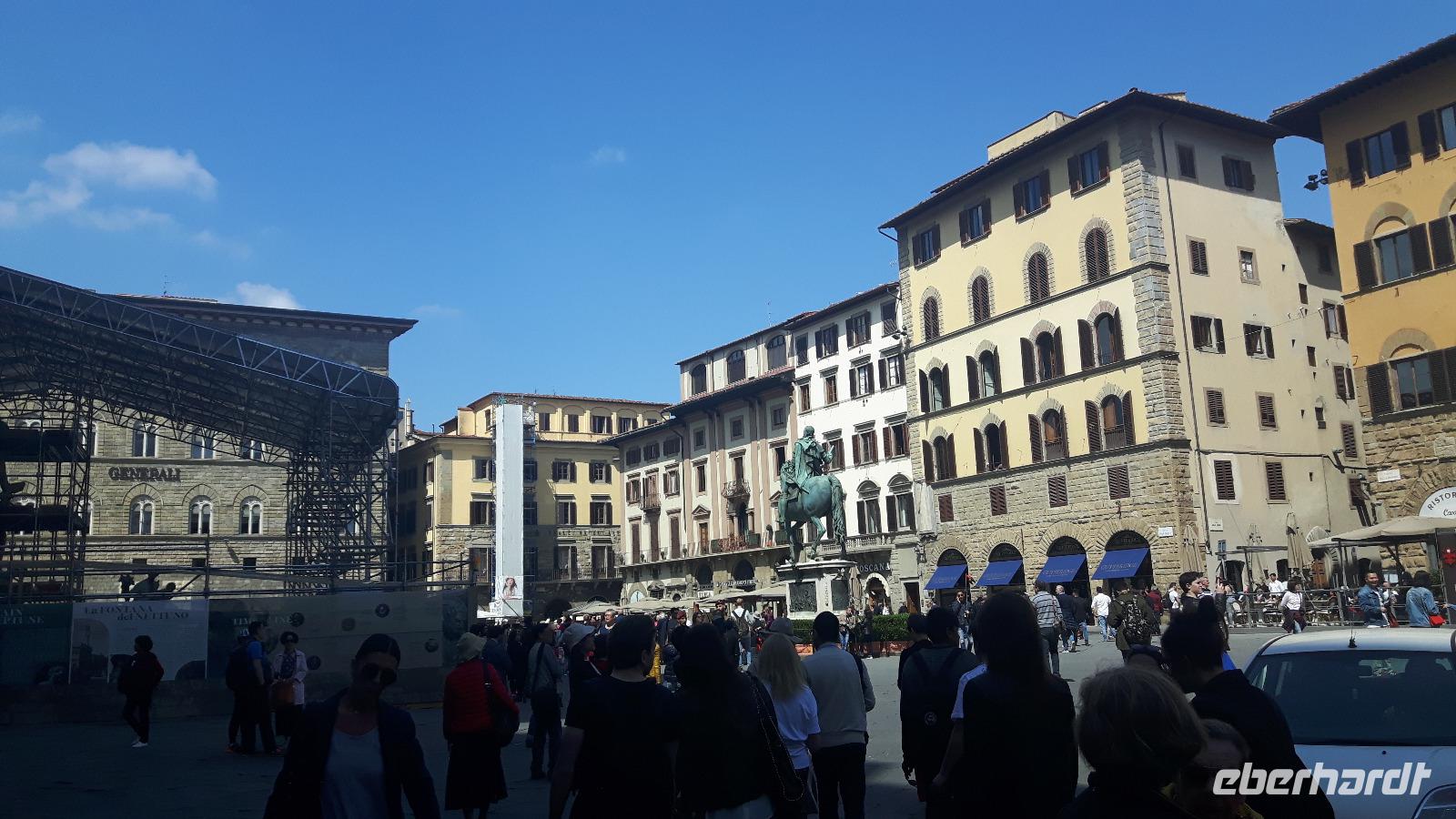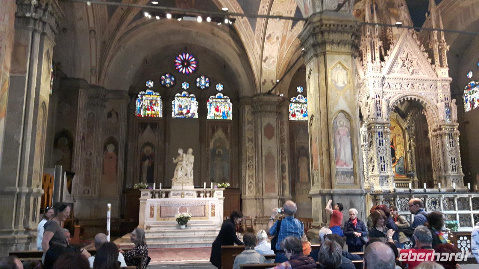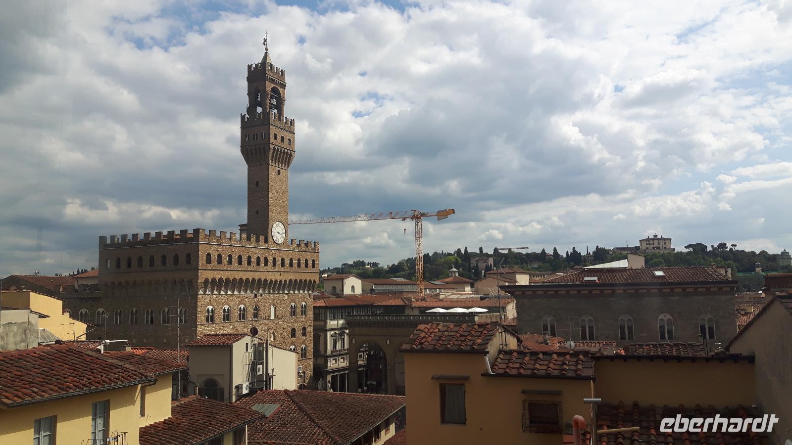 Für viele unserer Gäste stand heute ein großer Höhepunkt der Reise auf dem Tagesprogramm - es ging in die Hauptstadt der Toskana, nach Florenz. Unsere kompetente Stadtführerin Angela nahmen wir am zentralen Münzturm auf und zusammen fuhren wir direkt weiter hinauf zur Piazza Michelangelo. Hier erlebten wir einen imposanten Ausblick auf die wichtigsten Sehenswürdigkeiten der Stadt - wer sich einen ersten Überblick über Florenz schaffen möchte, sollte übrigens unbedingt hierher kommen! Am Torre della Zecca (Münzturm) stiegen wir schließlich aus dem Bus aus und von da an ging es zu Fuß weiter. Wir spazierten mit unserer netten Stadtführerin Angela zuerst zur Piazza Santa Croce, wo wir gemeinsam die Kirche Santa Croce (Kirche zum Heiligen Kreuz) besichtigten. Das gotische Kirchengebäude gehört zu den schönsten Gotteshäusern der Stadt und stammt aus dem 13. Jahrhundert. Neben ihrem sehenswerten Inneren ist sie vor allem wegen ihrer Grabmäler bekannt, unter anderem sahen wir das Grabmal von Michelangelo, Dante und Galilei und Machiavelli. Nach der ausführlichen Besichtigung flanierten wir bis zur Piazza della Signoria. Dieser wunderschöne Platz befindet sich im Zentrum der Altstadt und ist Mittelpunkt des florentinischen Stadtlebens. Weiter ging es vorbei an imposanten Plätzen und durch Straßen bzw. unzählige Gassen zur ältesten und berühmtesten Florentiner Arno-Brücke, der "Ponte Vecchio". Im Zweiten Weltkrieg wurde diese Brücke übrigens als einzige nicht gesprengt. Es gibt außerdem wohl weltweit kaum eine Brücke, die so überladen scheint wie die Ponte Vecchio. Früher befand sich an diesem Ort eine ganz einfache Holzbrücke, die jedoch immer wieder dem Hochwasser ausgesetzt war und einfach zu instabil wurde. Also baute man im 14. Jahrhundert die aktuelle Brücke, die den Fluss Arno überspannt und lediglich den Fußgängern ermöglicht, an das andere Ufer zu gelangen. Hier ist immer viel Trubel und wir schlenderten immer wieder vorbei an zahlreichen Juweliergeschäften, die immerhin an der Stelle von stinkenden Metzgereien eingerichtet worden. Eine Mittagspause legten wir an der Piazza della Repubblica ein, einem zentralen Platz, der erst im späten 19. Jahrhundert in seiner heutigen Größe anstelle des jüdischen Ghettos angelegt worden. Seine Bebauung entspricht den architektonischen Bestrebungen der Gründerzeit nach französischem Vorbild. Kulinarisch gestärkt spazierten wir zum Abschluss der Stadtführung zum Dom, den wir selbstverständlich auch von innen besichtigten. Der Dom Santa Maria del Fiore ist nach dem Petersdom in Rom und dem Mailänder Dom das drittgrößte Kirchenbauwerk Italiens und damit eines der größten Gotteshäuser der Welt. Er begeistert durch seine kunstvoll gestaltete Hauptfassade, die gigantische Kuppel, den Glockenturm und natürlich den hallenartigen Innenraum mit zahlreichen Kunstwerken. Der Innenraum wirkte im Vergleich zur Fassade auf uns allerdings eher sehr schlicht. Am Nachmittag hatten wir dann noch etwas Freizeit, um die Stadt individuell zu erkunden - Florenz ist eine faszinierende Stadt, für die man theoretisch einige Wochen benötigen würde! Aber zum Glück bietet Eberhardt TRAVEL auch Städtereisen nach Florenz an! Zurück in Montecatini Terme freuten wir uns heute auf ein Abendprogramm...! Wir spazierten nach dem Abendessen zur Funicolare-Talstation und dann ging es mit einer 1898 erbauten Standseilbahn nach Montecatini Alto hinauf. Dieses romantische kleine toskanische Bergdorf mit entzückenden kleinen Gassen liegt 260 Meter hoch und ist der alte Siedlungskern von Montecatini. Auf dem Hauptplatz machten es sich die meisten von uns bei einem oder auch zwei Gläschen Wein gemütlich und genossen einfach das abendliche Flair dieses bezaubernden kleinen Ortes!