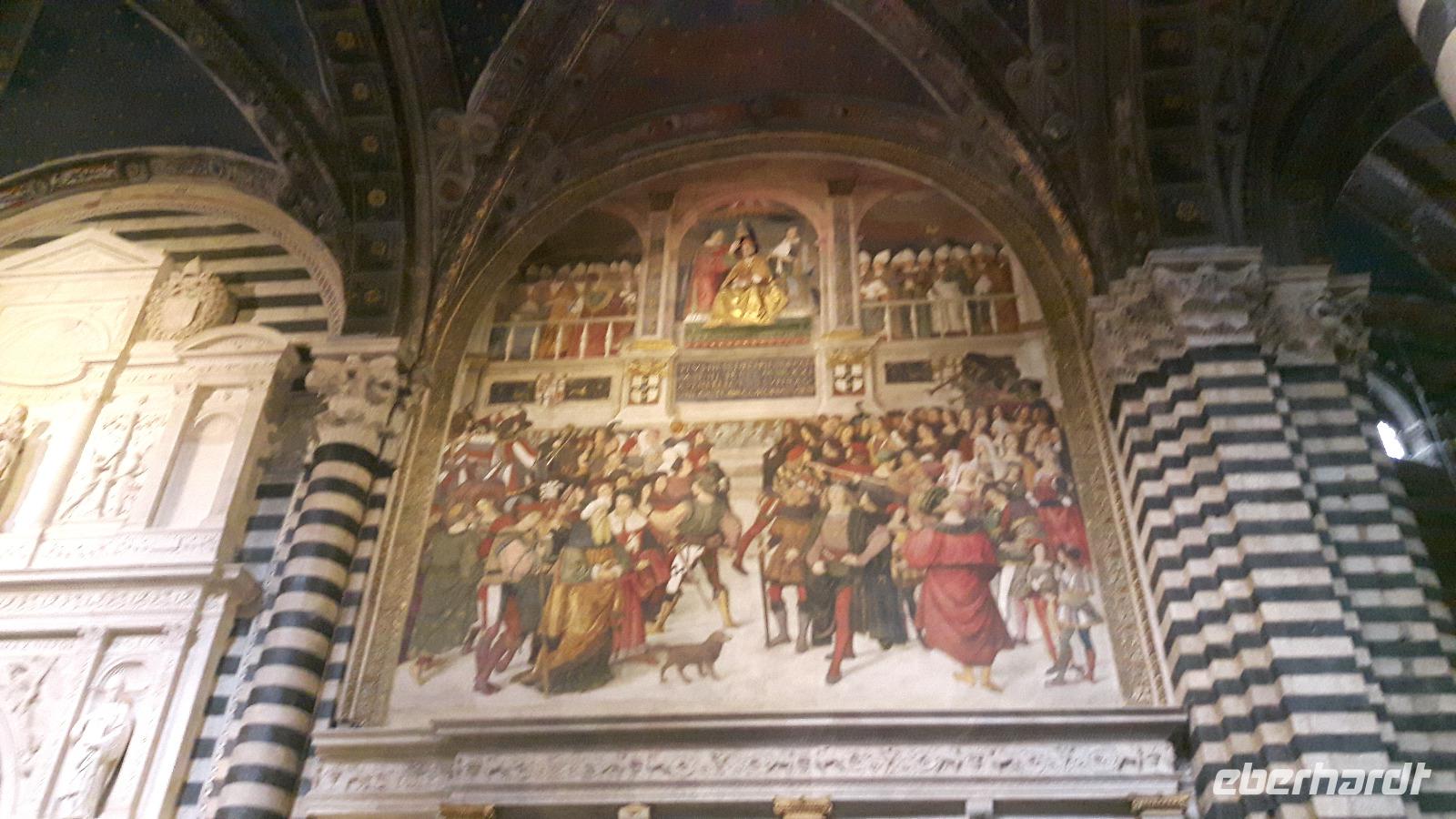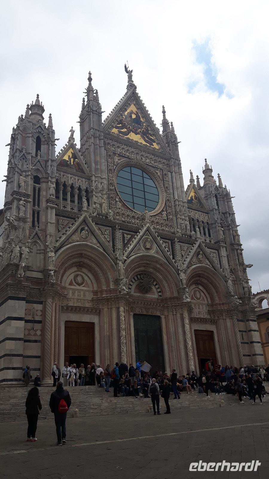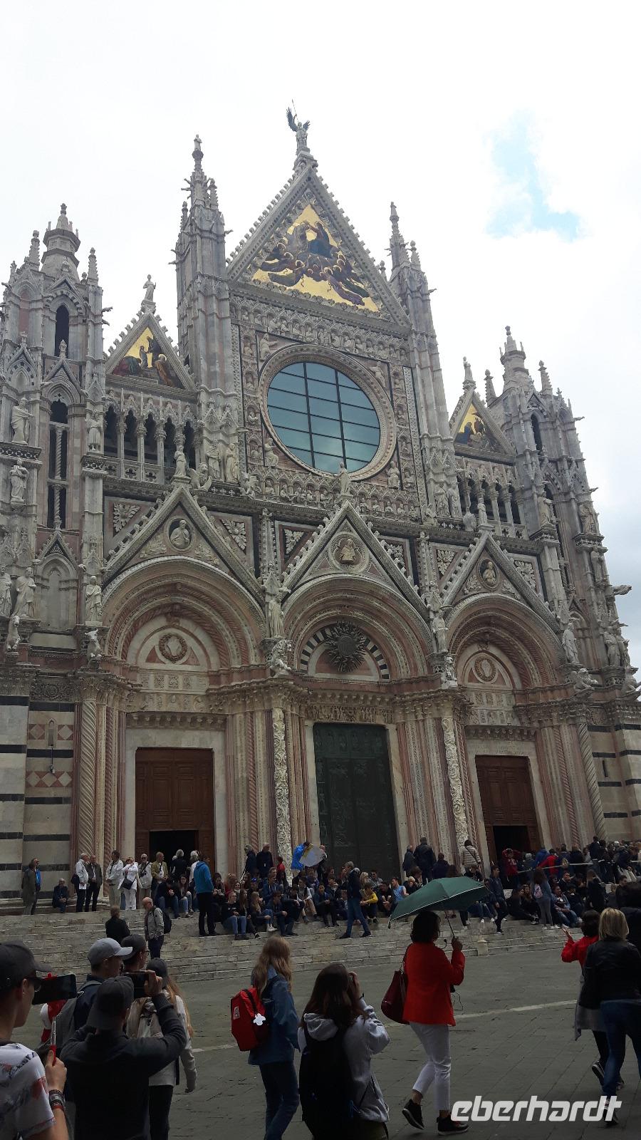 Heute zog es uns nach Siena und bereits am Vormittag trafen wir ganz pünktlich auf unsere Stadtführerin Susanne, die uns diese reizvolle Stadt näher bringen durfte. Die Stadt ist immerhin auf drei Hügeln aus Backstein erbaut - daher auch die Aufteilung in "Terzi", was übersetzt so viel wie drei Stadtteile bedeutet. Der Rathausturm ist von fast allen Seiten der Stadt auszumachen, denn dieser ragt wie ein Pfeil aus der Mitte der Hügel mit ihrem Gewirr von ziegelfarbigen Häusern und steil ansteigenden Gassen empor. Im Gegensatz dazu lagert der schwarz-weiß gestreifte Dom aus Marmor breit und majestätisch auf der höchsten Erhebung. Es gibt viele Theorien zum Ursprung dieser Stadt und entsprechend viele Legenden - Susanne erzählte so einige Geschichten zur interessanten Stadtgeschichte. Wir spazierten durch die mittelalterliche Altstadt, dessen Mittelpunkt übrigens die Piazza del Campo, der weiträumige Vorplatz der mächtigen Rathausfront, bildet . Hier wird übrigens auch zweimal im Jahr das berühmteste Pferderennen der Welt, der "Palio" ausgetragen. Nach etwas Freizeit und mit zahlreichen tollen Eindrücken versehen, fuhren wir am Nachmittag weiter zum idyllisch gelegenen und familien-geführten Weingut "Montaioncino" in der Nähe von Empoli, wo wir bereits vom Besitzer Mauro und einem Teil seiner Familie freudig erwartet wurden. Hier waren wir nunmehr inmitten der herrlich ausgedehnten toskanischen Landschaft angekommen - die beste Gelegenheit für ein schönes Gruppenfoto! Die hiesigen örtlichen Bedingungen sind einfach ideal für einen qualitativen Wein- und Olivenanbau! Wir verkosteten fünf auserlesene Weine und dazu gab es natürlich auch etwas Zünftiges zu essen - so unter anderem Schinkenspeck, Salami und Käse; übrigens alles sehr lecker!!! Bestens gelaunt fuhren wir am späten Nachmittag nach Montecatini Terme zurück.