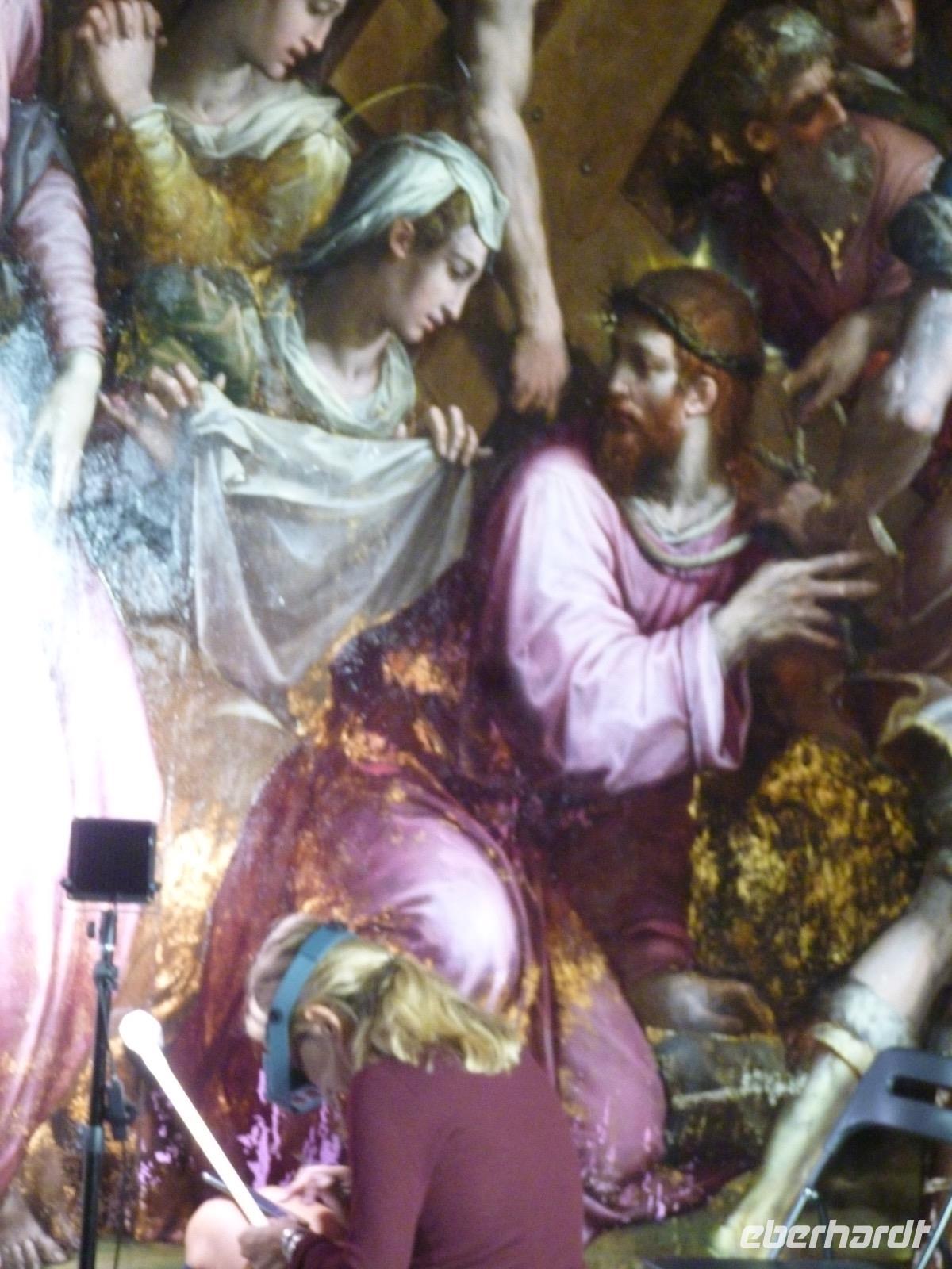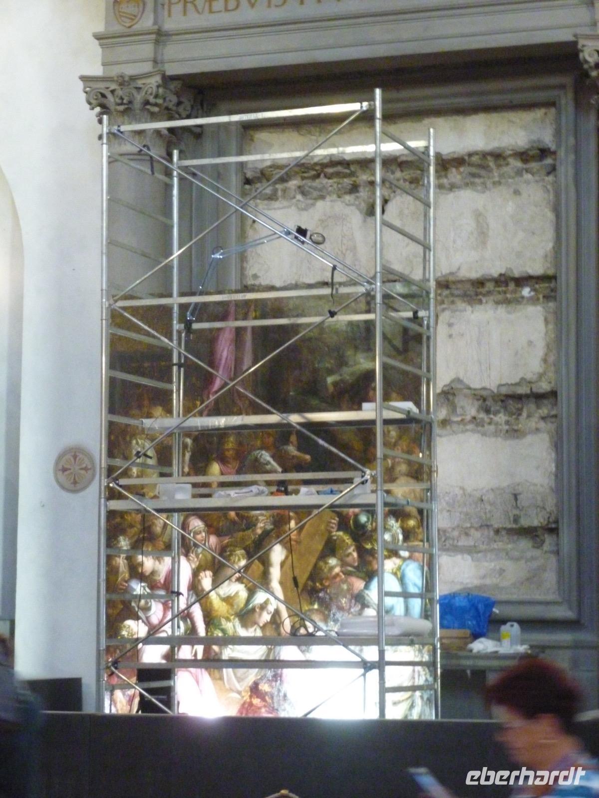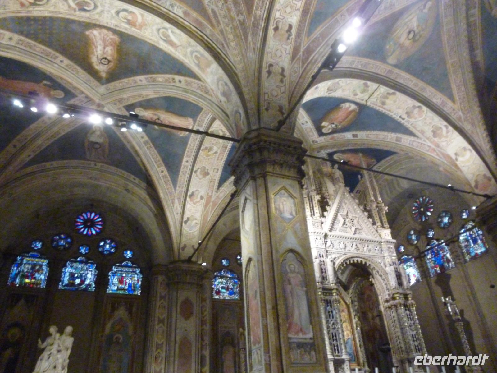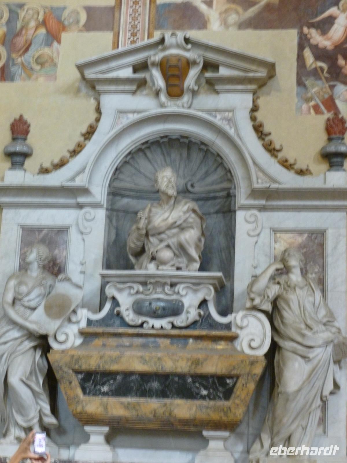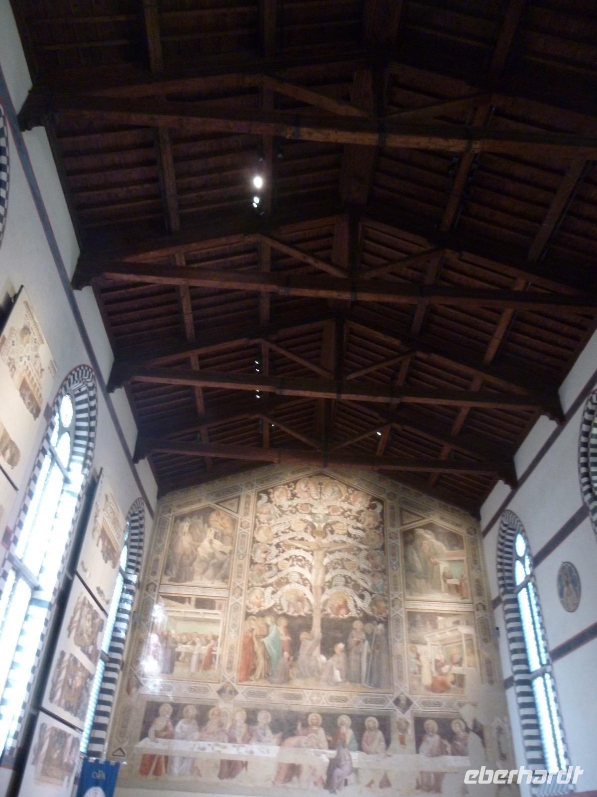 Neben der Stadt, die den Dombau finanzierte, waren Ordensgemeinschaften die fleißigen Kirchenbauer. Dazu gehört die von den Franziskanern erbaute Santa Croce mit Grabmälern der berühmtesten Bürger der Stadt. Zu den schönsten Kapellen gehört die von Giotto ausgemalte Peruzzikapelle (deren Birnenwappen entdeckten wir auf dem Boden).