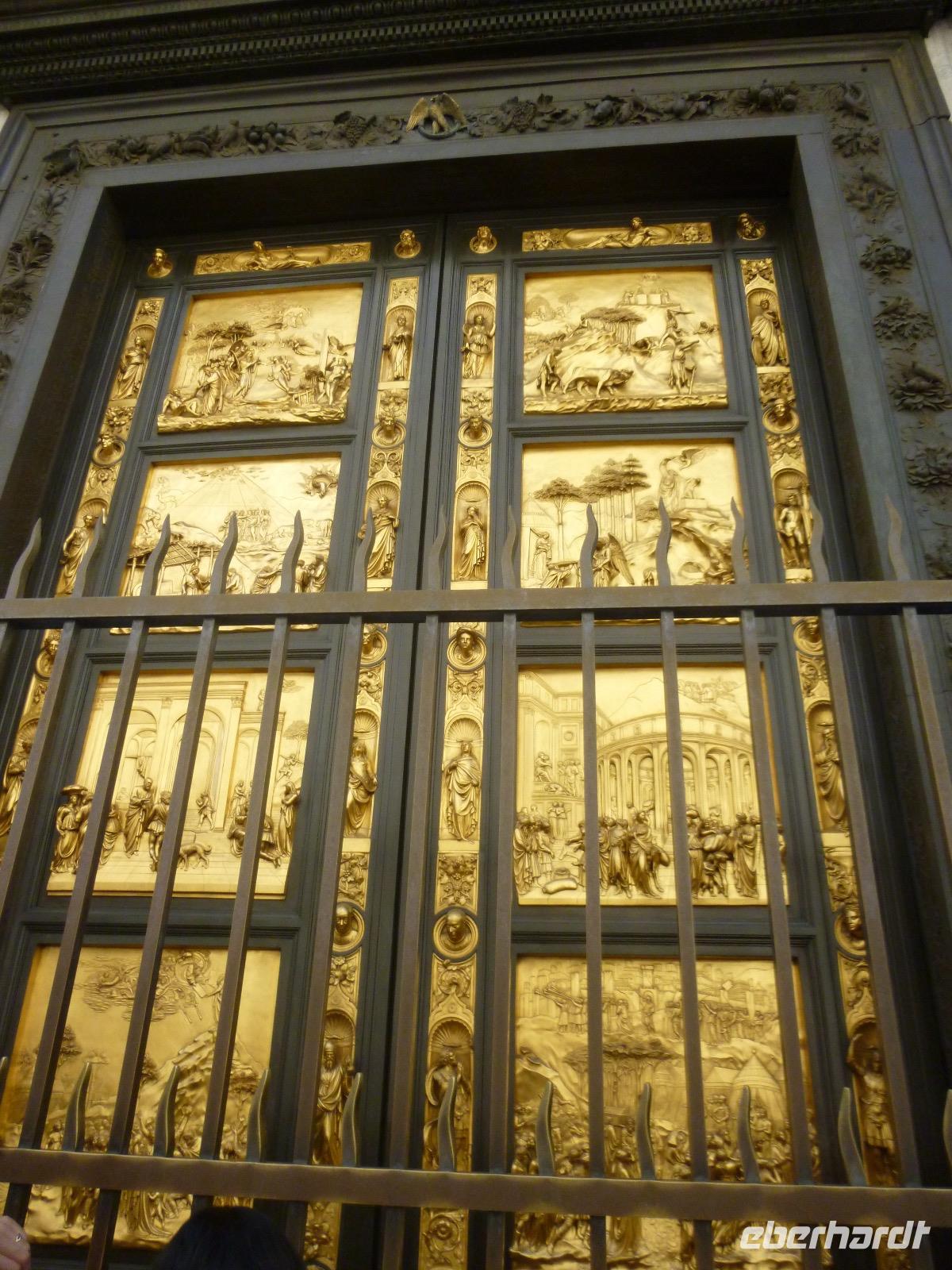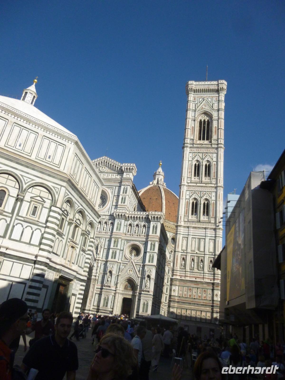 Die älteste Brücke von Florenz bietet heute Juwelieren Raum, früher waren es Gerber, Fischhändler und Metzger. In ihrer Mitte die Büste des bekannten Goldschmieds Cellini. Frühmorgens ist es hier möglicherweise ruhiger, doch wir waren umgeben von Menschen - jedoch zur Hauptsaison sind es noch mehr. Weiter ging es zum einmaligen Ensemble des Domplatzes: Das Wahrzeichen der Stadt und viertgrößter Christendom (15. Jh.) zeigt neben Torre und Baptisterium auch das Dommuseum auf dem Platz (Nordseite). Immer wieder beeindruckt die Paradiestür des Baptisteriums, umlagert von Menschen.
