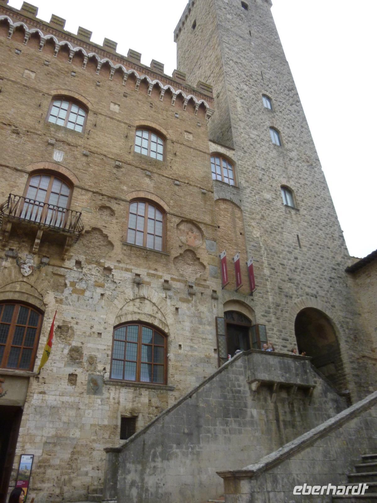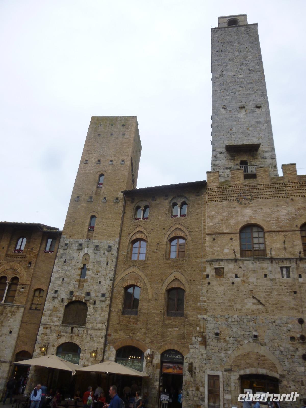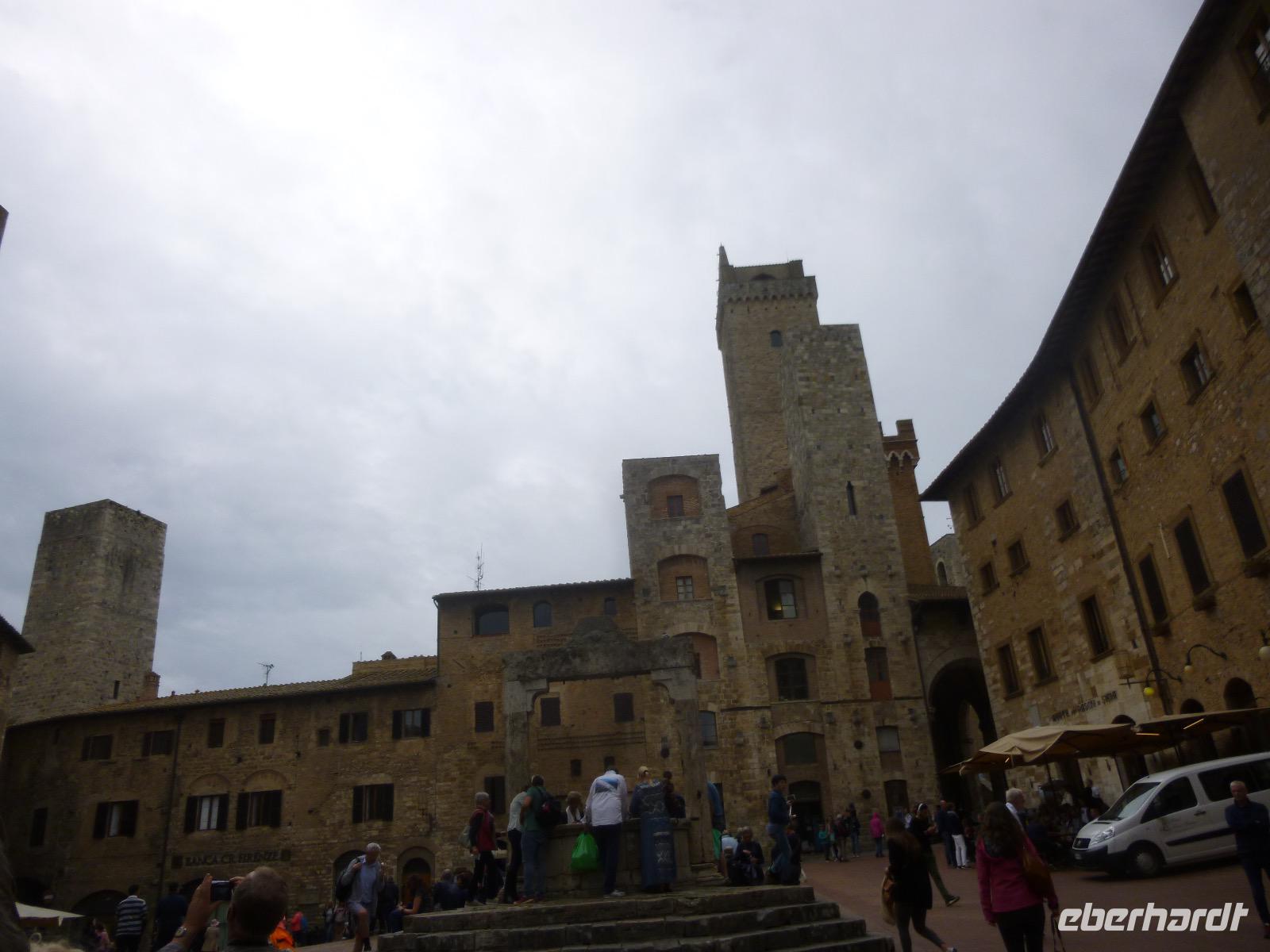 San Gimignano liegt zwischen Siena und Florenz und wurde in der Blütezeit von 72 Türmen überragt: ein Wettkampf um Macht und Geld. Heute stehen noch 14 Türme, von der UNESCO zum Weltkulturerbe erklärt. Den örtlichen Dom unterhalb der florentinischen Montespertoli-Festung erbaute man ab dem 11. Jahrhundert. Er birgt einen Fresken-Bilderbogen u.a. mit Szenen aus dem Leben der heiligen Fina. Auch die Fresken am Rathaus (Stadtmuseum) sind interessant, der 54m-Turm lässt sich besteigen.