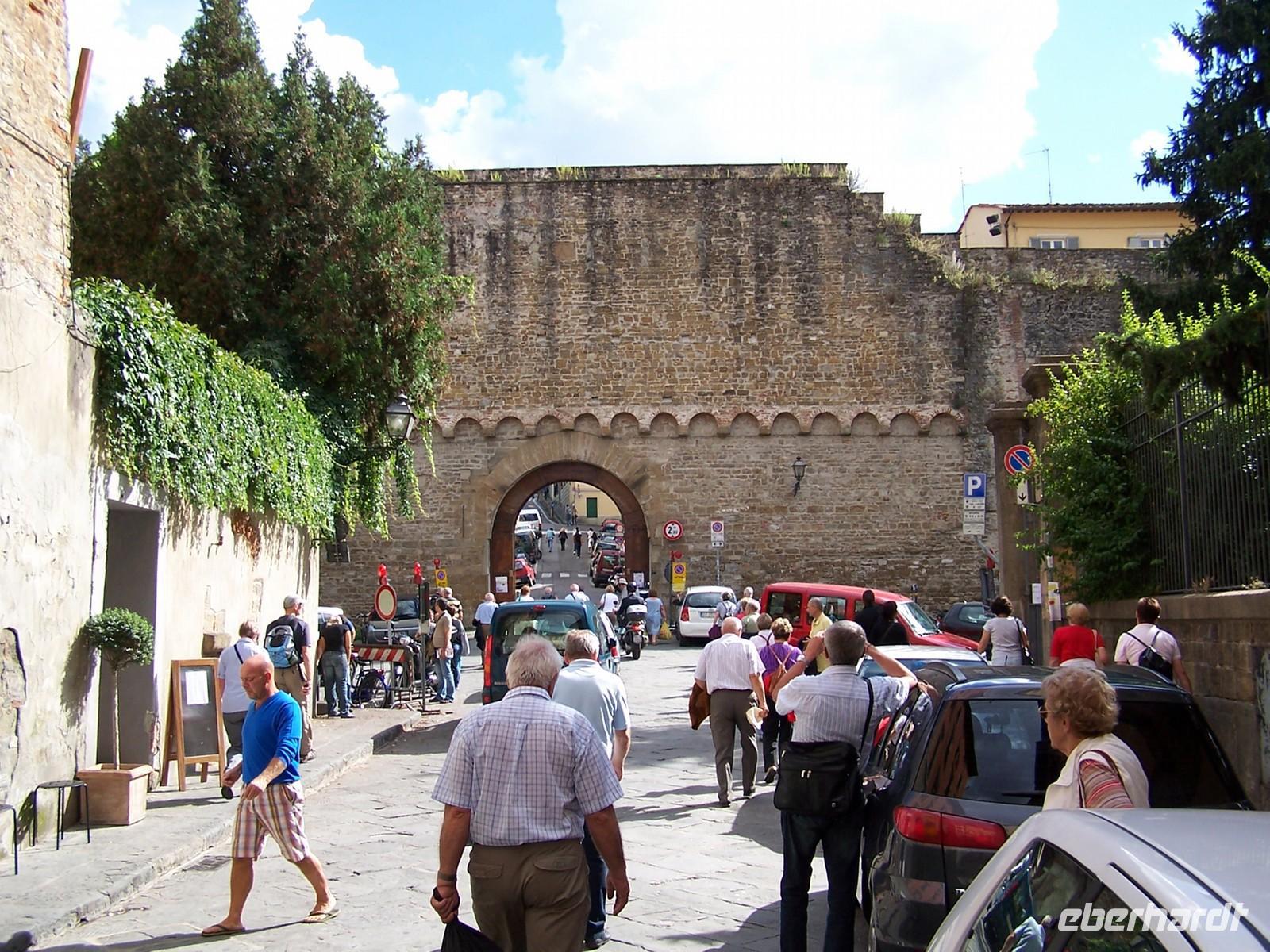 Frisch gestärkt trafen wir uns danach wieder am Denkmal Cosimos des I. auf der Piazza della Signoria. Hier hat sich unsere Gruppe aufgeteilt. Angela führte die Stadtbesichtigung mit einem Spaziergang zur Piazza Santa Croce in der Altstadt fort und erklärte den Gästen die Franziskanerkirche Santa Croce. Der größere Teil der Gruppe lief mit mir auf die andere Seite des Flusses Arno, hinauf zum Piazzale de Michelangelo. Oben angekommen, wurden wir mit dem wohl schönsten Blick über die