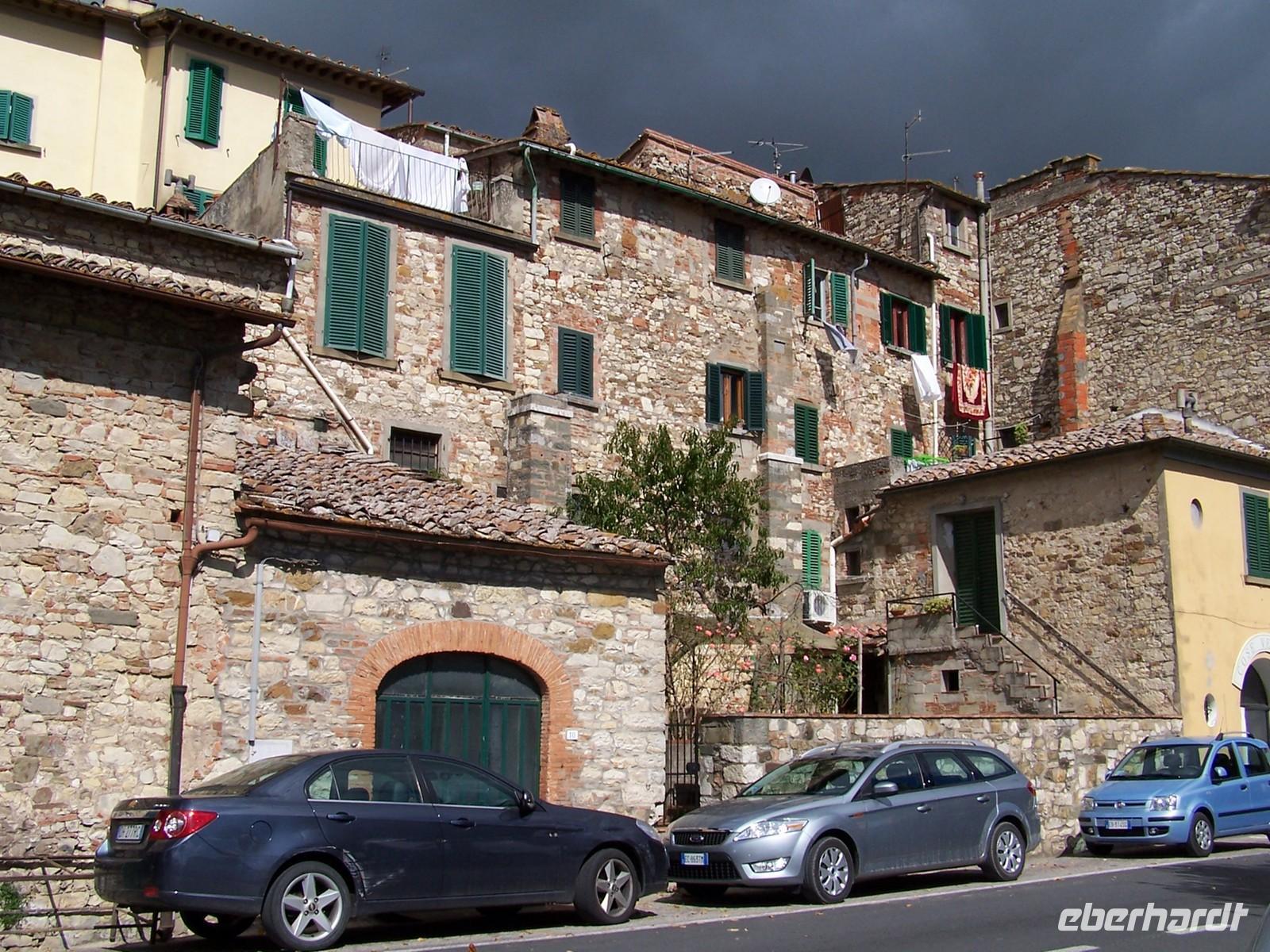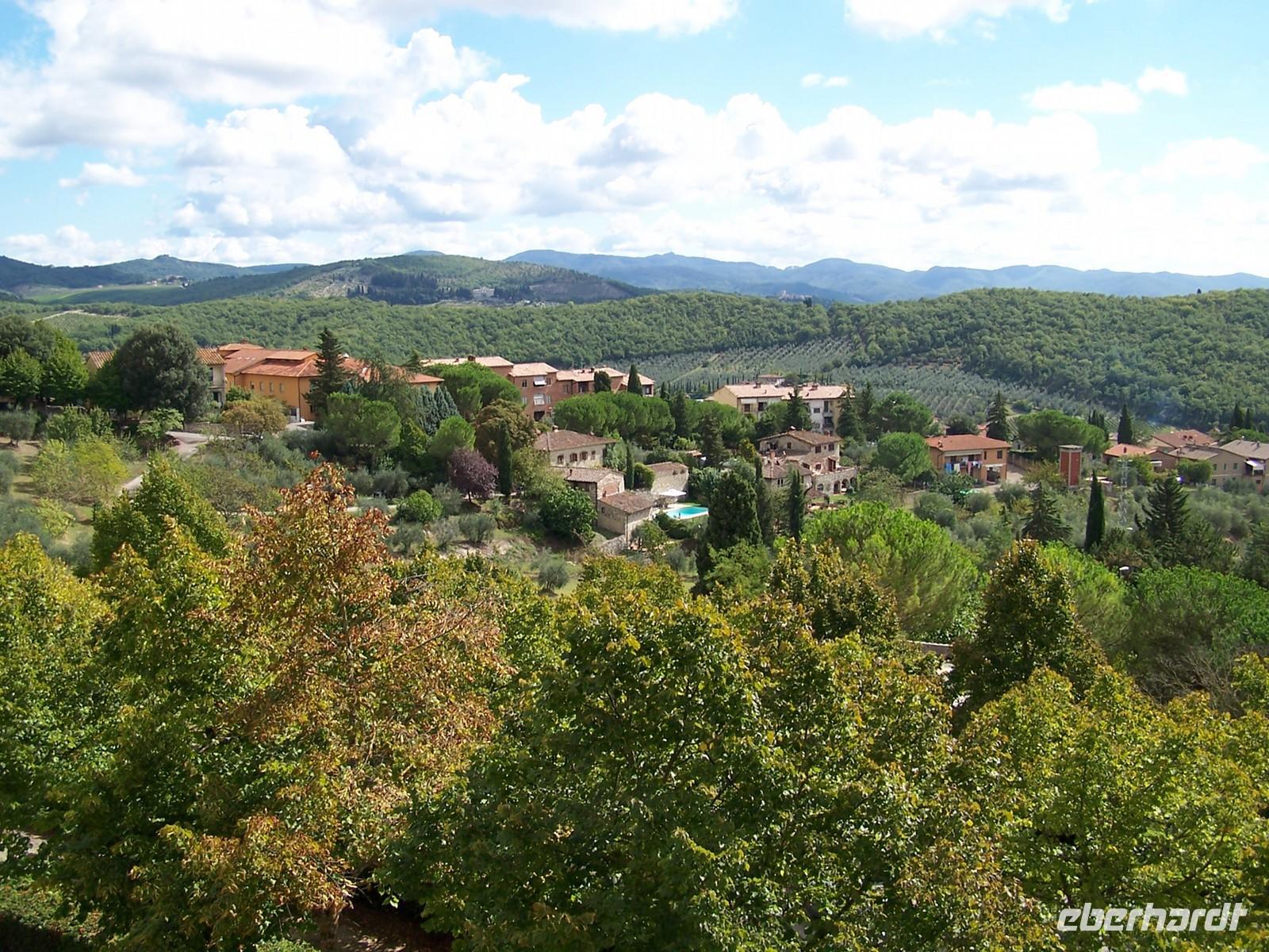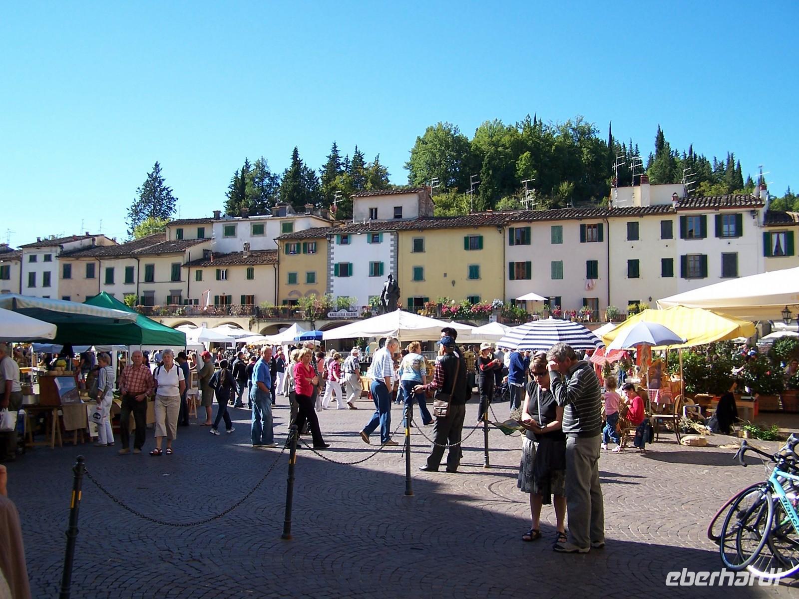 Nach dem Frühstück fuhren wir in die zauberhafte Landschaft des Chianti und hielten in dem kleinen Städtchen Greve. Greve ist das Weinzentrum des Chianti Classico-Weines. Um den dreieckigen Marktplatz, dem Piazza Mattiotti, reihen sich blumengeschmückte Laubenhäuser. Bei unserer Ankunft fand gerade ein Töpfermarkt statt. Nach unserem Aufenthalt in Greve ging die Fahrt weiter nach Radda, dem höchstgelegenen Ort im Chianti-Gebiet.