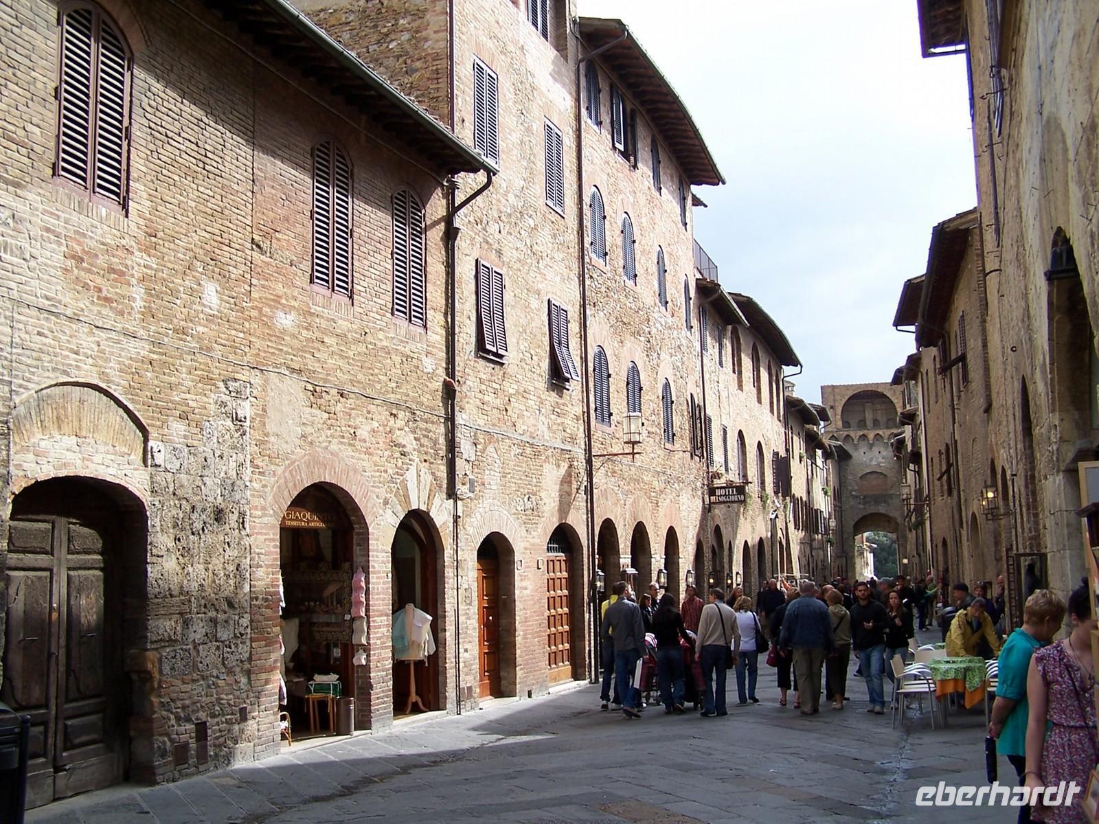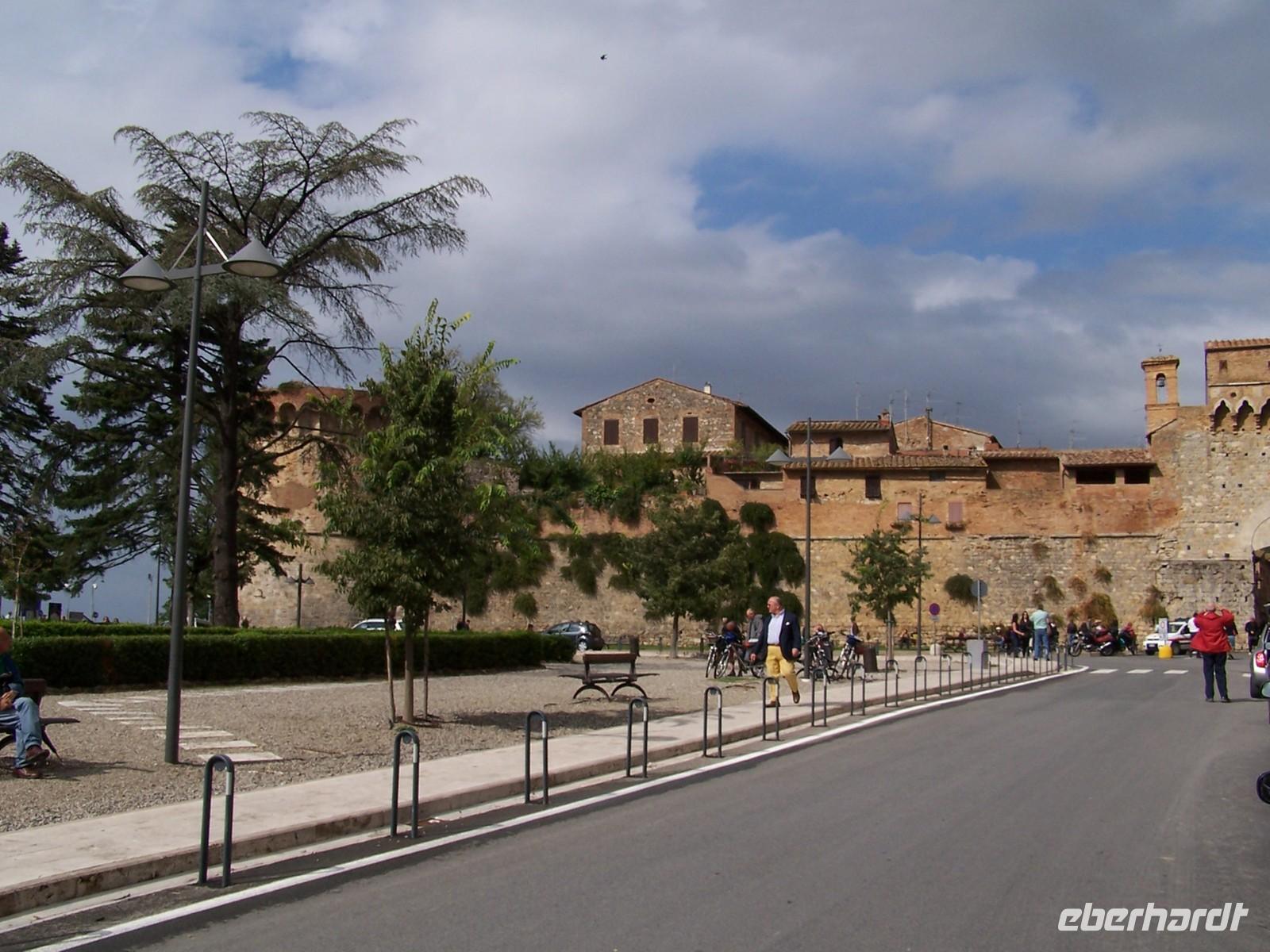 Am Morgen fuhren wir nach dem Kofferladen von Montecatini Terme zum Bahnhof in Empoli. Hier waren wir mit Herrn Cartechini verabredet, der uns den schmalen Feldweg zu seinem Weingut lotste. Dort wurden wir von zwei Generationen Weinbauern empfangen. Zunächst konnten wir uns auf der Terrasse einen Überblick über die Weinberge und den Olivenhain verschaffen. Die sich daran anschließende Verkostung war einfach fantastisch. Neben Schinken und Wurst wurde auch Käse zur Weinverkostung gereicht. Es war eine ausgezeichnete Stimmung und nach zwei Stunden fiel allen Gästen die Verabschiedung schwer. Dafür hatten alle als kleinen Trost Weinflaschen im Gepäck. Unser nächstes Ziel war die mittelalterliche Stadt San Gimignano. Schon von weitem sieht man die Geschlechtertürme aus der Silhouette der Stadt herausragen. Unsere Stadtbesichtigung war eine Reise in die Vergangenheit. Seit über 700 Jahren ist an dieser Stadt nichts grundlegendes verändert worden. Nach unserem Rundgang hatten wir wieder Freizeit für eigene Entdeckungen und Einkäufe. Am späten Nachmittag setzten wir dann unsere Fahrt an die etruskische Riviera und zu unserem Übernachtungsort San Vincenzo fort.