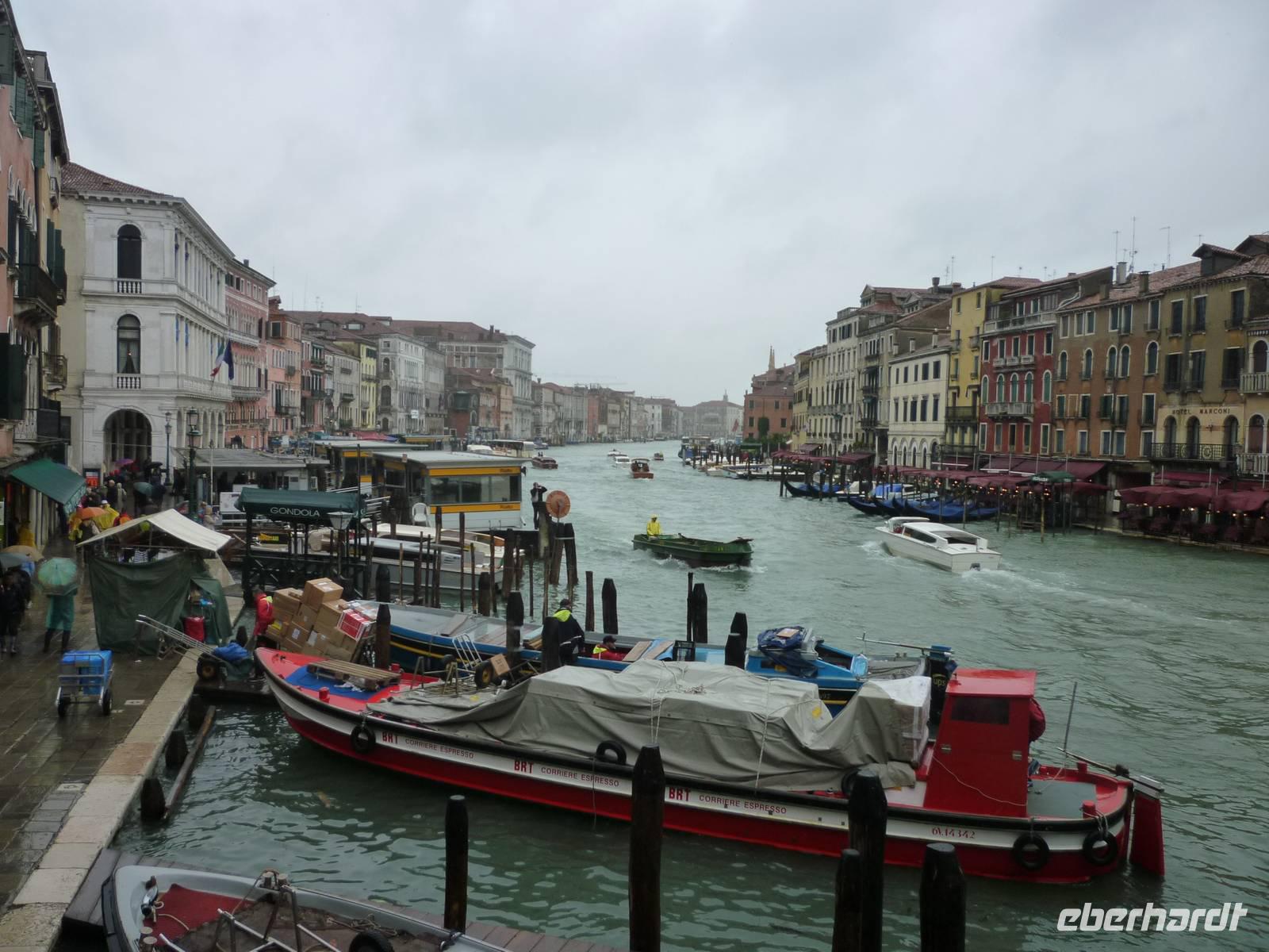 Der Blick auf die Rialto-Brücke, unter der der Verkehr um die späte Mittagszeit wegen des Sturms zum Erliegen kam, bot ein seltsames Bild: kaum Besucher, wenige Boote, eine Stadt in Deckung vor dem Sturm.