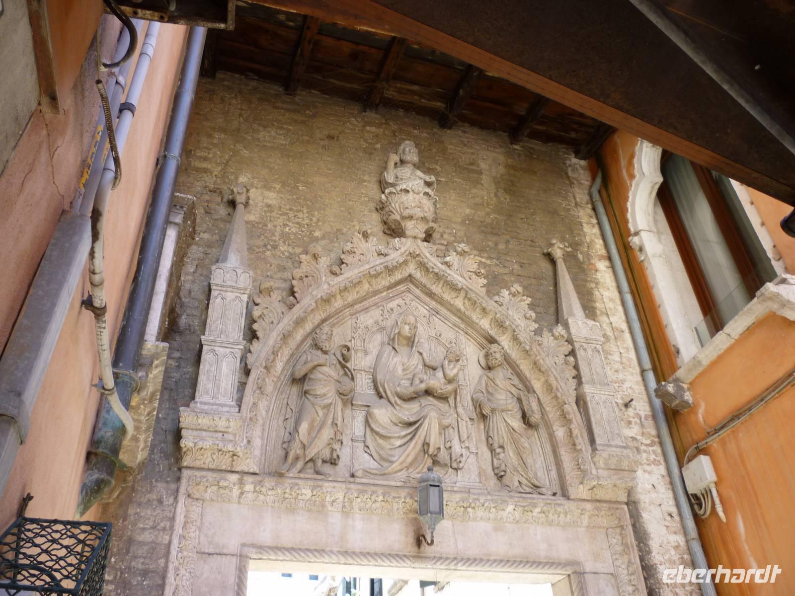 Trotzdem schritten wir tapfer zur Führung und besichtigten zunächst den Markus-Dom, die Piazetta San Marco mit ihren Säulen und von außen die Fassaden des Dogenpalastes. Nach einem Blick auf Uhrturm und Campanile verließen wir diesen prächtigen Platz. Viele Touristen waren nicht unterwegs - so hatten wir Gelegenheit, alles ausgiebig zu betrachten, wenn es die Beschaffenheit der jeweiligen Schirme zuließ.