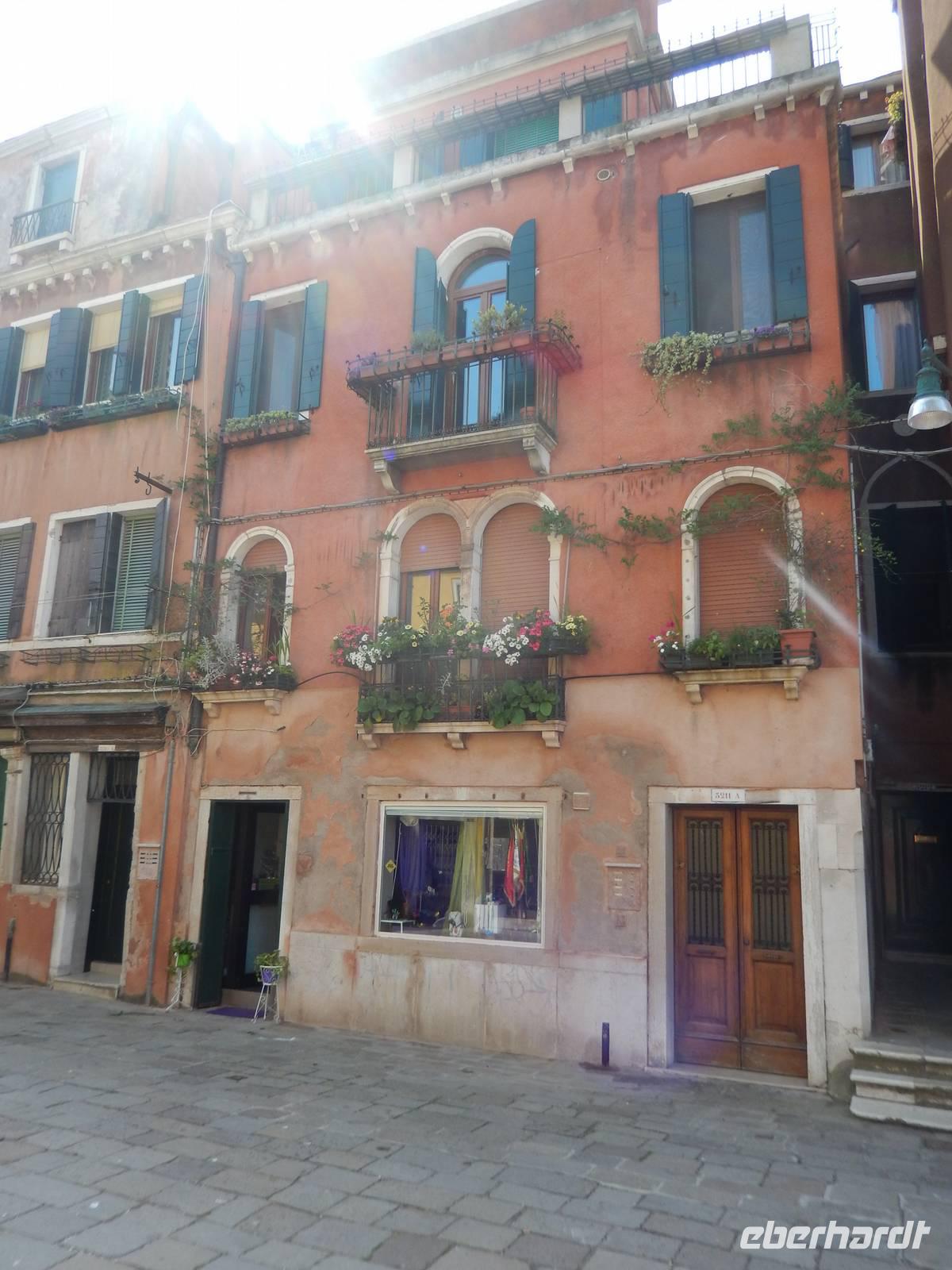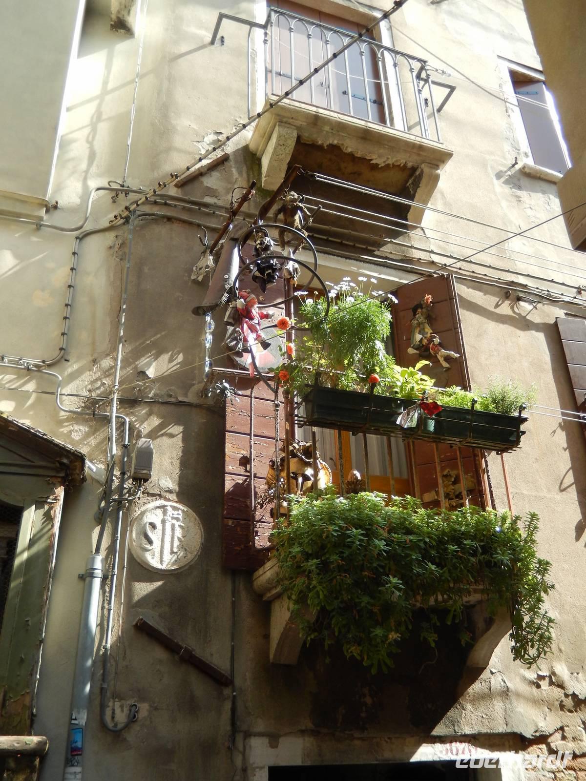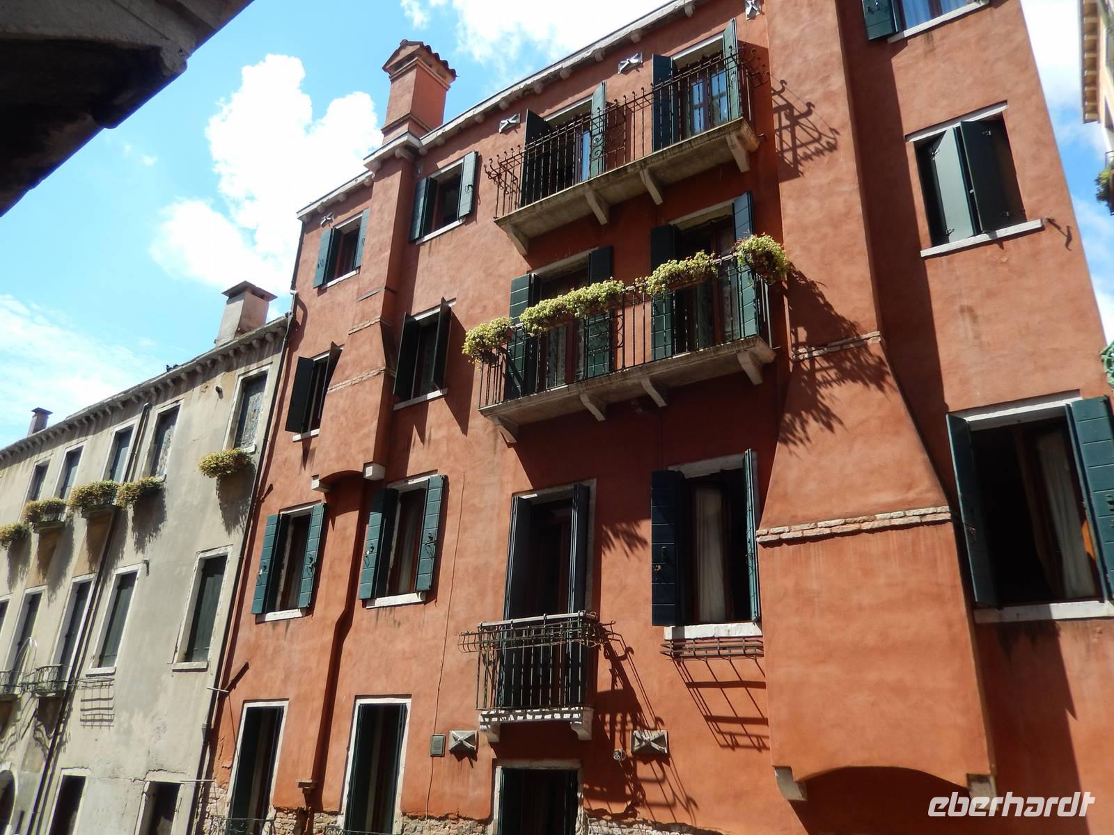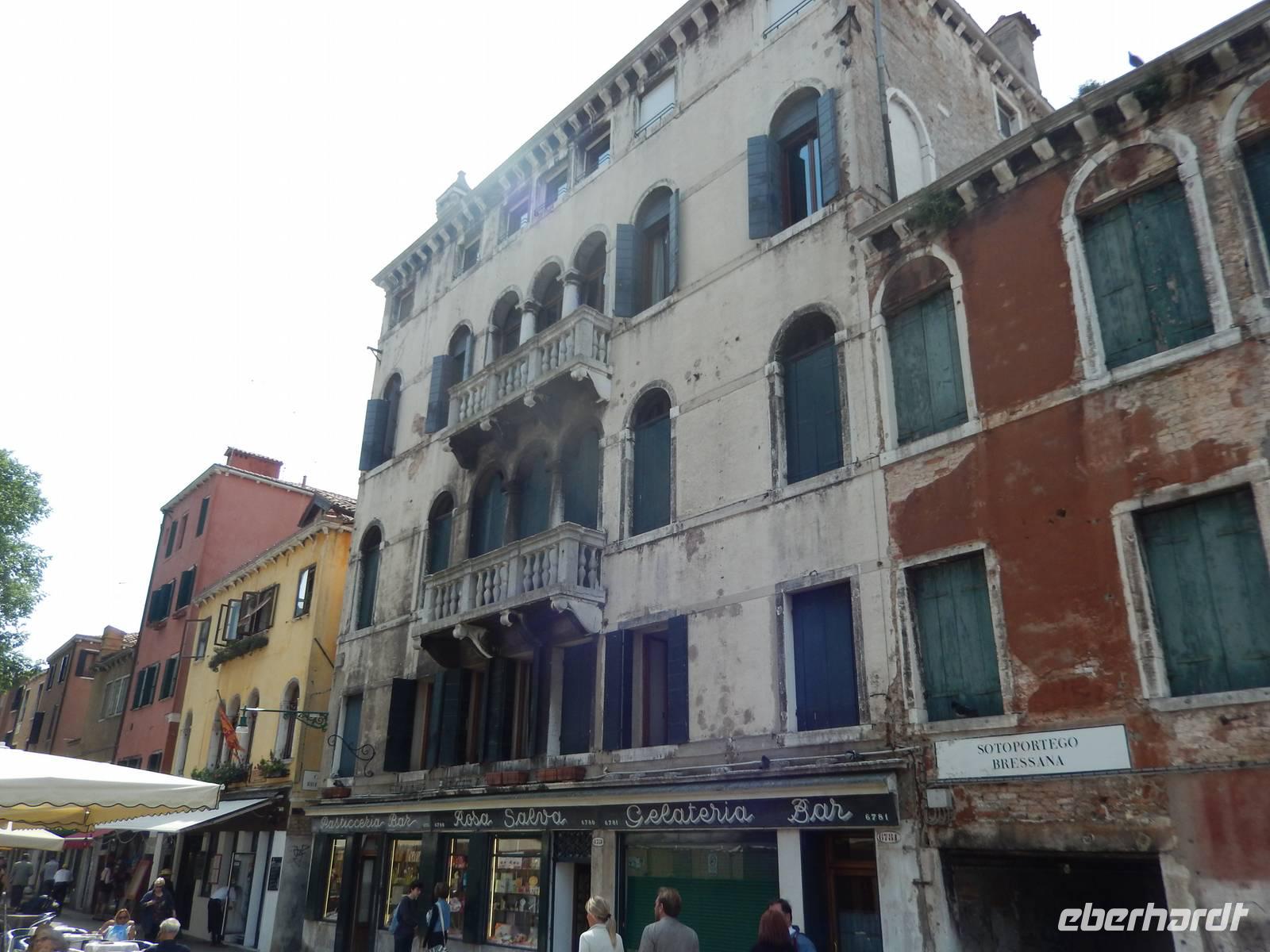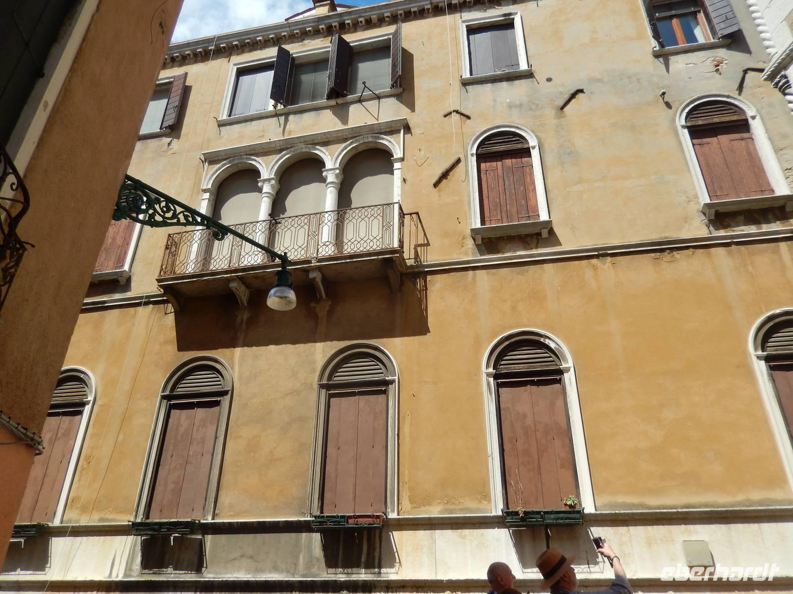 Wir blieben davon verschont und suchten lieber im touristischen Teil der Stadt besonders schöne Palazzi, Plätze und andere Gebäude auf. Am Theater bekamen wir einen Eindruck, mit welchem Prunk diese Stadt ausgestattet war und zum Teil wieder oder auch immer noch ist. Alessia zeigte uns, wo man Gondeln mieten kann, wo man besser und günstiger kauft und isst, wo es die an den Souvenirständen stets vermissten Briefmarken gibt und... wo Commissario Brunetti in den Donna-Leon-Krimis auf dem Balkon seiner Wohnung steht, auf den Canal le Grande und die Rialto brücke schaut und danach doch in ganz andere Räume geht. Ja, der Film. Seine wirkliche Film-Wohnung befindet sich an ganz anderer Stelle in Venedig, den Balkon jedoch sahen wir tatsächlich.