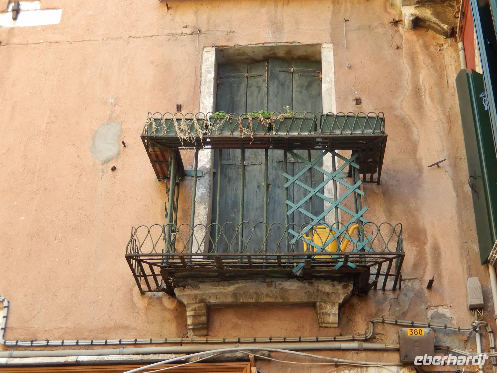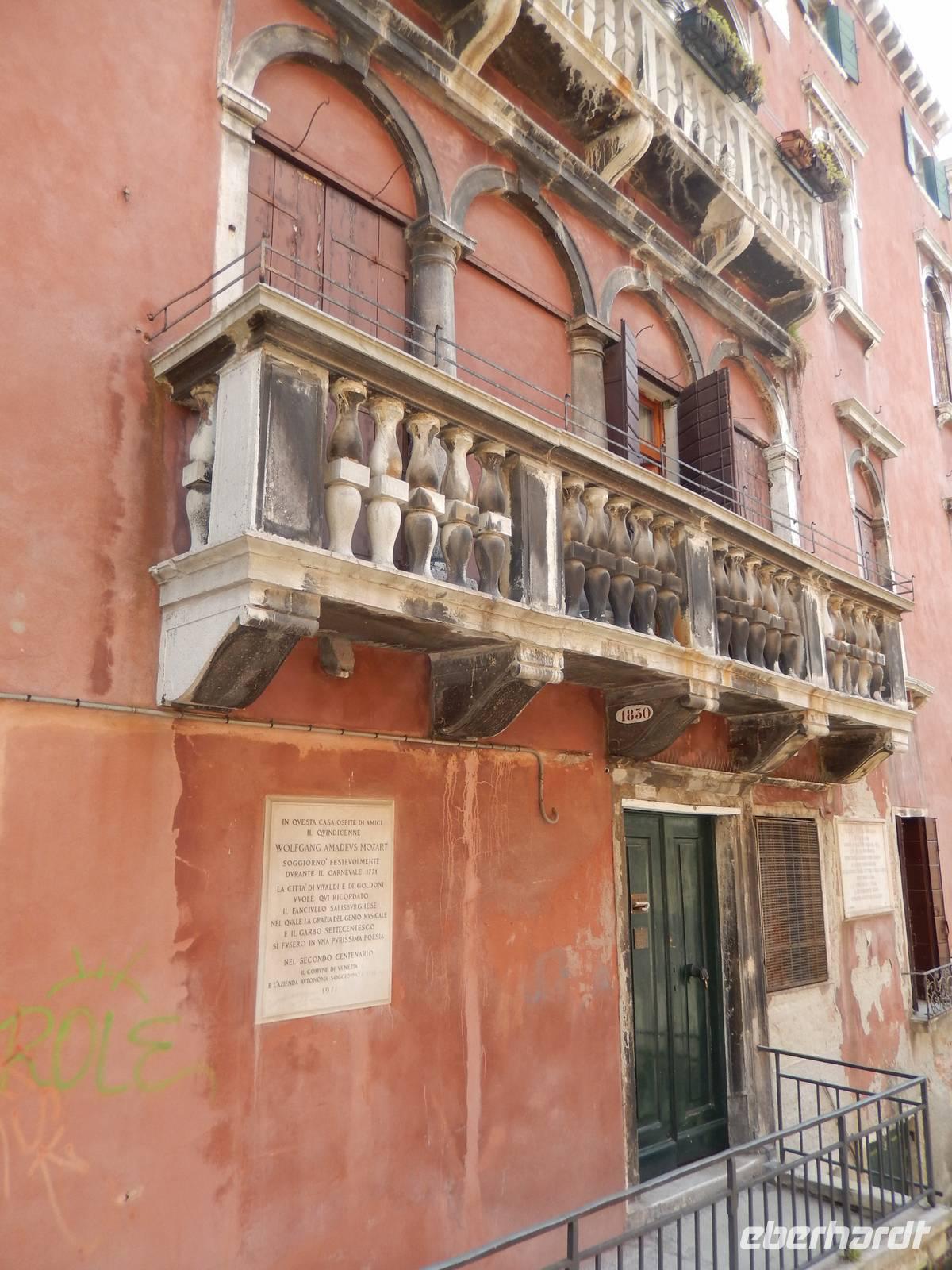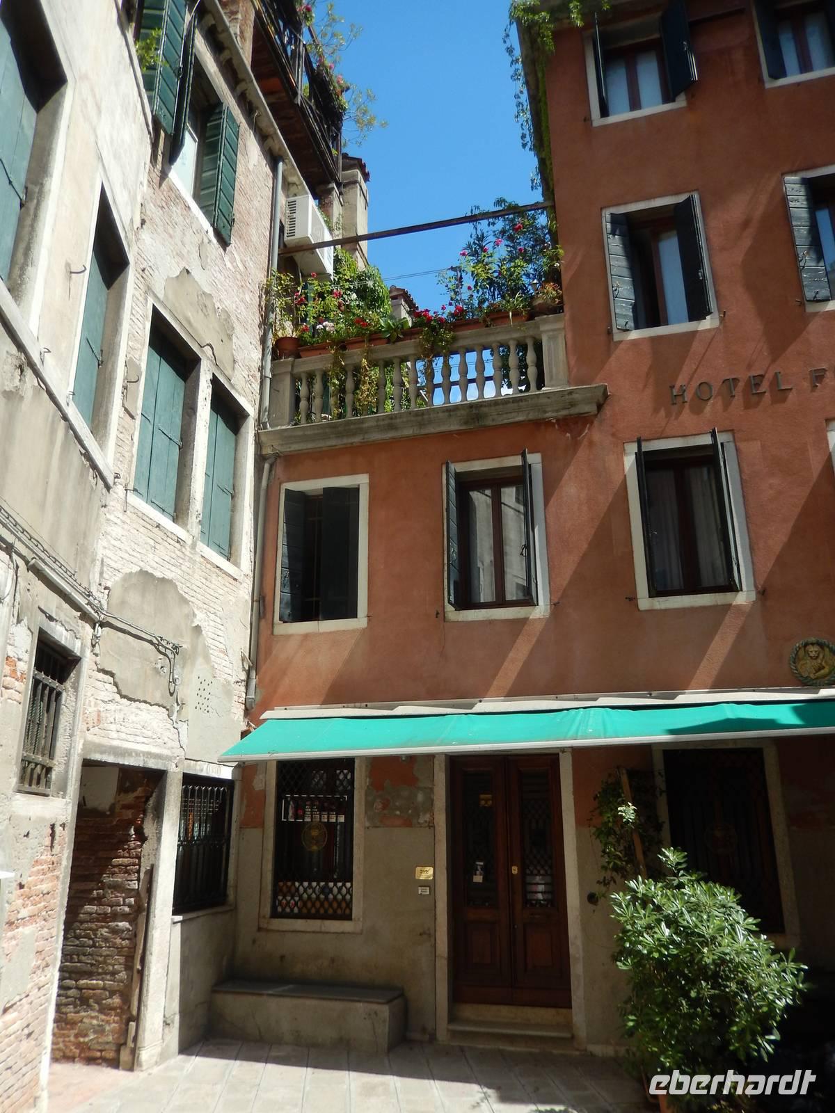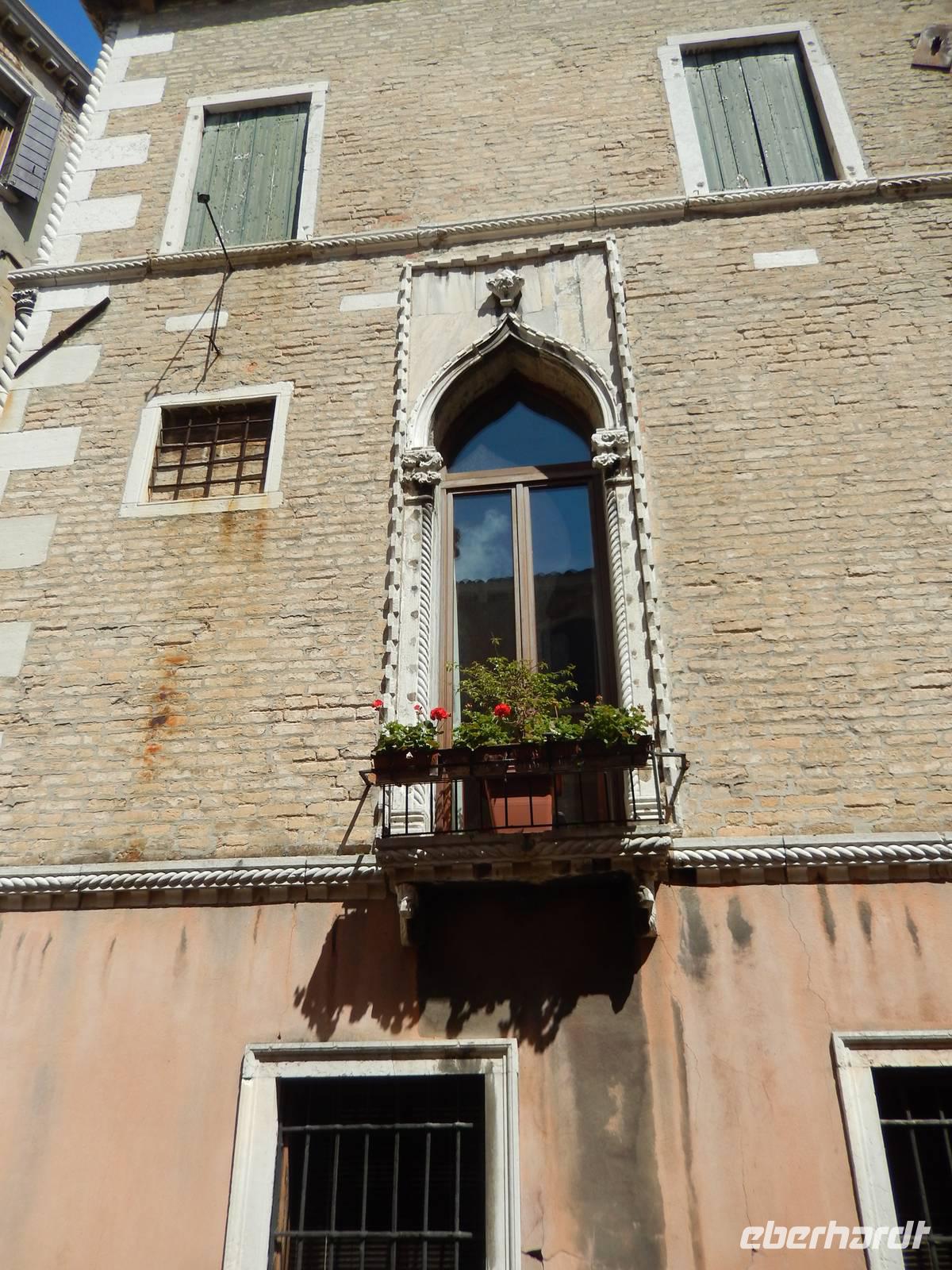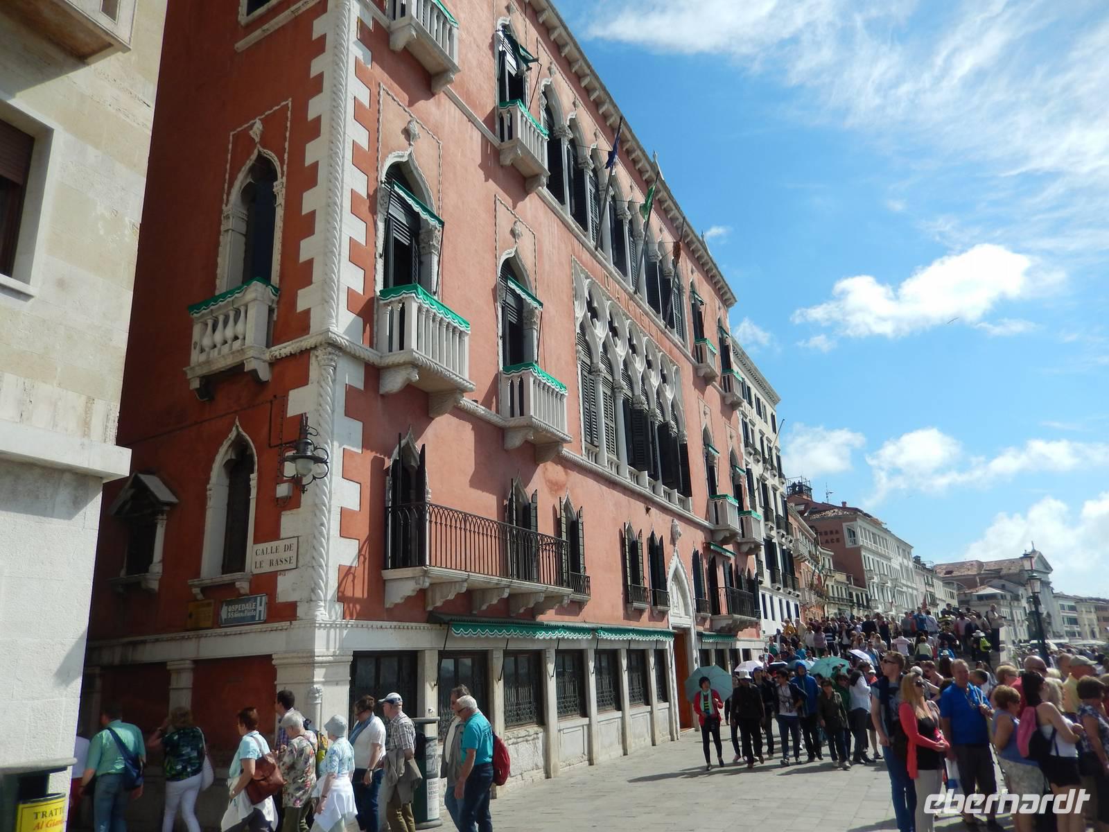 Wir blieben davon verschont und suchten lieber im touristischen Teil der Stadt besonders schöne Palazzi, Plätze und andere Gebäude auf. Am Theater bekamen wir einen Eindruck, mit welchem Prunk diese Stadt ausgestattet war und zum Teil wieder oder auch immer noch ist. Alessia zeigte uns, wo man Gondeln mieten kann, wo man besser und günstiger kauft und isst, wo es die an den Souvenirständen stets vermissten Briefmarken gibt und... wo Commissario Brunetti in den Donna-Leon-Krimis auf dem Balkon seiner Wohnung steht, auf den Canal le Grande und die Rialto brücke schaut und danach doch in ganz andere Räume geht. Ja, der Film. Seine wirkliche Film-Wohnung befindet sich an ganz anderer Stelle in Venedig, den Balkon jedoch sahen wir tatsächlich.