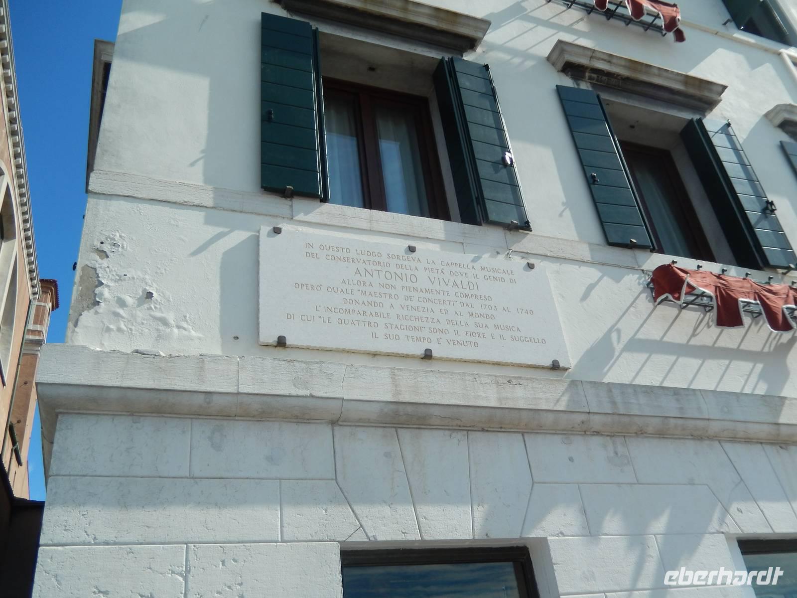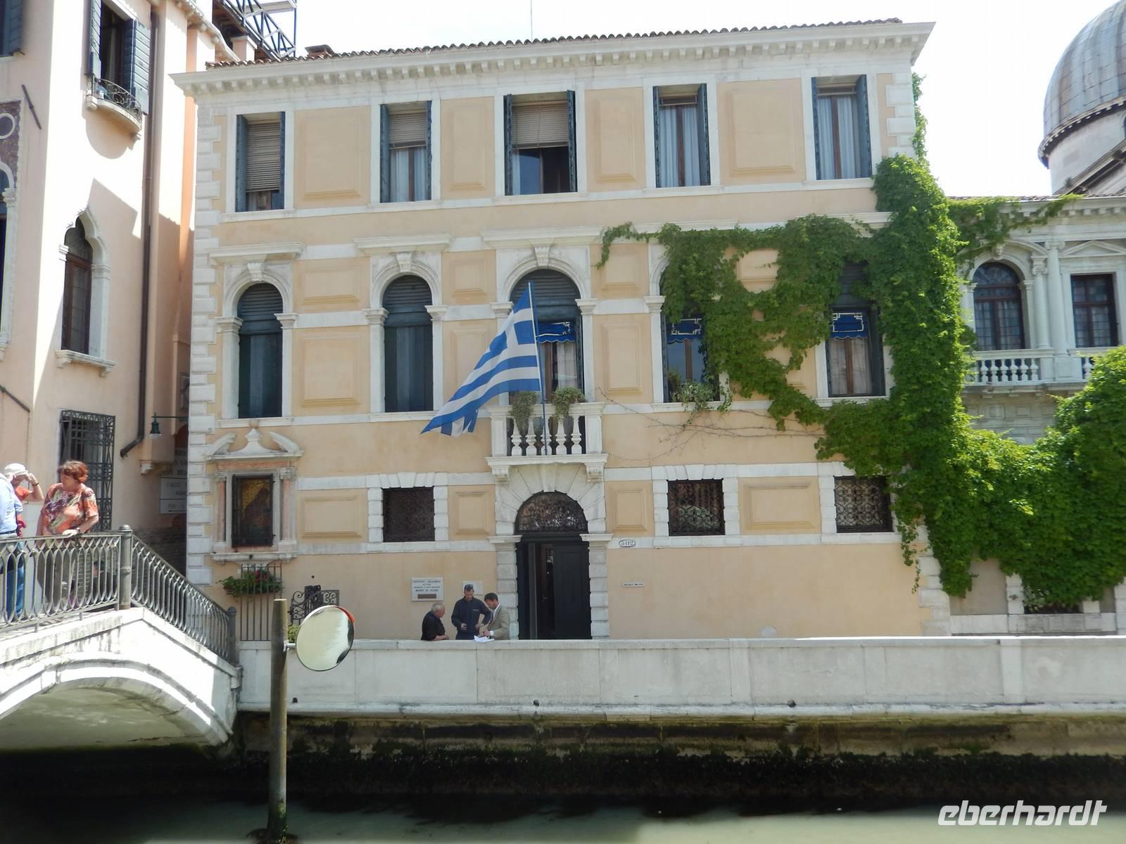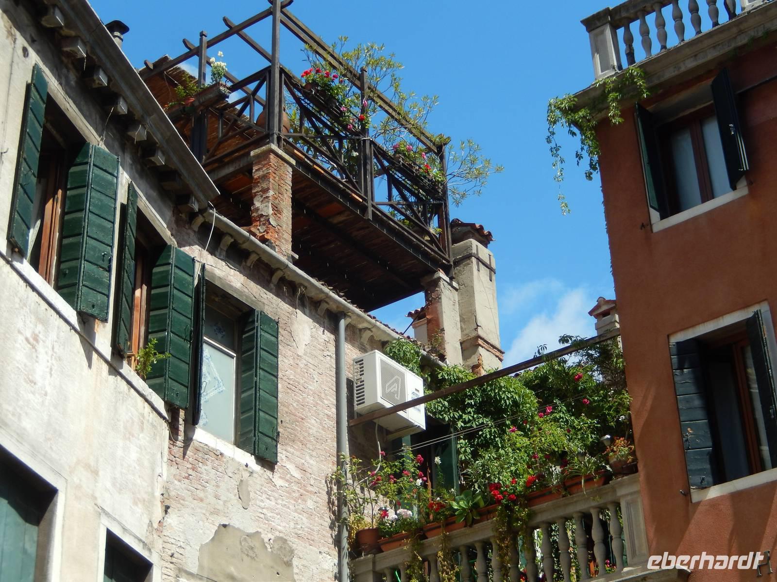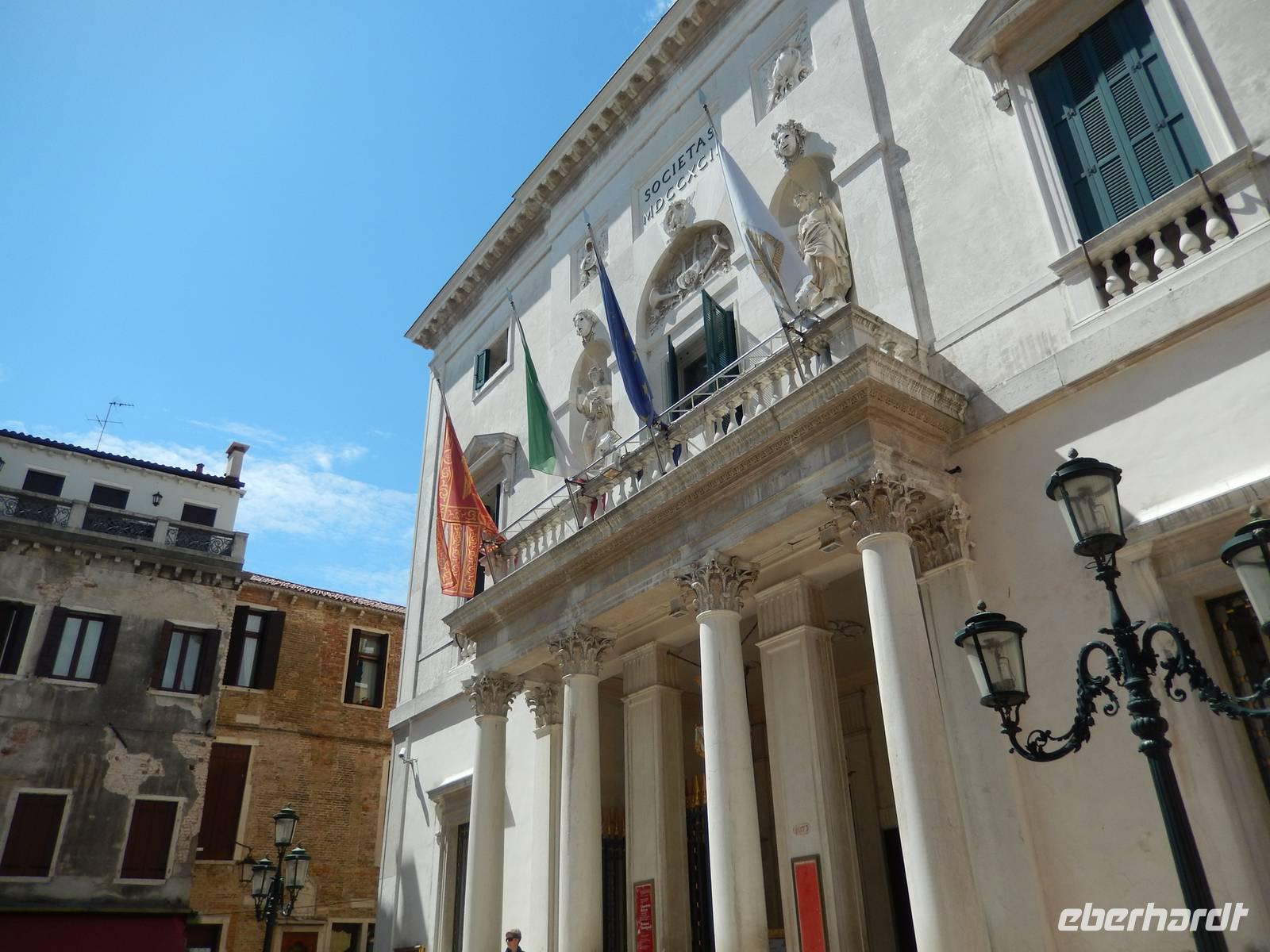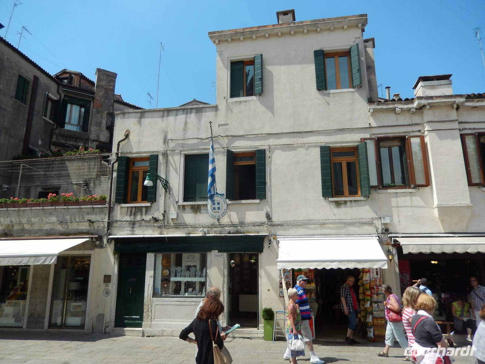 Wir blieben davon verschont und suchten lieber im touristischen Teil der Stadt besonders schöne Palazzi, Plätze und andere Gebäude auf. Am Theater bekamen wir einen Eindruck, mit welchem Prunk diese Stadt ausgestattet war und zum Teil wieder oder auch immer noch ist. Alessia zeigte uns, wo man Gondeln mieten kann, wo man besser und günstiger kauft und isst, wo es die an den Souvenirständen stets vermissten Briefmarken gibt und... wo Commissario Brunetti in den Donna-Leon-Krimis auf dem Balkon seiner Wohnung steht, auf den Canal le Grande und die Rialto brücke schaut und danach doch in ganz andere Räume geht. Ja, der Film. Seine wirkliche Film-Wohnung befindet sich an ganz anderer Stelle in Venedig, den Balkon jedoch sahen wir tatsächlich.