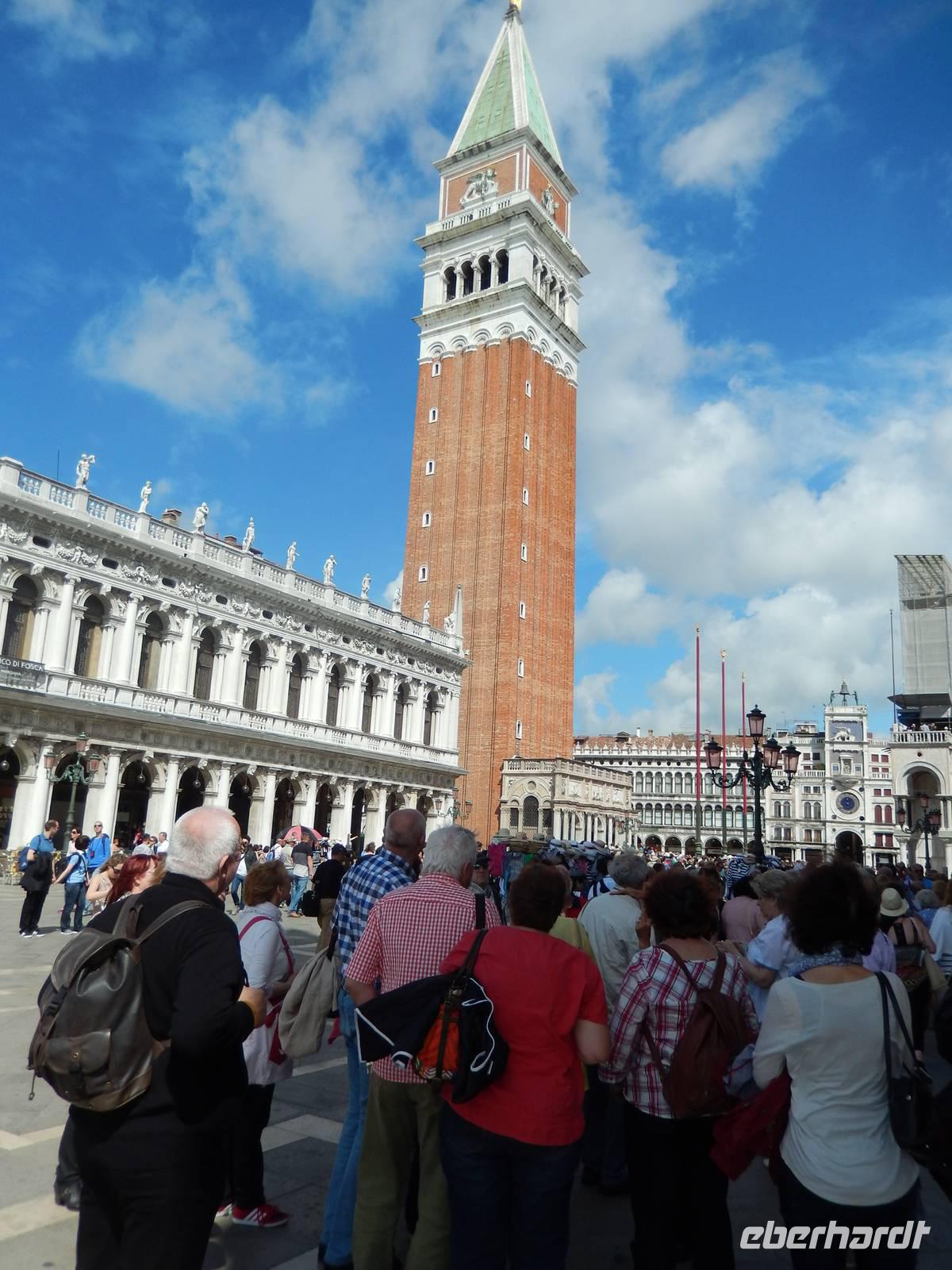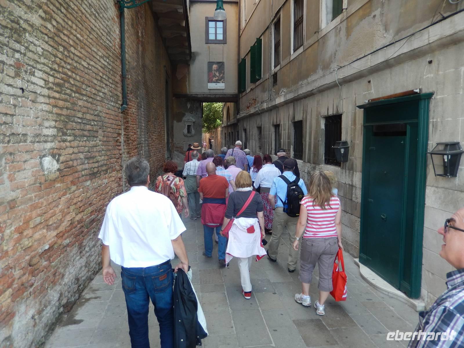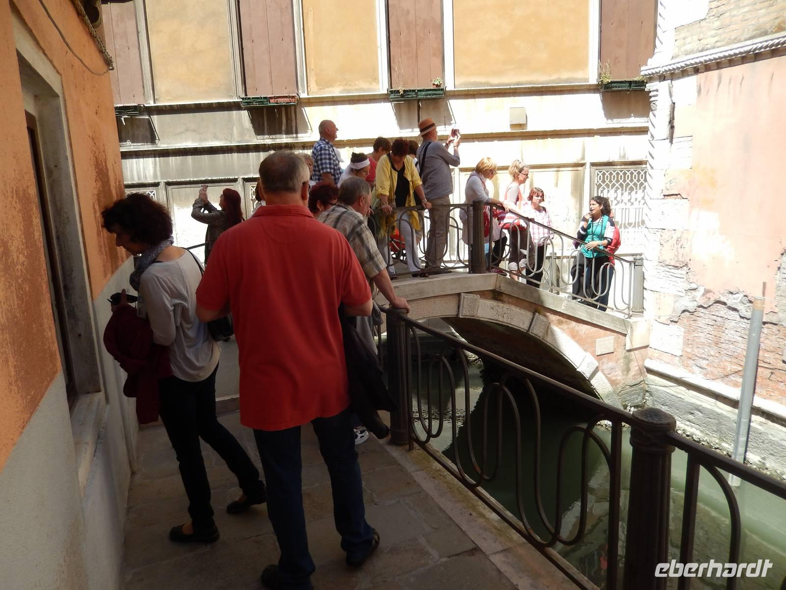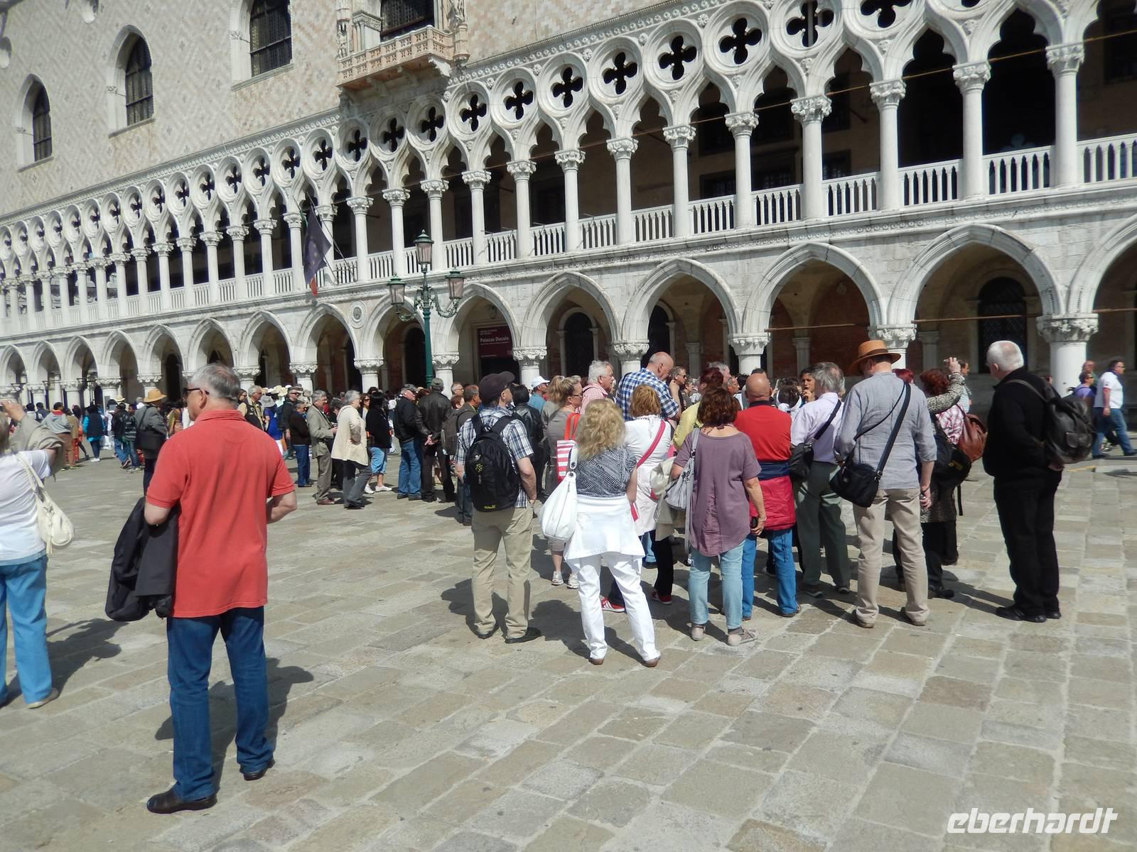 Vorbei am Geburtsort Vivaldis ging es über vier Brücken zur Piazza San Marco. Veles lernten wir über die Stadt. Auch, dass dieser Platz mehrmals im Jahr überschwemmt wird, was jedoch ganz ruhig abläuft. Die Venezianer legen dann Stege aus und selbst die Tausenden Touristen lachen, wenn sich die Gruppen auf den dann schmalen Wegen begegnen. Um sich ein wenig vorbereiten zu können, besitzt jeder Venezianer einen amtlichen Hochwasser-Warn-Plan, aus dem man zumindest erahnen kann, wann Hochwasser kommen könnte.