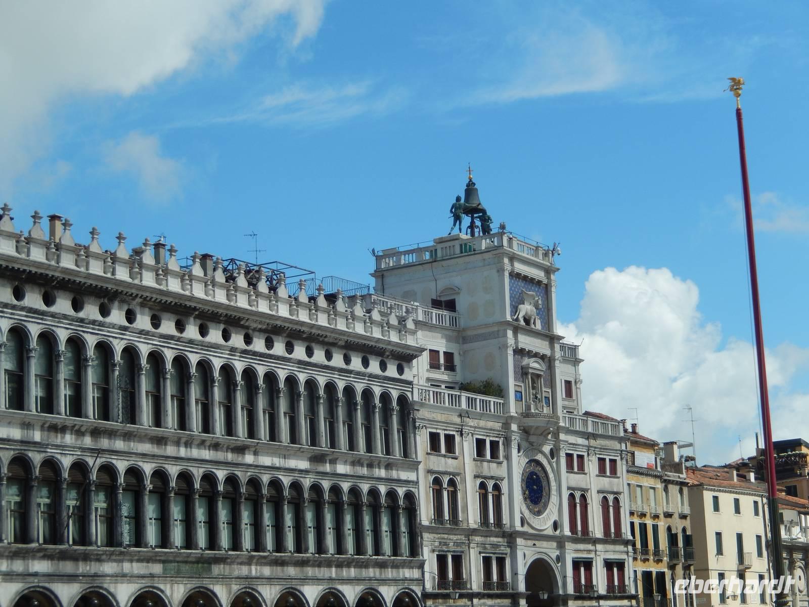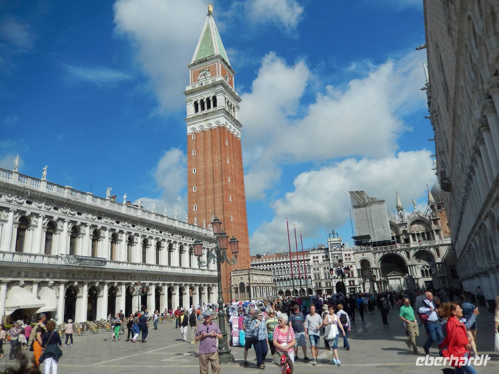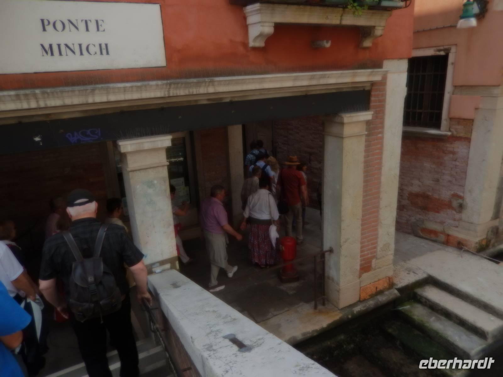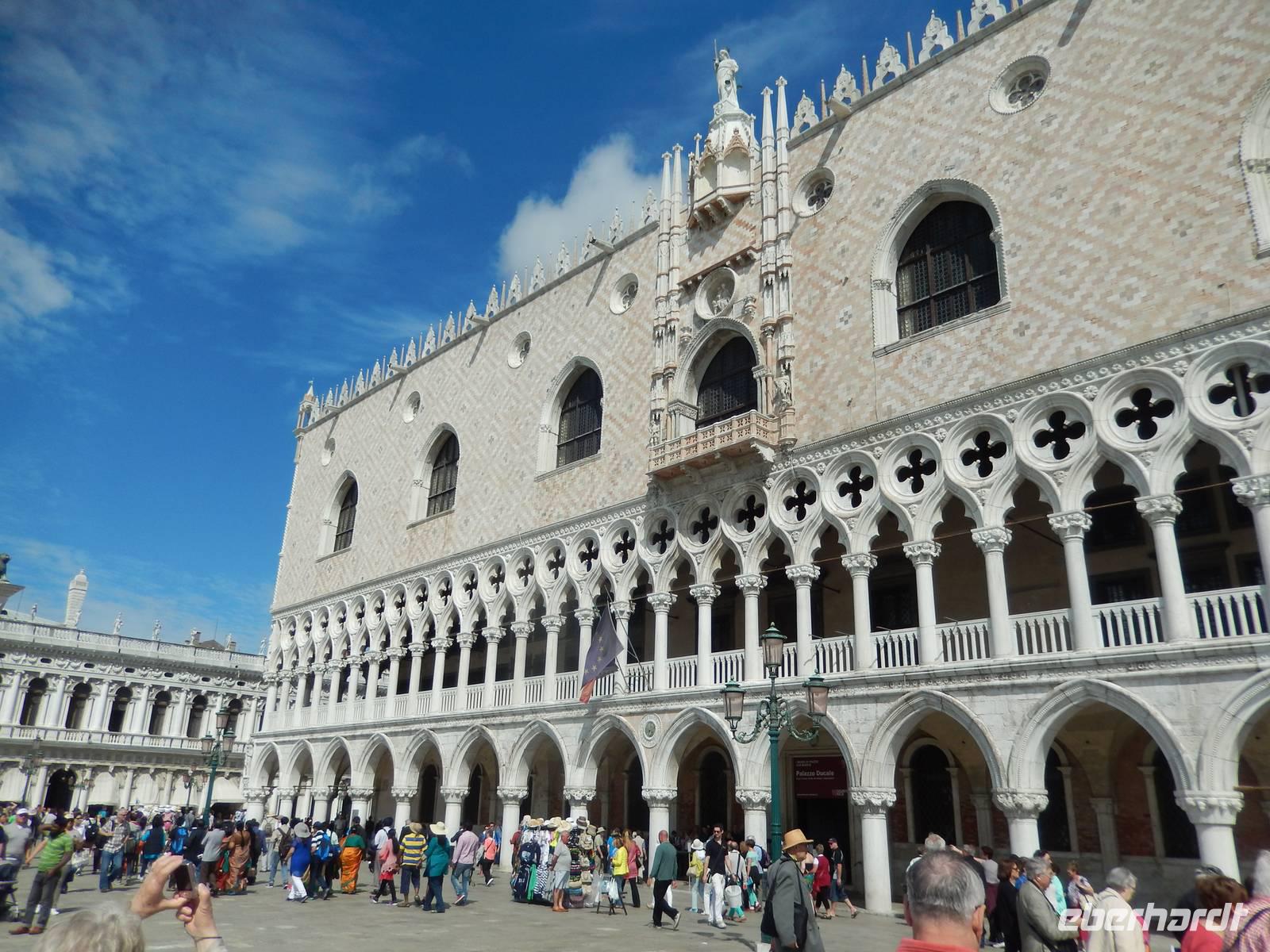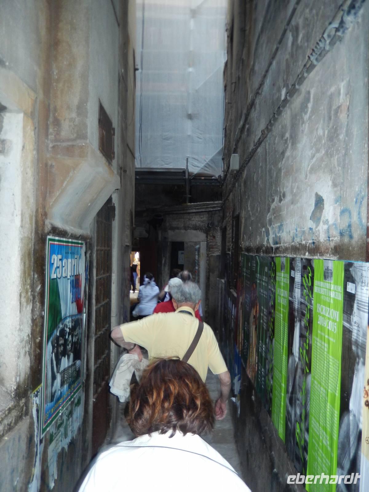 Vorbei am Geburtsort Vivaldis ging es über vier Brücken zur Piazza San Marco. Veles lernten wir über die Stadt. Auch, dass dieser Platz mehrmals im Jahr überschwemmt wird, was jedoch ganz ruhig abläuft. Die Venezianer legen dann Stege aus und selbst die Tausenden Touristen lachen, wenn sich die Gruppen auf den dann schmalen Wegen begegnen. Um sich ein wenig vorbereiten zu können, besitzt jeder Venezianer einen amtlichen Hochwasser-Warn-Plan, aus dem man zumindest erahnen kann, wann Hochwasser kommen könnte.