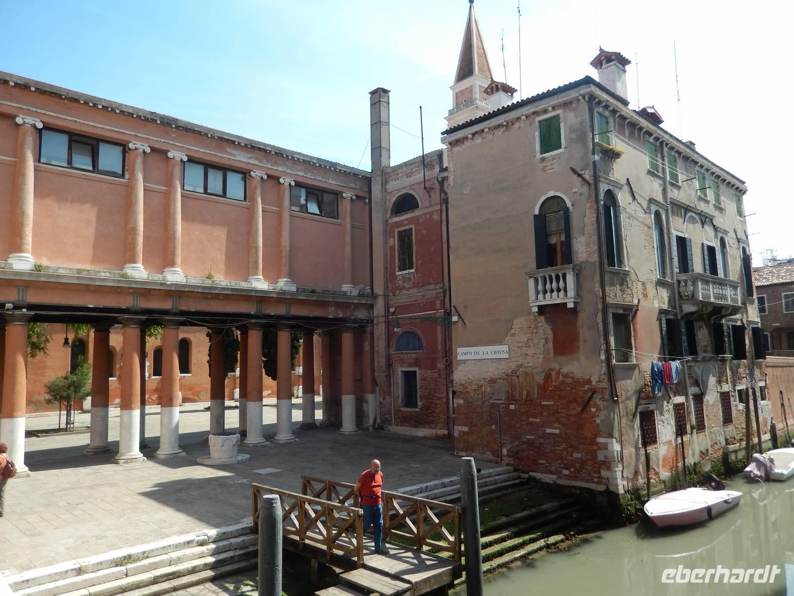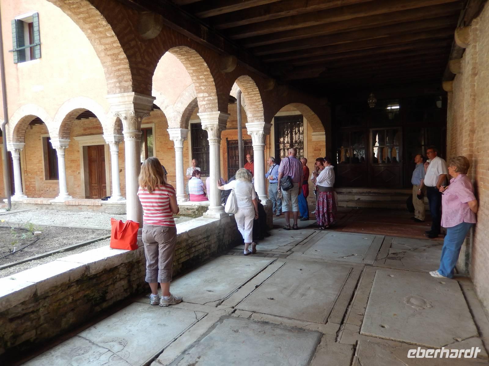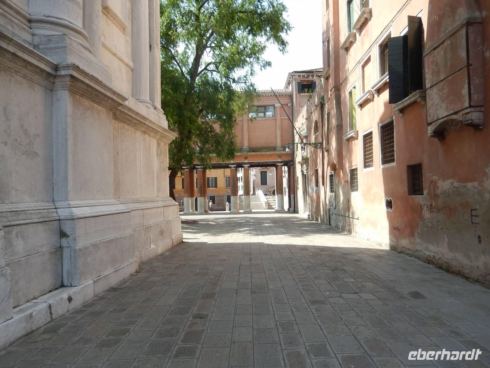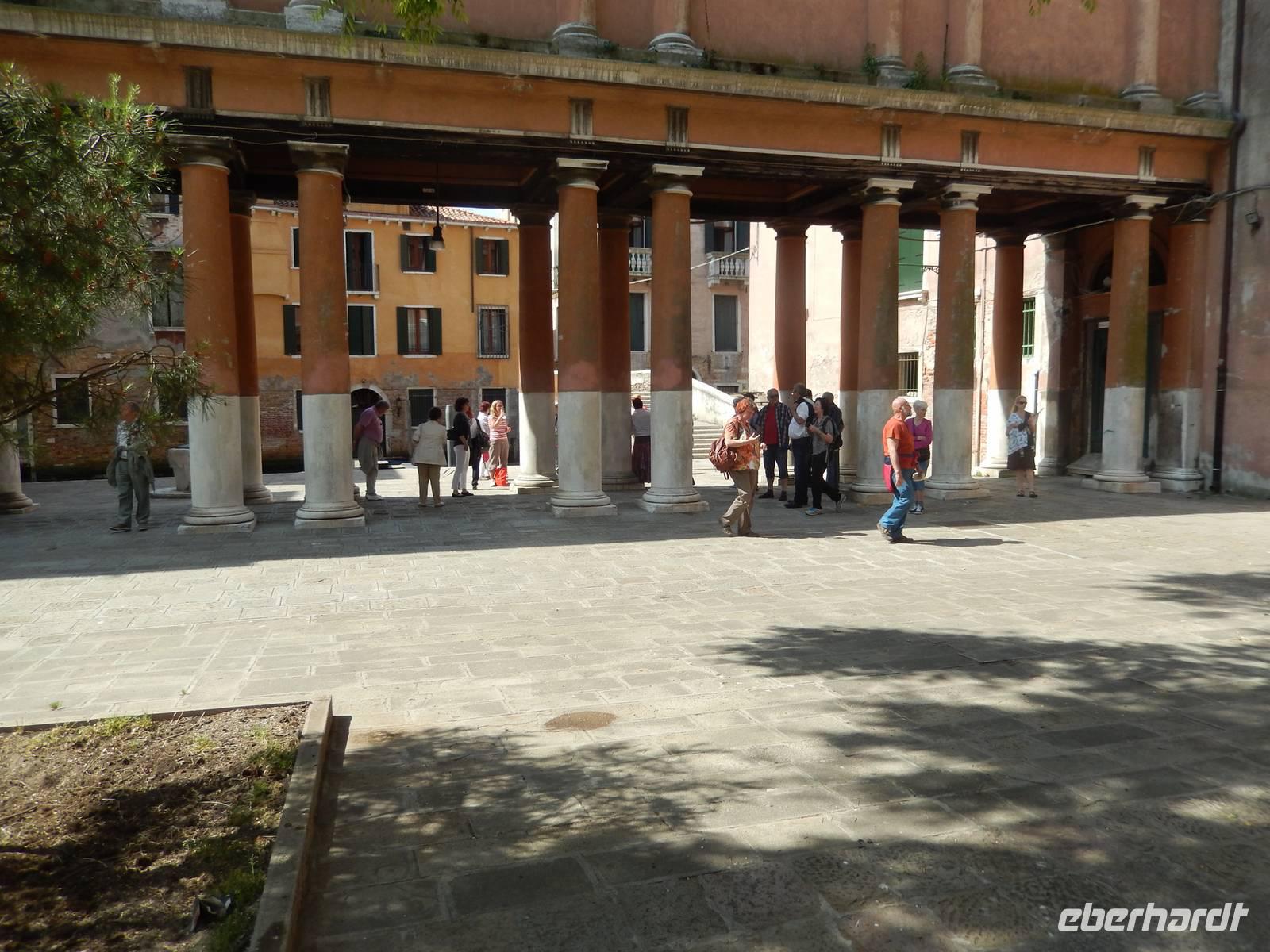 Während wir mit Massimo noch über das schwierig geregelte Gesundheitswesen Venedigs und Gesamt-Italiens plauderten, sahen wir plötzlich etwas uns bekannt Vorkommendes vor uns. Säulengänge, dahinter eine Kirche, davor ein Kanal. Das sah doch aus, wie der Platz vor Commissario Brunettis Kommissariat! Und wirklich... Wir standen an den Fondamenta San Lorenzo und blickten auf jene Tür, aus der Brunetti so oft trat. Natürlich besichtigten wir auch San Lorenzo mit dem schönen Kreuzgang im Innern. Der Schatten und die Kühle des Gotteshauses machte uns wieder fit für den zweiten Teil unserer Tour durch das ruhigere Venedig. Wirklich bemerkten wir hier, wie unruhig es an anderen Orten der Stadt war und wie ruhig hier. Sogar am Ospedale, dem alten und immer noch in Betrieb befindlichen Krankenhaus von Venedig, war nicht zu viel los. Zeit, um im Stehen in einem der kleinen Cafés am Platz einen Espresso zu trinken.
