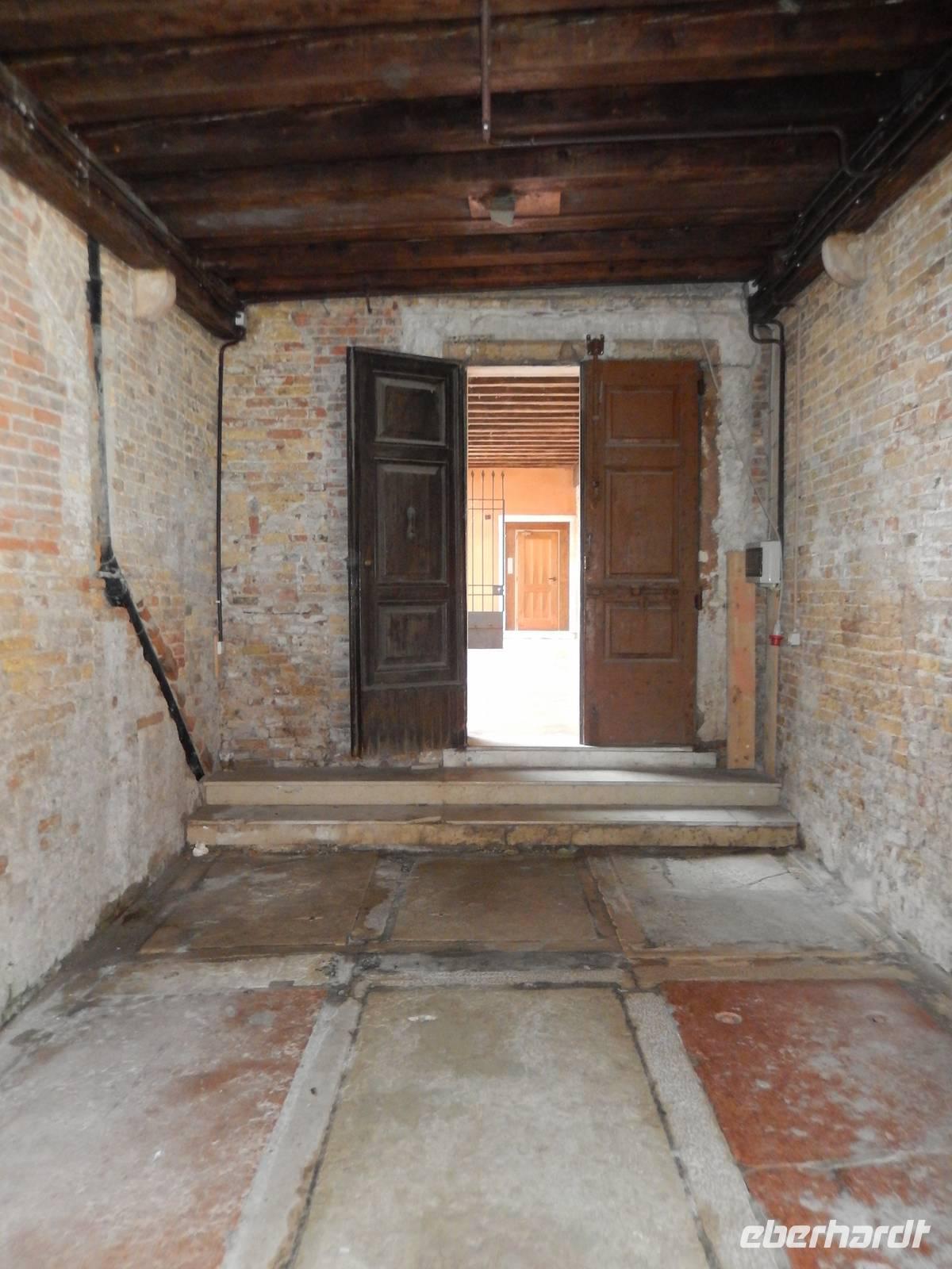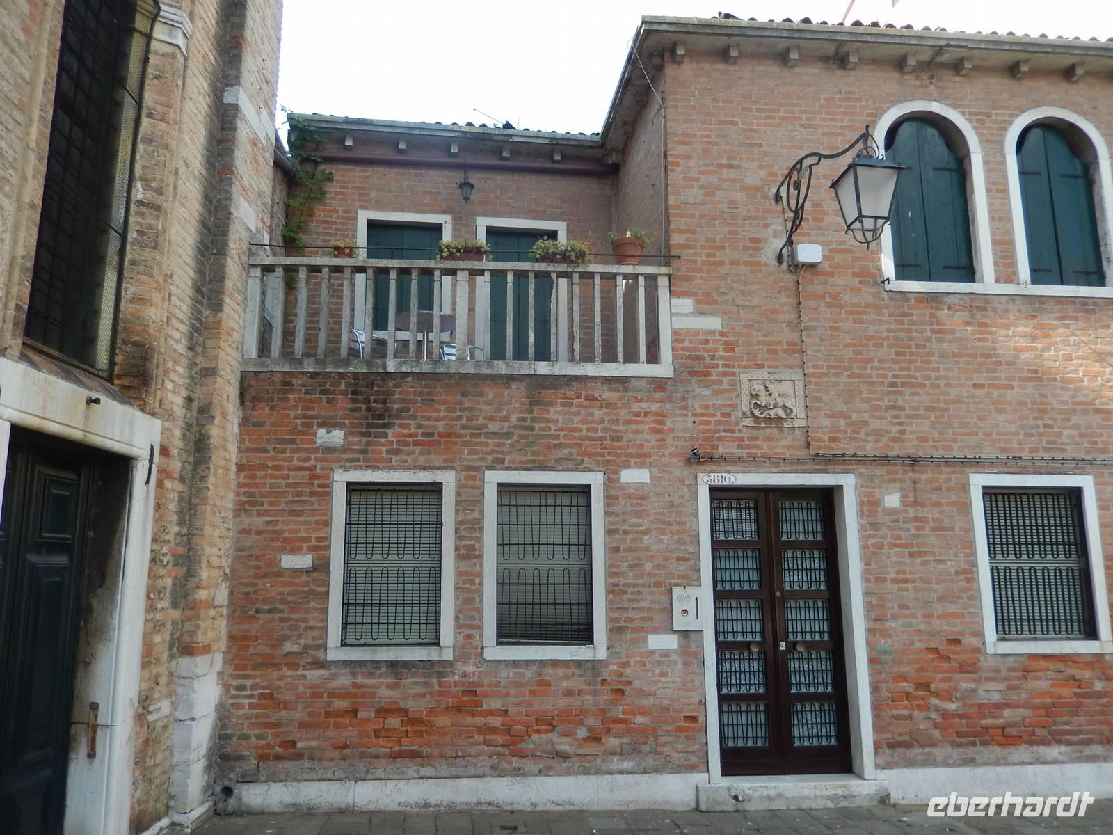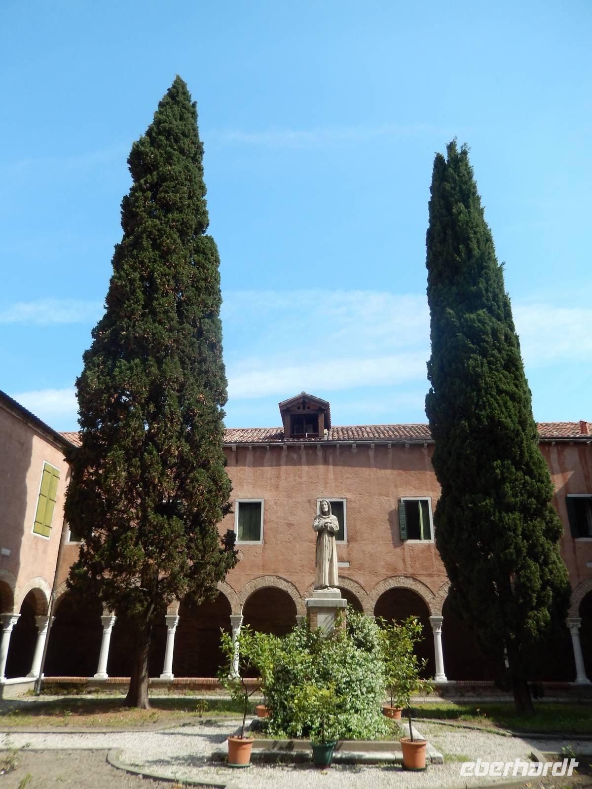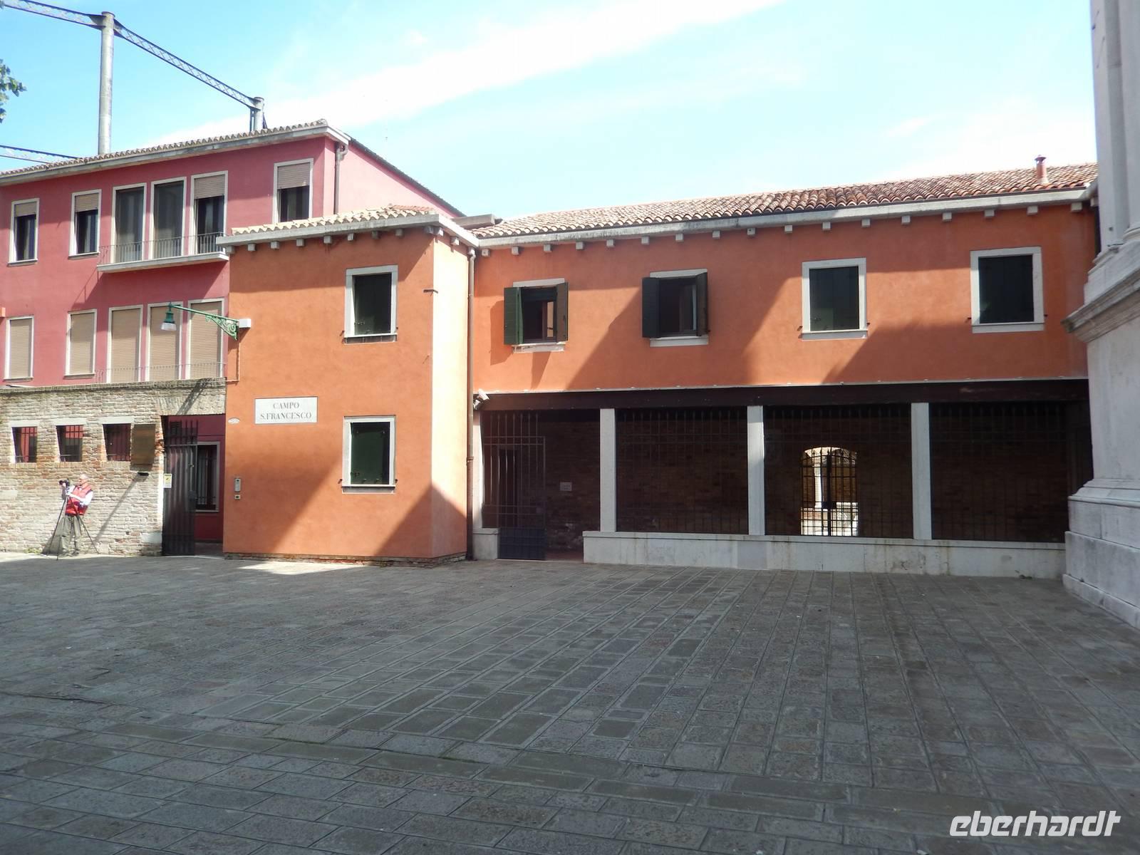 Während wir mit Massimo noch über das schwierig geregelte Gesundheitswesen Venedigs und Gesamt-Italiens plauderten, sahen wir plötzlich etwas uns bekannt Vorkommendes vor uns. Säulengänge, dahinter eine Kirche, davor ein Kanal. Das sah doch aus, wie der Platz vor Commissario Brunettis Kommissariat! Und wirklich... Wir standen an den Fondamenta San Lorenzo und blickten auf jene Tür, aus der Brunetti so oft trat. Natürlich besichtigten wir auch San Lorenzo mit dem schönen Kreuzgang im Innern. Der Schatten und die Kühle des Gotteshauses machte uns wieder fit für den zweiten Teil unserer Tour durch das ruhigere Venedig. Wirklich bemerkten wir hier, wie unruhig es an anderen Orten der Stadt war und wie ruhig hier. Sogar am Ospedale, dem alten und immer noch in Betrieb befindlichen Krankenhaus von Venedig, war nicht zu viel los. Zeit, um im Stehen in einem der kleinen Cafés am Platz einen Espresso zu trinken.