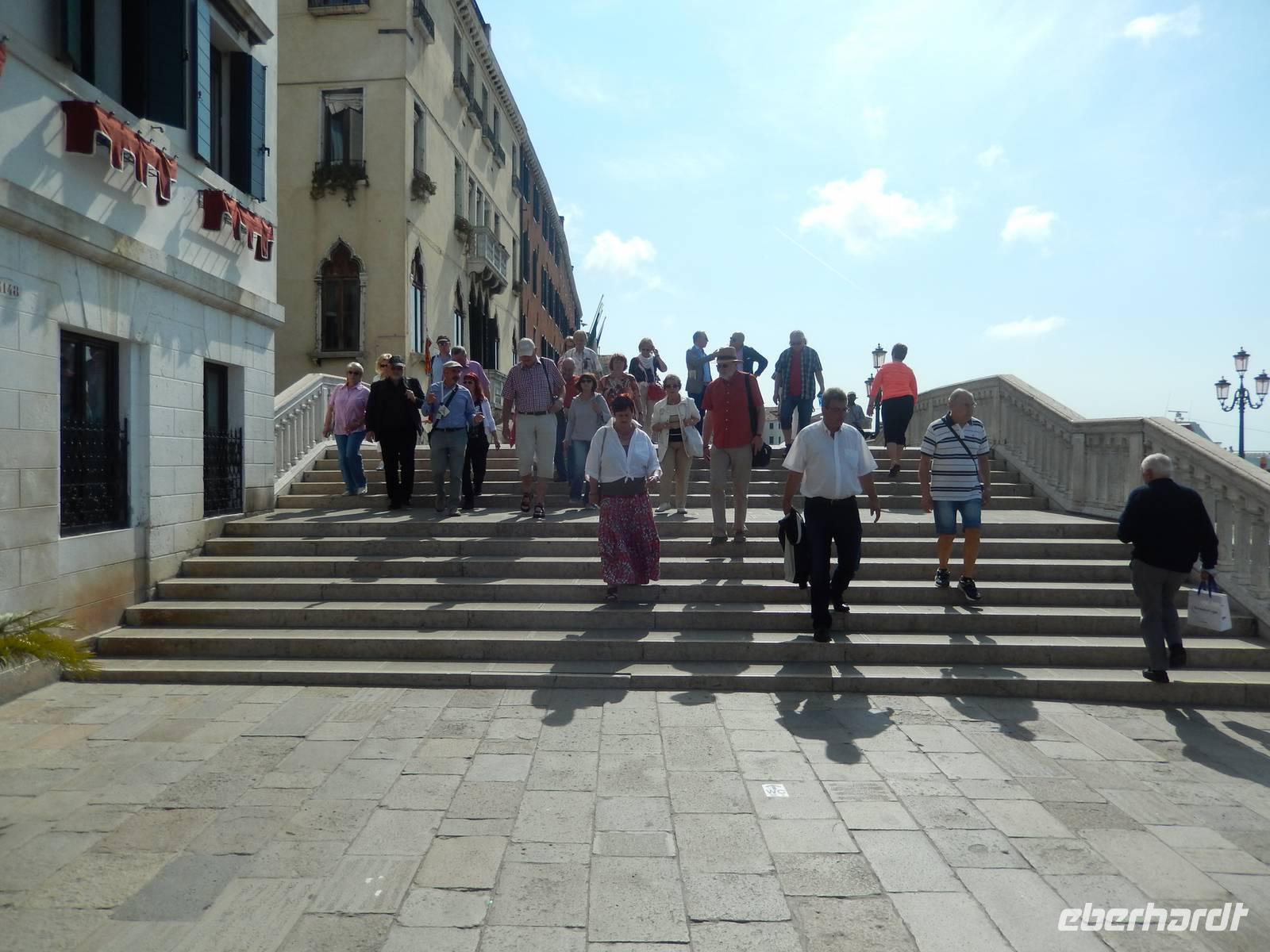 Plötzlich lag sie vor uns. Die Rialto-Brücke mit ihrer hohen Form und den vielen Geschäften darauf. Ein Tag ist nichts, ein halber, den wir mit Alessia verbringen durften, noch viel weniger, denn um Mittag füllt sich Venedig mit Unmengen von Touristen und wir hatten uns nach einem Gruppenbild vor der Brücke schon zu beeilen, um pünktlich zur gebuchten Zeit den Marcusdom besichtigen zu können. Dies sollte gleichzeitig der Abschluss von Alessias Stadtführung sein.
