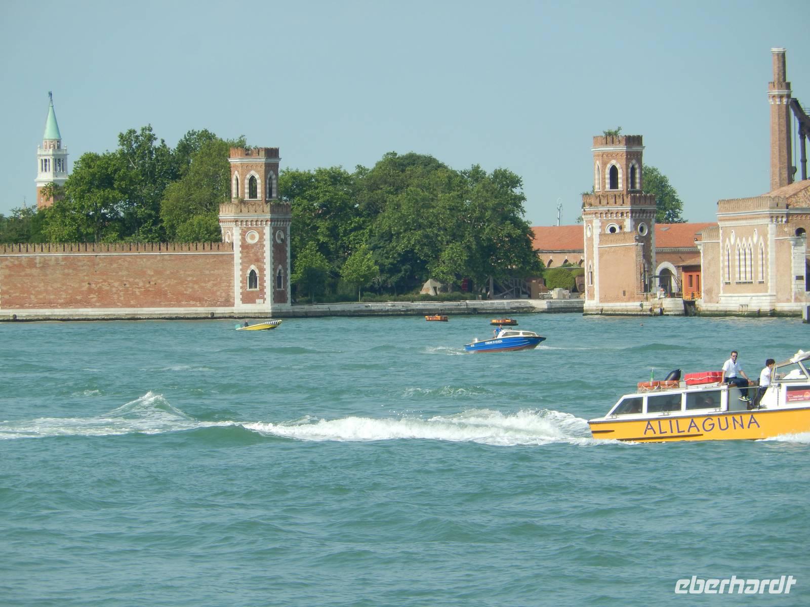 Nein, der Kapitän irrte sich nicht in der Route. Kurz vor Venedig bog er scharf nach rechts in einen der Wasserarme zwischen vielen kleinen Inseln ab, brachte uns sicher am Jachthafen und am alten Arsenal vorbei, während Gabriella uns nicht nur berichtete, dass wir vor und um uns sahen, sondern auch, wie einst aus vielen Inselchen und Schlickschichten eine der mächtigsten Städte der Vergangenheit entstand.