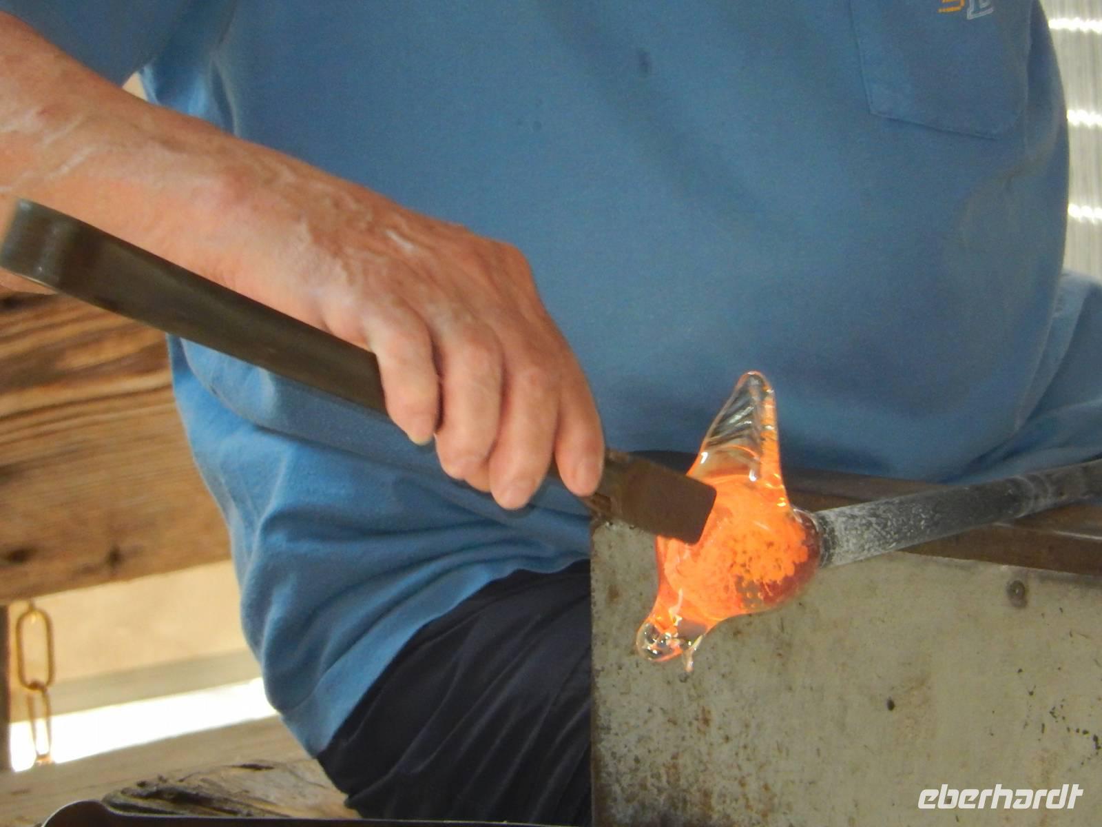Nur Minuten dauerte es, und aus einem glühenden Klumpen Glas entstand eine teils dick-, teils dünnwandige Vase, noch weniger Zeit benötigte er für einen schweren Schwan aus Glas.