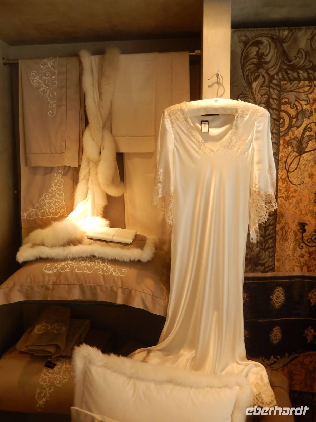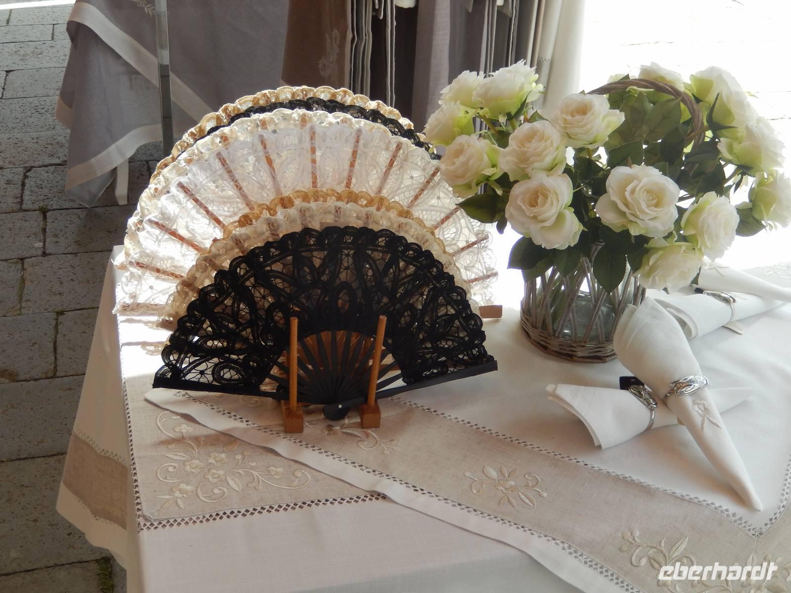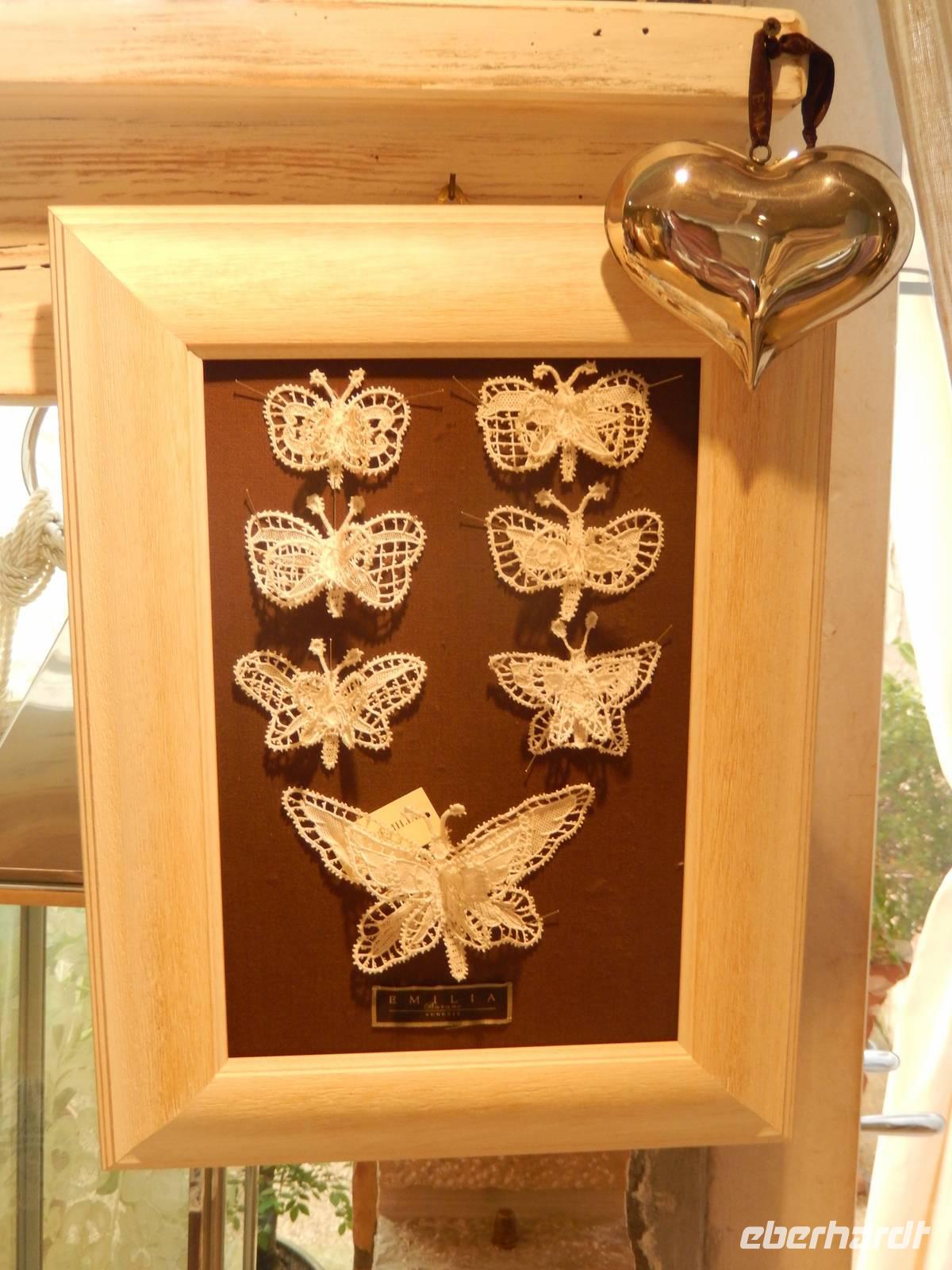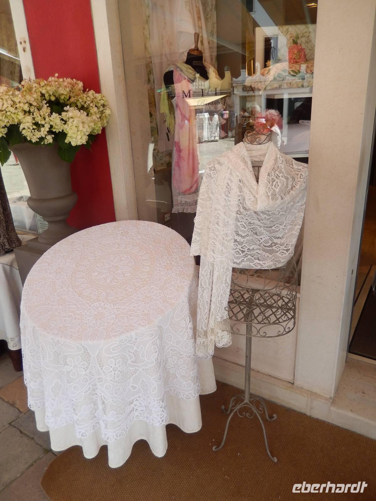 Gabriella führte uns zum Hauptplatz und gleich in ein Geschäft, in dem man nicht nur originale Spitze von Burano erwerben kann, sondern auch sieht, wie diese hergestellt wurde und heute noch wird. In einem kleinen Museum in der ersten Etage waren besonders teure und gute Stücke zu sehen und ehrfürchtig berührten wir die nicht geklöppelte, sondern genadelte Spitze der Insel. Bei guter Pflege sicher eine Wertanlage, denn Handarbeit dieser Güte, da doch drei bis fünf Frauen an einem einzigen Stück arbeiten, wird in den nächsten Jahren sicher eher teurer als billiger.