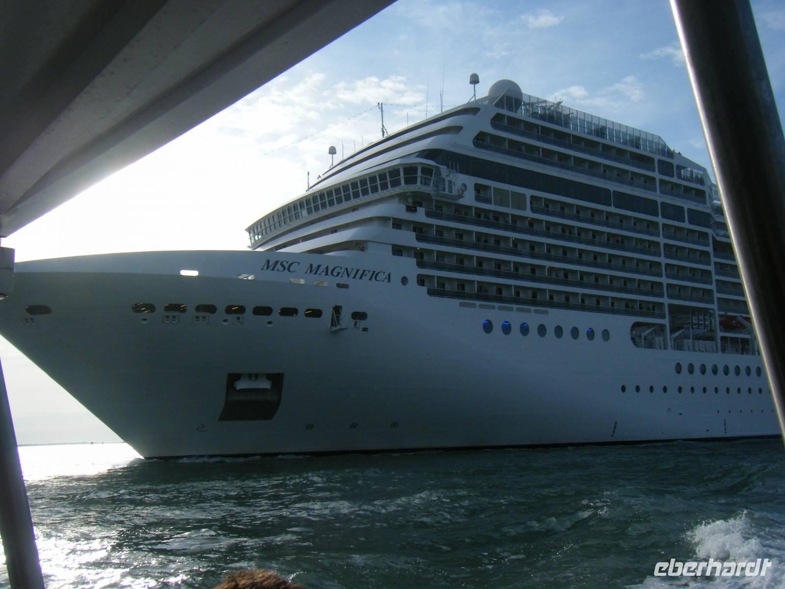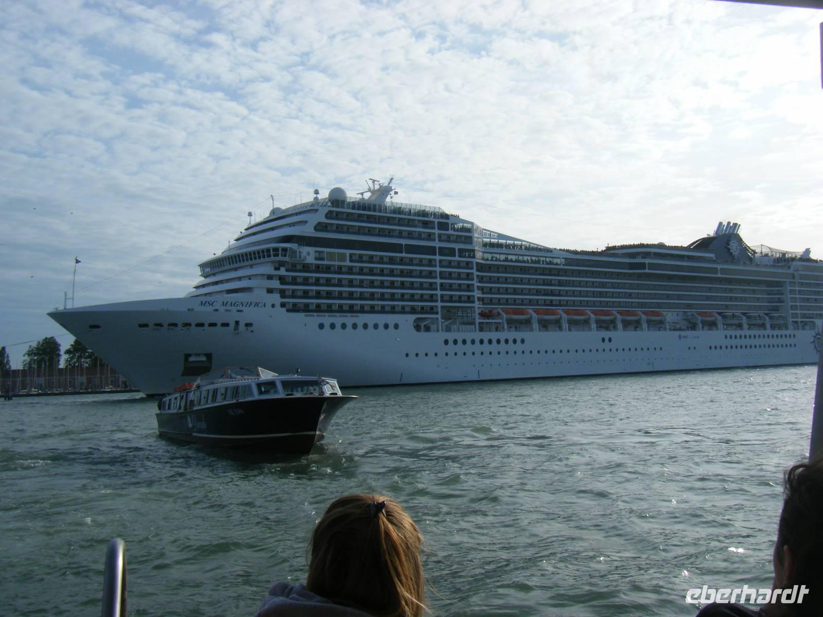 Früh am nächsten Morgen brachte uns der Bus bei angenehmem Wetter zur Punta Sabbioni, von wo aus man Venedig per Schiff erreichen kann. Laut einhelliger Meinung bietet sich bei dieser Anreise der schönste Blick auf die Stadt. Welch grandioses Bild! Die ' Serenissima' im Sonnenschein. An der Markussäule trafen wir Frau Rasin, unsere örtliche Stadtführerin für die nächsten zwei Stunden, um durch sie vor allem Historisches über ihre Heimatstadt zu erfahren. Am Nachmittag blieb noch ein wenig Zeit, um sich selbst dem Gewühl der Gassen anzuvertrauen. Auf der Heimfahrt zur Punta Sabbioni hatten wir noch ein Erlebnis der besonderen Art. Ein riesiges Kreuzfahrtschiff verließ zur gleichen Zeit den Hafen und führte uns die Probleme der Stadt hautnah vor Augen. Zufrieden kehrten wir am Abend nach Lido di Jesolo zurück.