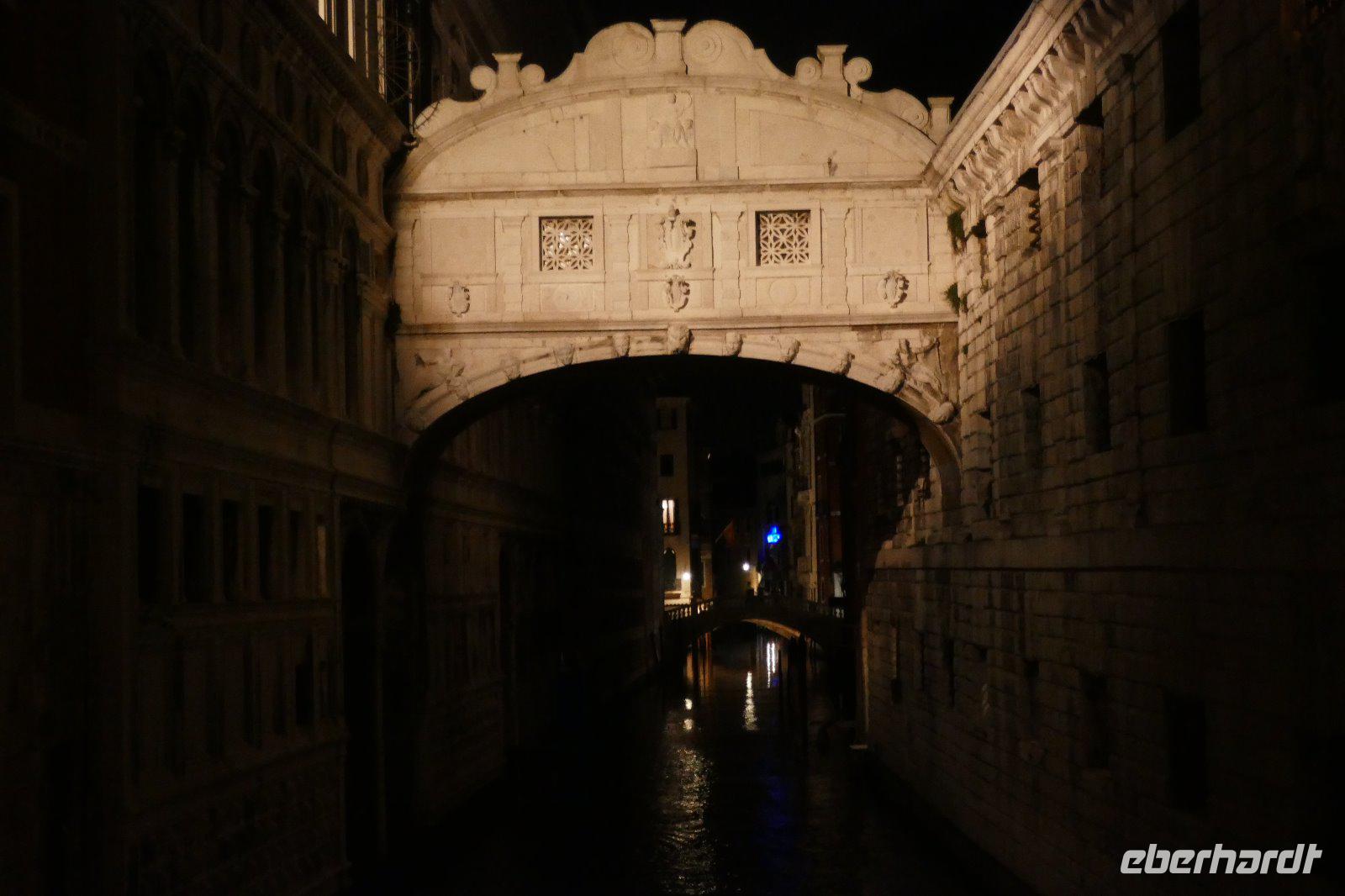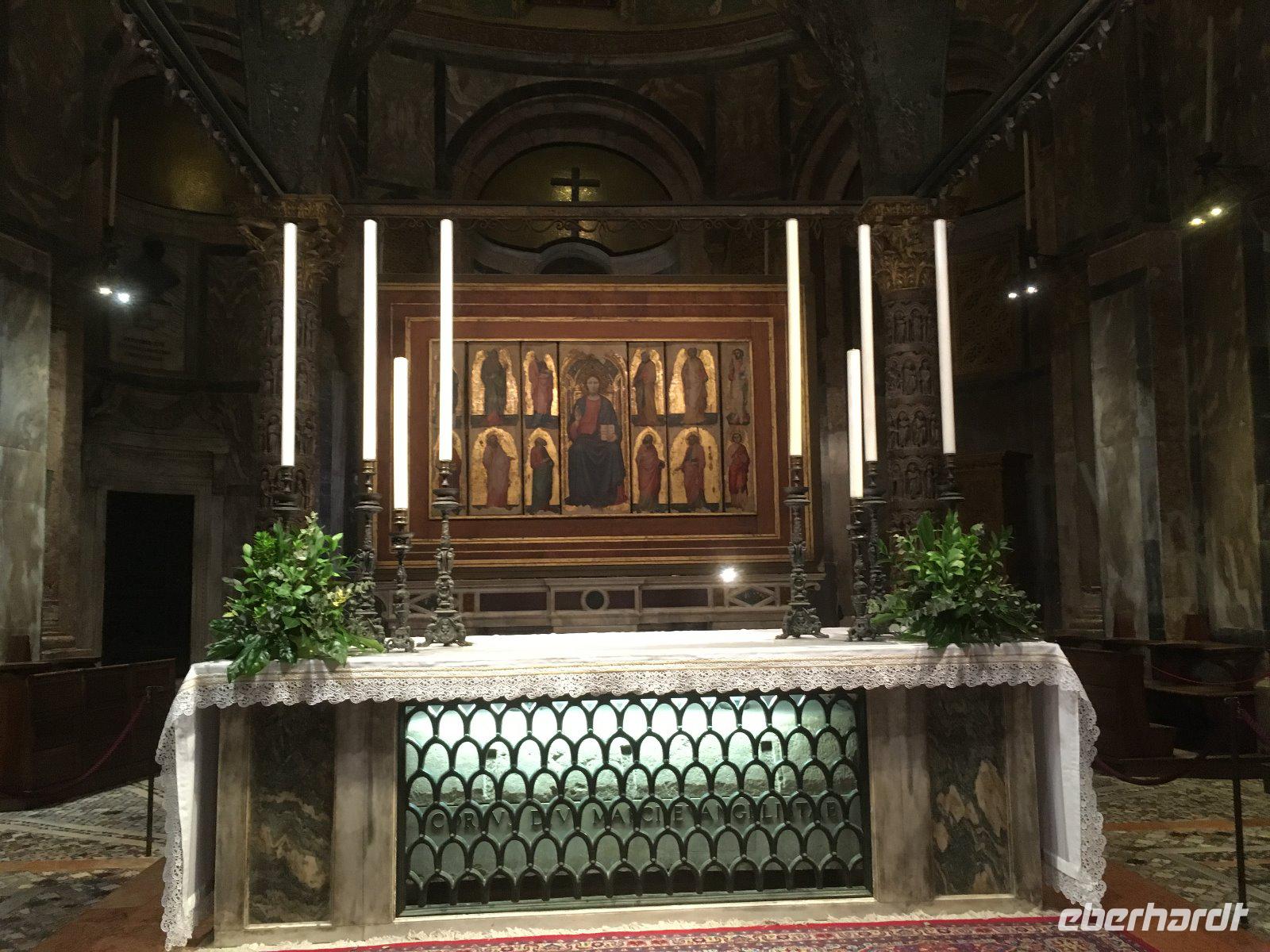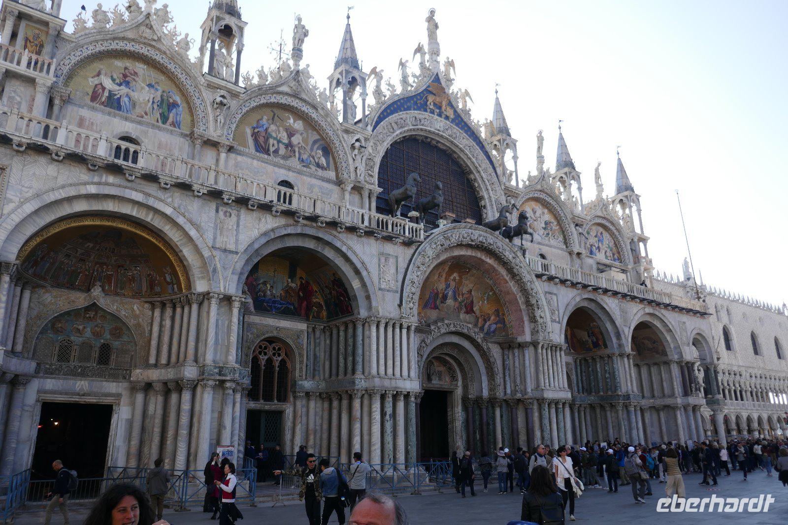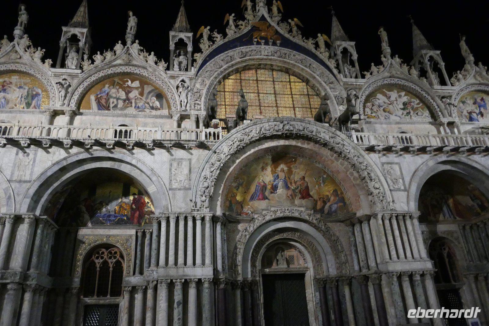 Nun aber ab ins Innere des Palastes mit seinen Staats- und Privaträumen. In ihm spiegeln sich elf Jahrhunderte der venezianischen Geschichte wieder. Glanzvolle Gemälde von Tintoretto und Paolo Veronese dokumentieren die Ausstrahlung und Anziehungskraft der einstigen Republik. Unzählig viele Brücken gibt es in Venedig - die ganze Stadt wird ja von Brücken zusammengehalten. Die meisten werden nicht beachtet. Man überquert sie und fertig. Auf dem Weg zum Gefängnis mussten wir die Seufzerbrücke überqueren. Sie ist etwas Besonderes - aufregend, geheimnisvoll und legendär. Auch wir erhaschten wie einst Casanova einen letzten Blick auf die vergitterte Freiheit. Seufzend aber nur der Erinnerung wegen. Von außen wesentlich schöner ist es bei allen Besuchern das Fotomotiv schlecht hin. So durfte dies bei uns auch nicht fehlen - alle Motive des Palastes und der Brücke im Kasten war es Zeit für die Mittagspause. Auch wenn die Einheimischen schon vormittags die typischen Kneipen um die Ecke genannt Bàcaro zur Einkehrpause nutzen, gelang uns dies erst jetzt. Vielleicht ein obligatorisch Ombrá (Glas Wein 0,1l) mit den typischen kleinen Häppchen belegt mit Stockfisch, Gorgonzola, Oliven oder so manch anderen Köstlichkeit. So gestärkt konnten wir gemeinsam noch eine kleine Erkundungstour realisieren. Vom Markusplatz aus in Richtung Teatro Fenice, dann zur Bücke Accademia und schon waren wir in einem weiteren Stadteil. Dorsoduro. Anlaufstelle hier die Gondelwerkstatt und die Kirche S. Maria degli Salute in der wir ein Meisterwerk von Tizian sahen. Zum Abschluss setzten wir mit dem Traghetto über und am Markusplatz hatte dann jeder noch Zeit bis zum Abendessen auf eigene Faust die Stadt zu erkunden und die letzten Souvenirs zu erhaschen. Unser letzter Abend mit einem Blick über die Stadt auf dem Palazzo Fondaco die Tedeschi läutet das Abendessen ein. Danach der Höhepunkt - die Besichtigung des Doms ohne von den tausenden Touristen gestört zu werden. Wenn es Nacht wird in Venedig, verebbt die Woge der Tagestouristen auf dem Canale Grande und der Lärm der Wassertaxis verstummt. Das Wasser ist in Tintenschwarz getaucht und die Gassen wirken im orangenen Schein der Straßenlampen wie in Kerzenlicht gebadet. Lediglich Wispern und leises Lachen, gedämpftes Tellerklappern und sanfte Musikfetzen wehen über die bröckelnden Fassaden. Nach einem guten Abendessen wollten wir dieses Flair nochmal genießen. Was könnte da besser sein, als eine private Führung im Markusdom. San Marco ist das bedeutendste und am reichsten ausgestattete mittelalterliche Bauwerk Venedigs. Es entstand nicht als Bischofskirche, sondern als Hauskapelle des Dogen. Der heutige Bau ist der dritte an dieser Stelle. Wir stehen vor der prunkvollen Westfassade, die sich in 5 Bogen gliedert, deren mittlerer Bogen hervortritt und das Hauptportal beherbergt. Glanzvoller Mittelpunkt der Fassade markieren die bronzenen Pferde auf der Galerie, die in Konstantinopel erbeutet wurden. Spätantik, die fast unscheinbar wirkenden Porphyrfiguren, die nach der altvenezianischen Legende Bösewichte darstellen, die den Schatz von San Marco stehlen wollten und versteinert wurden - tatsächlich stellen sie Kaiser Diokletian und seine Mitregenten Valerius, Maximian und Constantius dar. Die enge Verbindung Venedigs mit Byzanz bewirkte, dass die zu den Bauarbeiten herangezogenen Künstler vor allem nach byzantinischen Vorbildern arbeiteten. Kein Wunder, dass der Grundriss in Form eines griechischen Kreuzes erfolgt und sehr stark an die Apostelkirche in Byzanz angelehnt ist. Als wir den Innenraum betraten im mäßigen Schein einiger Leuchten. Wir setzten uns auf die Stühle und dann folgte ein Lichterschauspiel. Nach und nach gingen die Deckenleuchten an und setzte die Schönheit der Mosaike, die jetzt voll erleuchtet waren frei. Für uns als Betrachter ein reines Fest für die Augen. Normalerweise wird dem Boden nur wenig Beachtung geschenkt. Hier besticht dieser durch die teppichartigen Mosaike aus einer Vielzahl von Marmorstückchen. Bei über 4240 m² gibt es viel zu erzählen über die dargestellten Geschichten. Ergänzt wird der Innenschmuck durch eine Vielzahl von Skulpturen namhafter Künstler. Das bekannteste Werk aber ist wohl der Pala d'Oro - ein heterogenes Werk, in dem byzantinische, romanische und gotische Teile ein harmonisches Ganzes bilden, obwohl es in vier Phasen über 4 Jahrhunderte entstand. Abschluss bildet der Besuch der Krypta. Diese Geschichte beginnt im Jahr 828 mit dem Diebstahl einiger Knochen unter Zuhilfenahme von Schweinespeck. Viele Jahre war sie nicht zugänglich, da sie unter Wasser stand. Fast 1600 Jahre später kann diese nun wieder dank Einsatz von Kunststoffschaum und Lösungen wieder besichtigt werden. Eine kleine Treppe führt hinunter zur Krypta unterhalb des Presbyteriums. Die Decke besteht aus Kreuzgewölben, die von griechischen und byzantinischen Säulen getragen werden. Hier wurde im Jahre 1094 der Leichnam des hl. Markus niedergelegt. Mit diesen Eindrücken beendeten wir den heutigen Tag und kehrten mit vielen schönen Eindrücken zum Hotel zurück.
