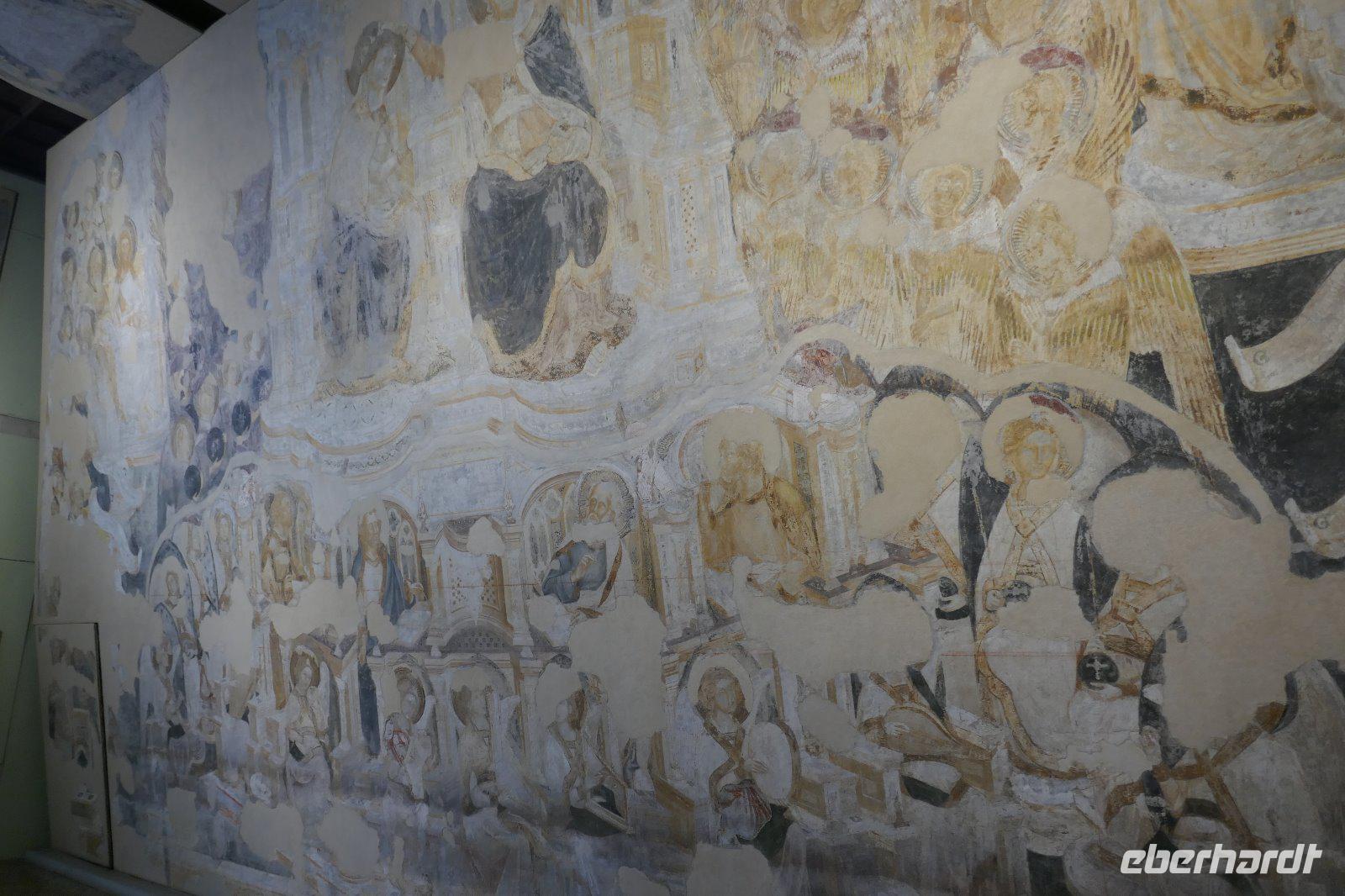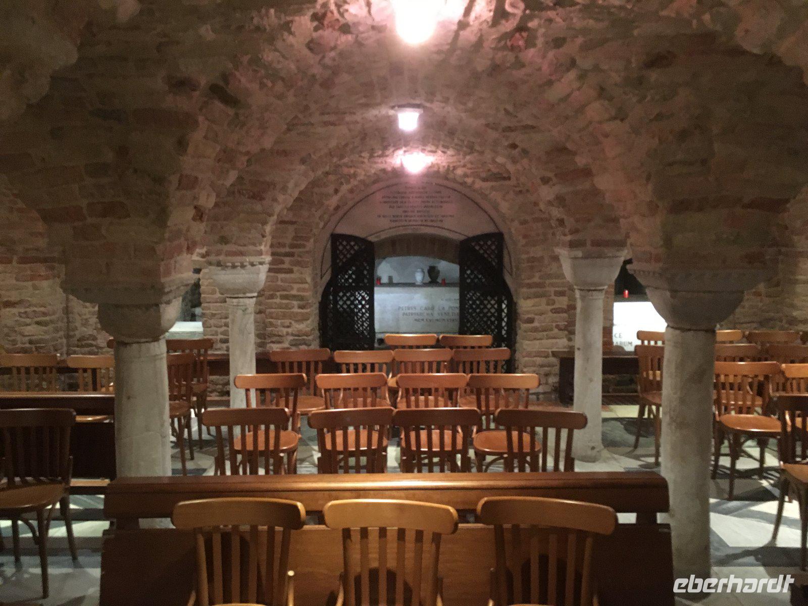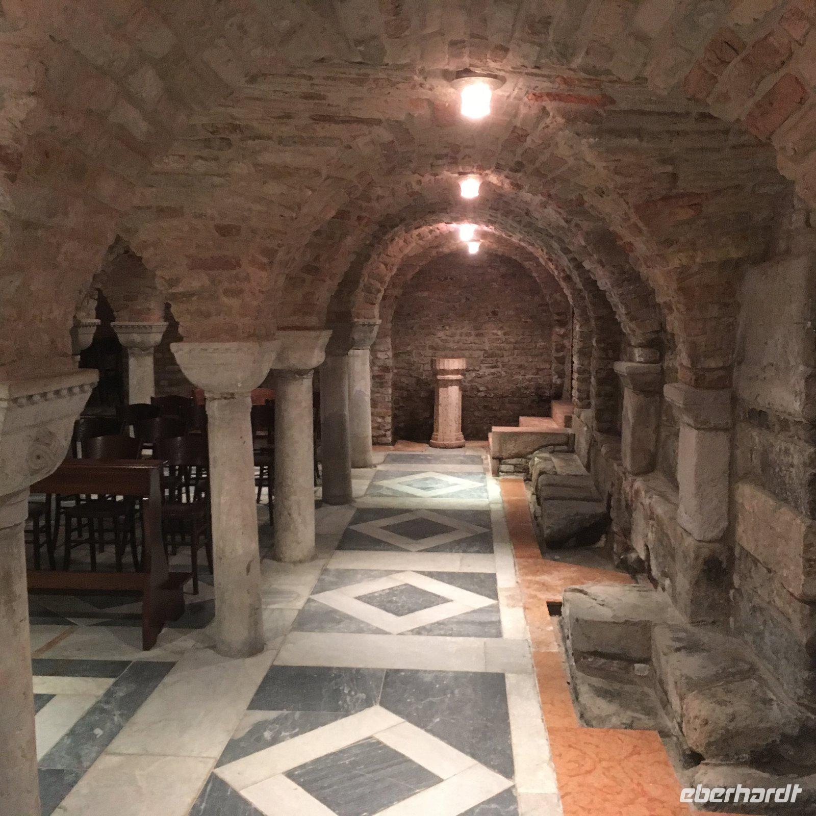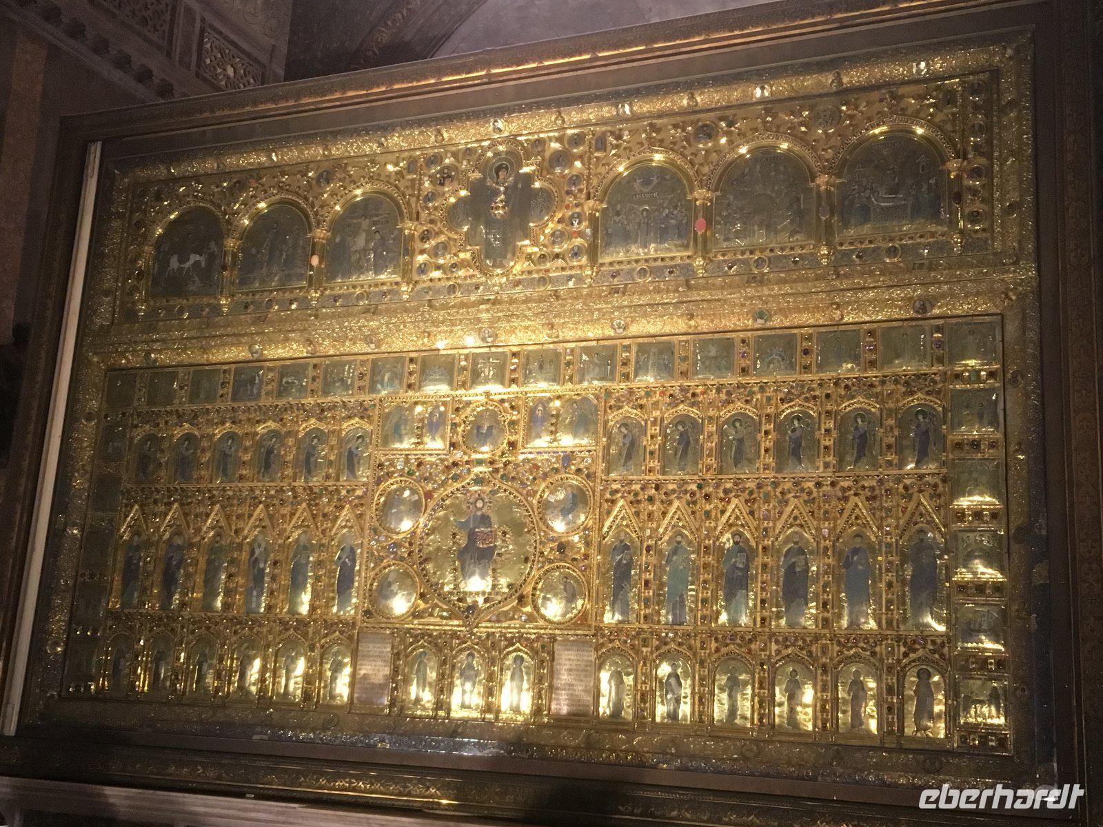 Nun aber ab ins Innere des Palastes mit seinen Staats- und Privaträumen. In ihm spiegeln sich elf Jahrhunderte der venezianischen Geschichte wieder. Glanzvolle Gemälde von Tintoretto und Paolo Veronese dokumentieren die Ausstrahlung und Anziehungskraft der einstigen Republik. Unzählig viele Brücken gibt es in Venedig - die ganze Stadt wird ja von Brücken zusammengehalten. Die meisten werden nicht beachtet. Man überquert sie und fertig. Auf dem Weg zum Gefängnis mussten wir die Seufzerbrücke überqueren. Sie ist etwas Besonderes - aufregend, geheimnisvoll und legendär. Auch wir erhaschten wie einst Casanova einen letzten Blick auf die vergitterte Freiheit. Seufzend aber nur der Erinnerung wegen. Von außen wesentlich schöner ist es bei allen Besuchern das Fotomotiv schlecht hin. So durfte dies bei uns auch nicht fehlen - alle Motive des Palastes und der Brücke im Kasten war es Zeit für die Mittagspause. Auch wenn die Einheimischen schon vormittags die typischen Kneipen um die Ecke genannt Bàcaro zur Einkehrpause nutzen, gelang uns dies erst jetzt. Vielleicht ein obligatorisch Ombrá (Glas Wein 0,1l) mit den typischen kleinen Häppchen belegt mit Stockfisch, Gorgonzola, Oliven oder so manch anderen Köstlichkeit. So gestärkt konnten wir gemeinsam noch eine kleine Erkundungstour realisieren. Vom Markusplatz aus in Richtung Teatro Fenice, dann zur Bücke Accademia und schon waren wir in einem weiteren Stadteil. Dorsoduro. Anlaufstelle hier die Gondelwerkstatt und die Kirche S. Maria degli Salute in der wir ein Meisterwerk von Tizian sahen. Zum Abschluss setzten wir mit dem Traghetto über und am Markusplatz hatte dann jeder noch Zeit bis zum Abendessen auf eigene Faust die Stadt zu erkunden und die letzten Souvenirs zu erhaschen. Unser letzter Abend mit einem Blick über die Stadt auf dem Palazzo Fondaco die Tedeschi läutet das Abendessen ein. Danach der Höhepunkt - die Besichtigung des Doms ohne von den tausenden Touristen gestört zu werden. Wenn es Nacht wird in Venedig, verebbt die Woge der Tagestouristen auf dem Canale Grande und der Lärm der Wassertaxis verstummt. Das Wasser ist in Tintenschwarz getaucht und die Gassen wirken im orangenen Schein der Straßenlampen wie in Kerzenlicht gebadet. Lediglich Wispern und leises Lachen, gedämpftes Tellerklappern und sanfte Musikfetzen wehen über die bröckelnden Fassaden. Nach einem guten Abendessen wollten wir dieses Flair nochmal genießen. Was könnte da besser sein, als eine private Führung im Markusdom. San Marco ist das bedeutendste und am reichsten ausgestattete mittelalterliche Bauwerk Venedigs. Es entstand nicht als Bischofskirche, sondern als Hauskapelle des Dogen. Der heutige Bau ist der dritte an dieser Stelle. Wir stehen vor der prunkvollen Westfassade, die sich in 5 Bogen gliedert, deren mittlerer Bogen hervortritt und das Hauptportal beherbergt. Glanzvoller Mittelpunkt der Fassade markieren die bronzenen Pferde auf der Galerie, die in Konstantinopel erbeutet wurden. Spätantik, die fast unscheinbar wirkenden Porphyrfiguren, die nach der altvenezianischen Legende Bösewichte darstellen, die den Schatz von San Marco stehlen wollten und versteinert wurden - tatsächlich stellen sie Kaiser Diokletian und seine Mitregenten Valerius, Maximian und Constantius dar. Die enge Verbindung Venedigs mit Byzanz bewirkte, dass die zu den Bauarbeiten herangezogenen Künstler vor allem nach byzantinischen Vorbildern arbeiteten. Kein Wunder, dass der Grundriss in Form eines griechischen Kreuzes erfolgt und sehr stark an die Apostelkirche in Byzanz angelehnt ist. Als wir den Innenraum betraten im mäßigen Schein einiger Leuchten. Wir setzten uns auf die Stühle und dann folgte ein Lichterschauspiel. Nach und nach gingen die Deckenleuchten an und setzte die Schönheit der Mosaike, die jetzt voll erleuchtet waren frei. Für uns als Betrachter ein reines Fest für die Augen. Normalerweise wird dem Boden nur wenig Beachtung geschenkt. Hier besticht dieser durch die teppichartigen Mosaike aus einer Vielzahl von Marmorstückchen. Bei über 4240 m² gibt es viel zu erzählen über die dargestellten Geschichten. Ergänzt wird der Innenschmuck durch eine Vielzahl von Skulpturen namhafter Künstler. Das bekannteste Werk aber ist wohl der Pala d'Oro - ein heterogenes Werk, in dem byzantinische, romanische und gotische Teile ein harmonisches Ganzes bilden, obwohl es in vier Phasen über 4 Jahrhunderte entstand. Abschluss bildet der Besuch der Krypta. Diese Geschichte beginnt im Jahr 828 mit dem Diebstahl einiger Knochen unter Zuhilfenahme von Schweinespeck. Viele Jahre war sie nicht zugänglich, da sie unter Wasser stand. Fast 1600 Jahre später kann diese nun wieder dank Einsatz von Kunststoffschaum und Lösungen wieder besichtigt werden. Eine kleine Treppe führt hinunter zur Krypta unterhalb des Presbyteriums. Die Decke besteht aus Kreuzgewölben, die von griechischen und byzantinischen Säulen getragen werden. Hier wurde im Jahre 1094 der Leichnam des hl. Markus niedergelegt. Mit diesen Eindrücken beendeten wir den heutigen Tag und kehrten mit vielen schönen Eindrücken zum Hotel zurück.