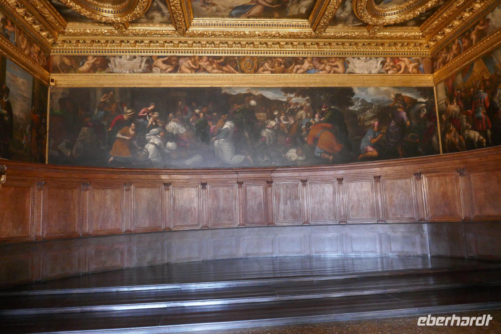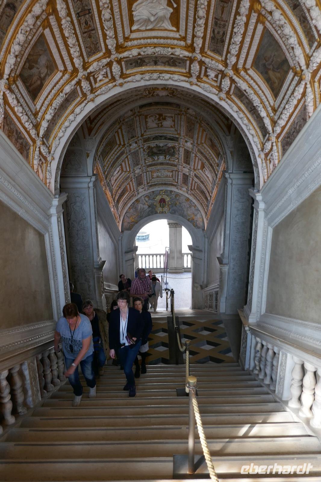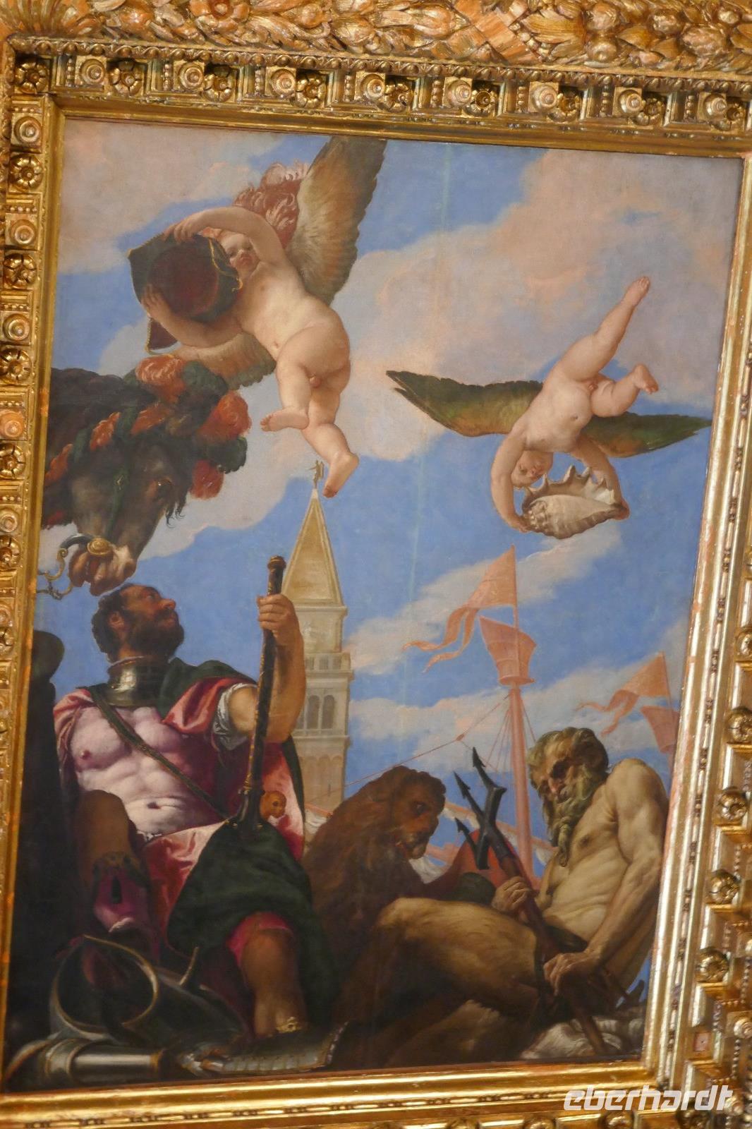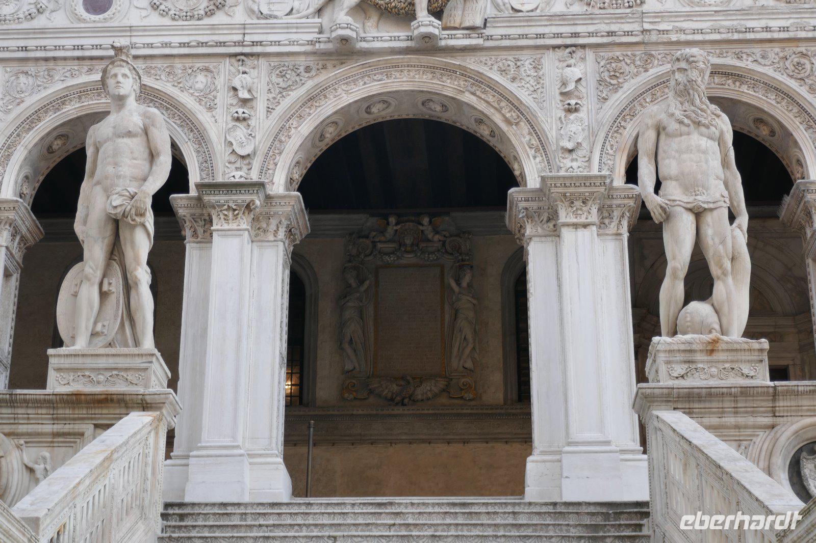 Einst betraten die Venezianer das Gebäude über die Porta della Carta - Prunktor an der Piazetta, das wörtlich übersetzt eigentlich Papiertür heißt. Nicht ohne Grund, denn hier übergaben die Bürger als Bittsteller ihre Petitionen an die Ratsmitglieder und erlassene Gesetze wurden an dieser Stelle verlesen. Beeindruckend die Reliefs des Dogen mit dem venezianischen Löwen, umgeben von den personifizierten Tugenden Besonnenheit, Tapferkeit, Gerechtigkeit u. Barmherzigkeit. Wir jedoch betraten den Palast von der Seite. Im Innenhof an den Stufen der Scala dei Giganti hörten wir, dass hier einst der Doge nach althergebrachtem Ritus mit der Dogenmütze gekrönt wurde. Am Ende thronen Mars u. Neptun in Form von gigantischen Statuen - Zeichen einer großen Kriegs- und Seemacht jener Zeit.