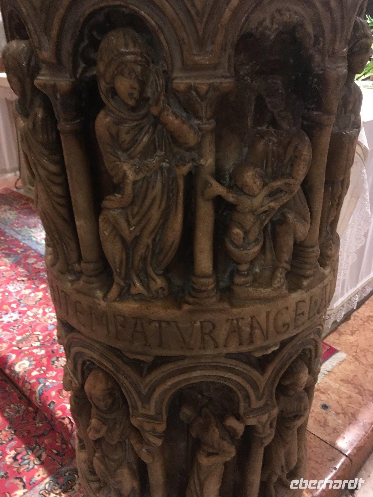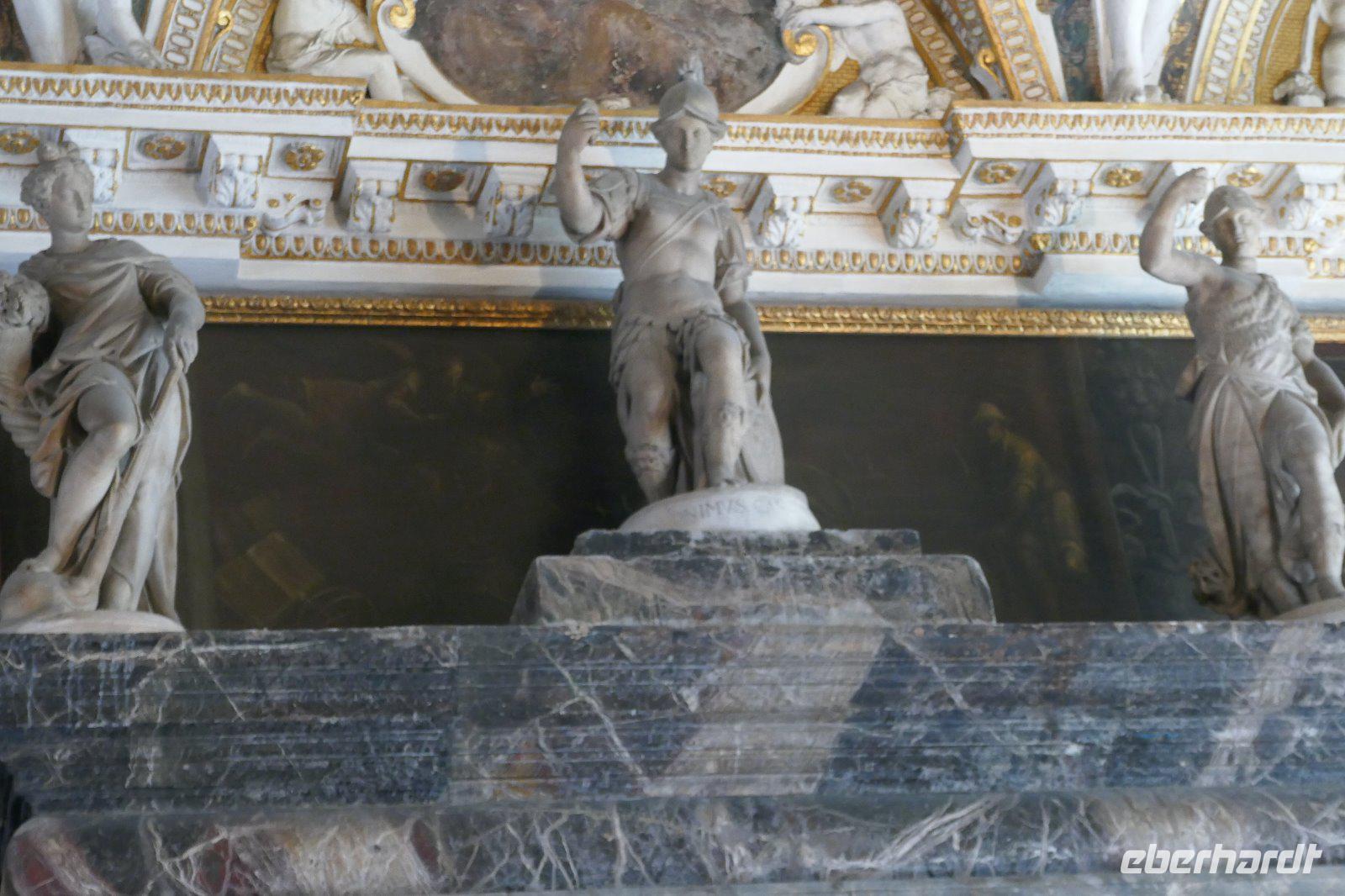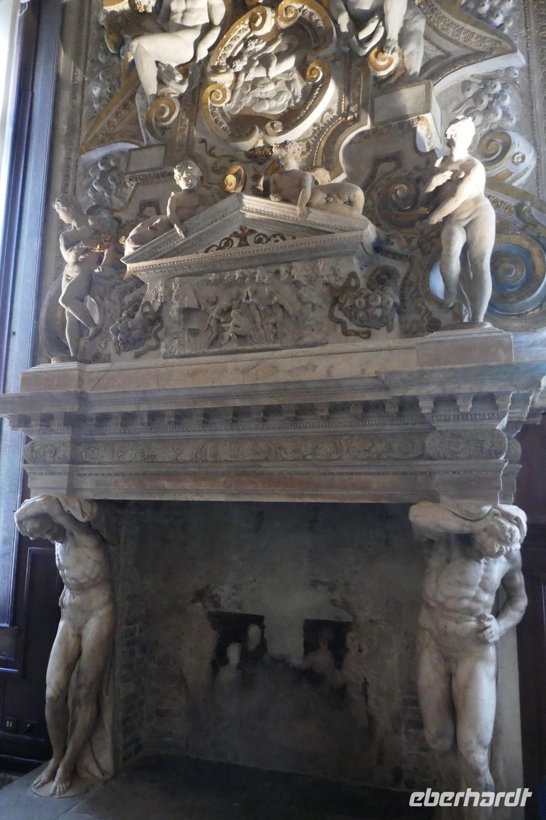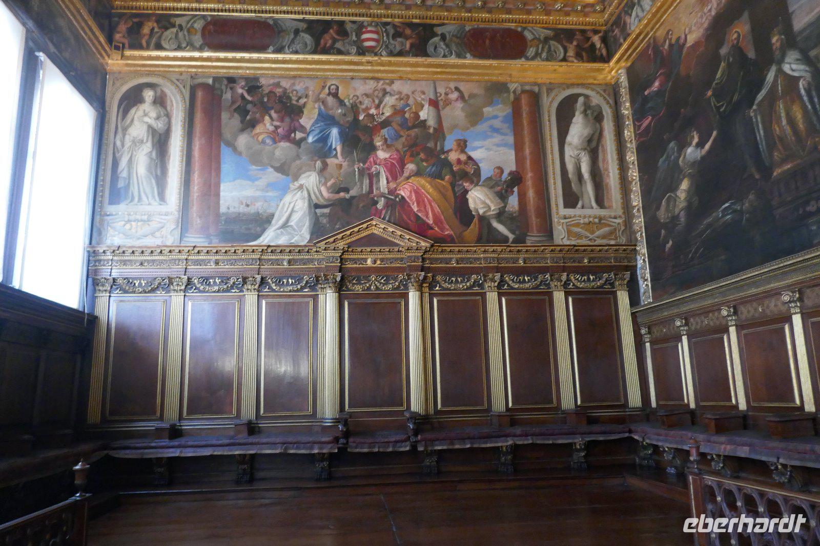 Einst betraten die Venezianer das Gebäude über die Porta della Carta - Prunktor an der Piazetta, das wörtlich übersetzt eigentlich Papiertür heißt. Nicht ohne Grund, denn hier übergaben die Bürger als Bittsteller ihre Petitionen an die Ratsmitglieder und erlassene Gesetze wurden an dieser Stelle verlesen. Beeindruckend die Reliefs des Dogen mit dem venezianischen Löwen, umgeben von den personifizierten Tugenden Besonnenheit, Tapferkeit, Gerechtigkeit u. Barmherzigkeit. Wir jedoch betraten den Palast von der Seite. Im Innenhof an den Stufen der Scala dei Giganti hörten wir, dass hier einst der Doge nach althergebrachtem Ritus mit der Dogenmütze gekrönt wurde. Am Ende thronen Mars u. Neptun in Form von gigantischen Statuen - Zeichen einer großen Kriegs- und Seemacht jener Zeit.